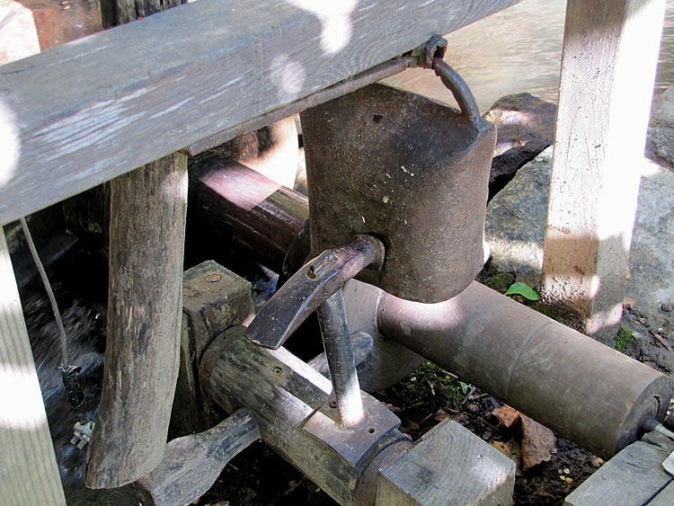 Ich schätze mal das ganze ist an einem Wasserrad montiert. Die Scheibe, die noch hinter der "Glocke" zu sehen ist, muss wohl einen kleinen Mitnehmer haben, der über den Zapfen den Hammer auslöst und dieser muss auch wieder in die Ausgangsposition zurückfallen. Wenn das ganze mal in Betrieb ist, wird es einem wohl ziemlich auf den Geist gehen, also hat es sicher keinen unterhaltsamen Hintergrund. Es muss also schon irgendwie eine wichtige Funktion haben.