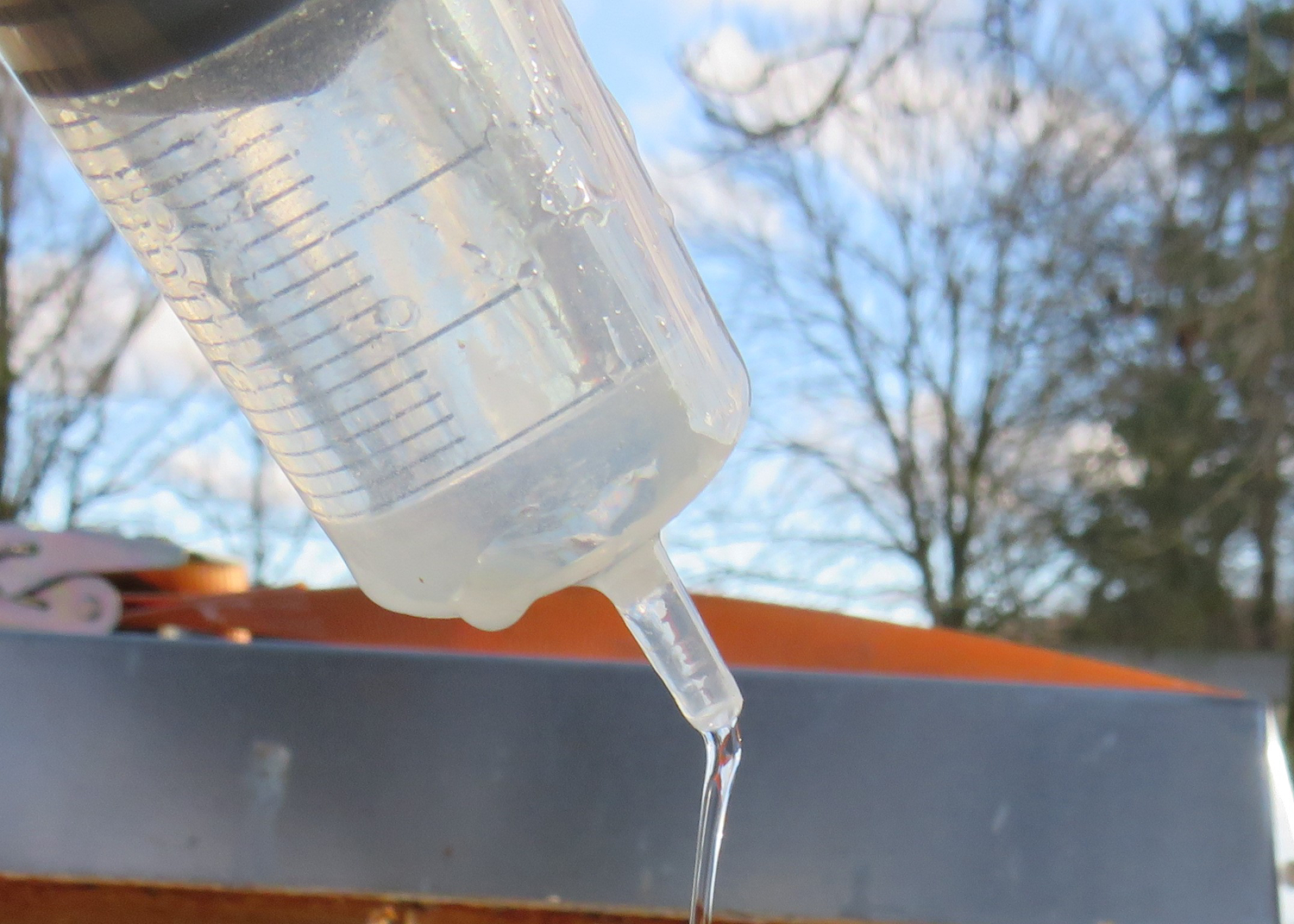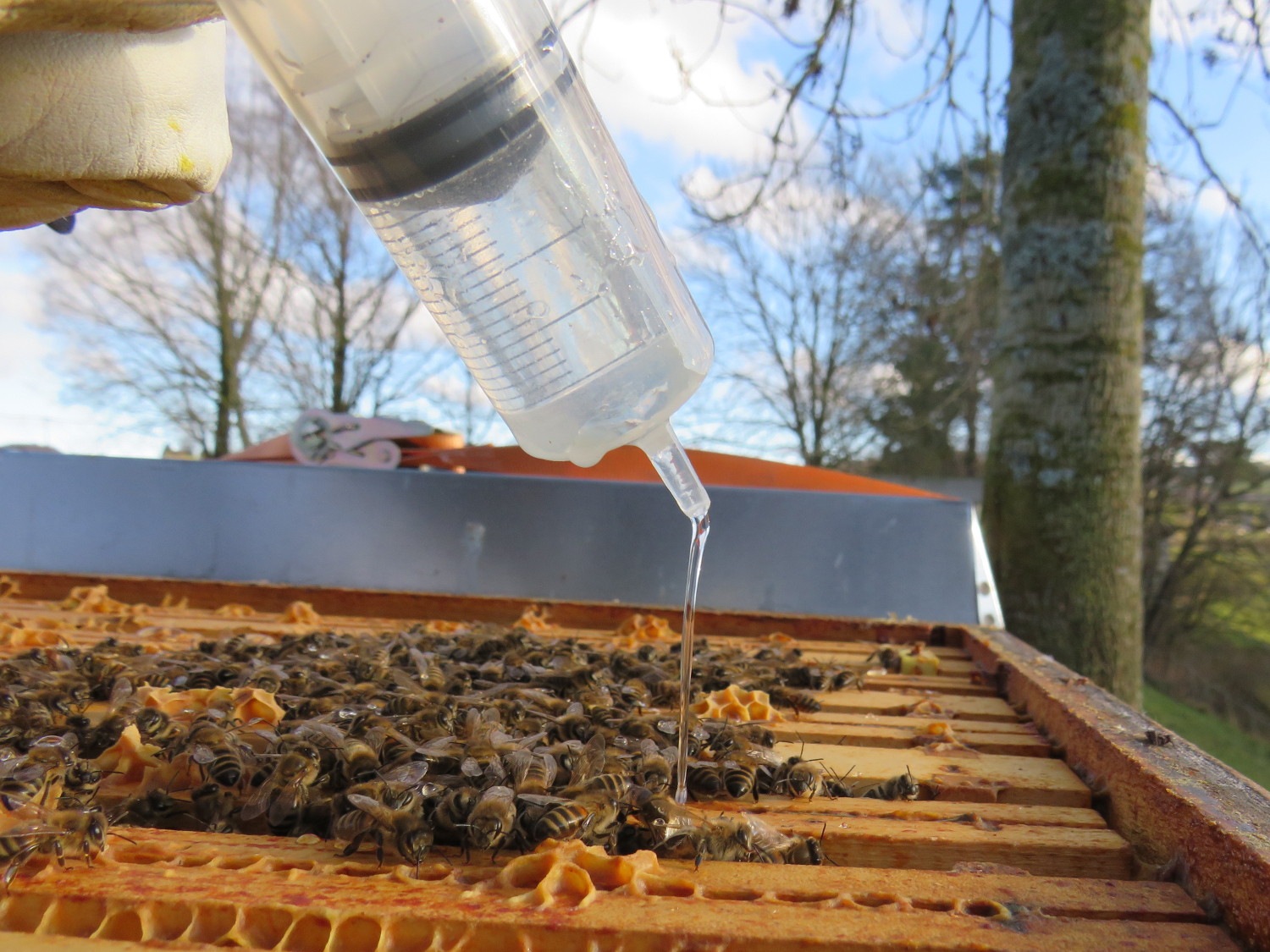 Gemeint war die sogenannte "Winterbehandlung" der Honigbiene gegen die Varroa-Milbe. Im Bild zu sehen ist, wie ein Imkerkollege Oxalsäure-Zuckerwasserlösung in die Wabengassen, dierekt auf unsere Bienen "träufelt". Für die Behandlung muss es zwischen 3° und 10° kalt sein und die Bienenvölker müssen (nach den ersten Frostnächten) im brutfreien Zustand sein. Die Lösung tötet die letzten verbliebenen Milben weitgehend ab. Man darf aber auch die Bienen pro Winter und Volk nur ein Mal behandeln. Die Bienenschlecken das Zuckerwasser teilweise auf und bei Mehrfachbehandlung kann es auch bei den Bienen zu Verlusten kommen.