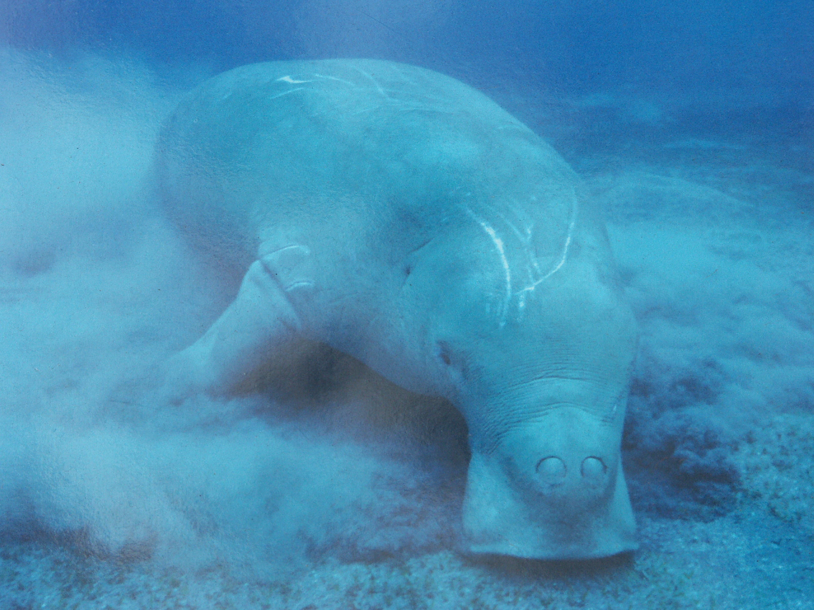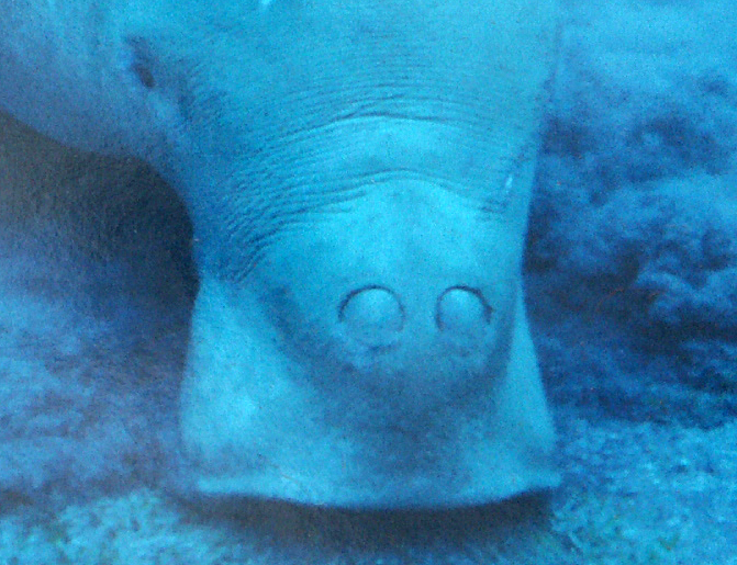 Reber hat es gelöst: Es ist ein Dugong, fotografiert an der Shark Bay in Westaustralien. Wir sind damals (2006) mit einem Segel-Katamaran rausgefahren, zwischen dessen Rümpfen ein Netz gespannt war.