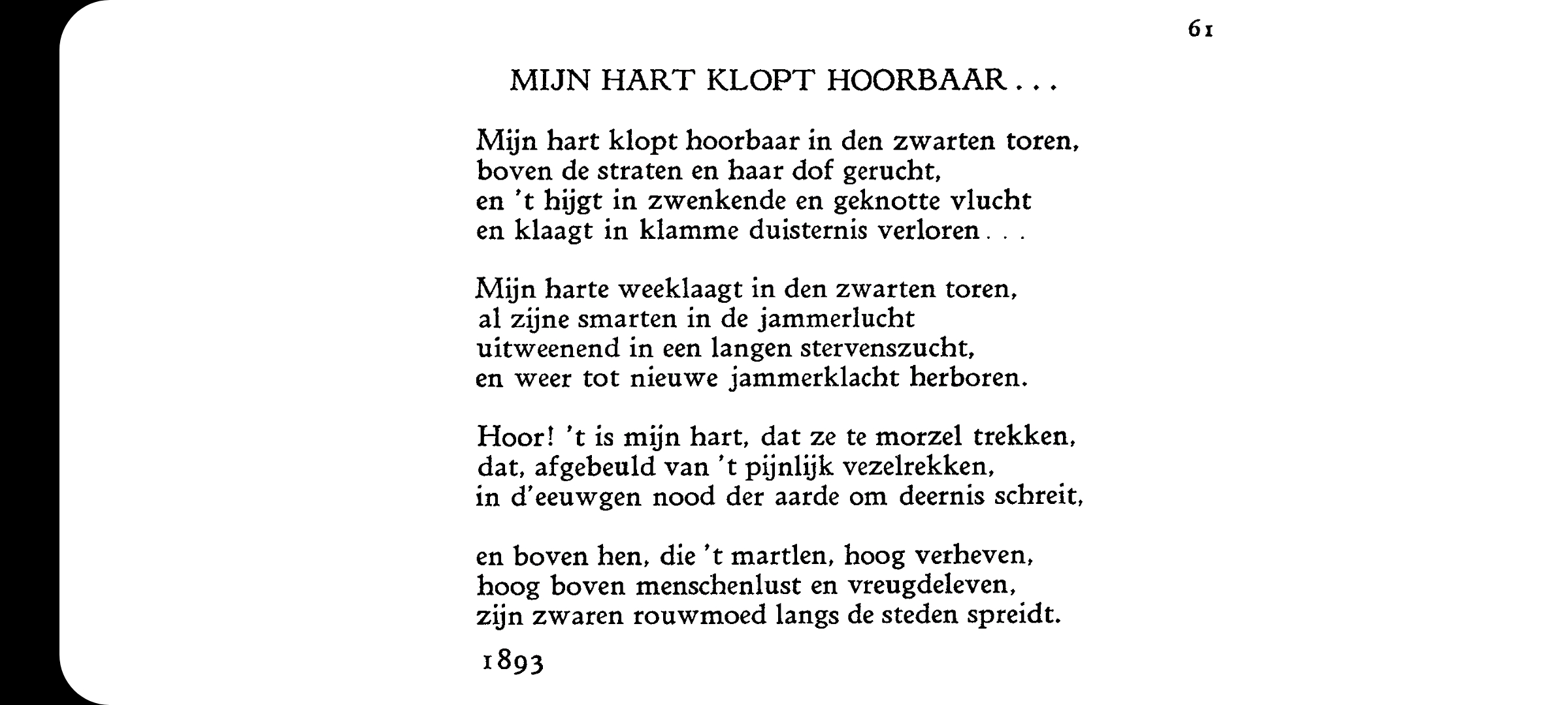 Mijn hart klopt hoorbaar in den zwarten toren,