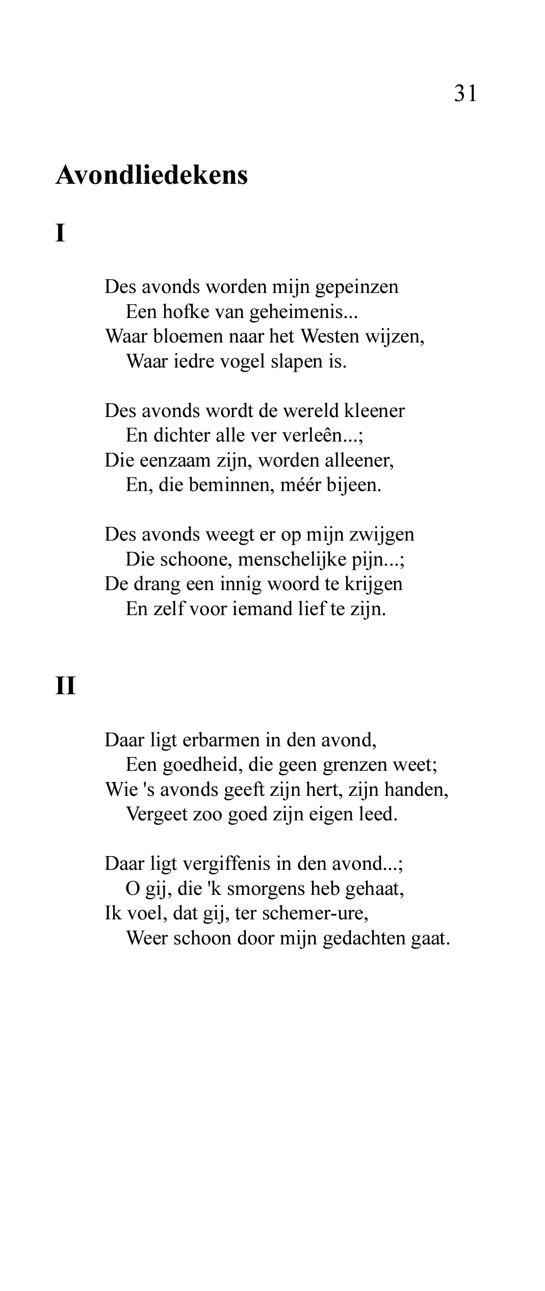 She wrote the poem "Avondliedekens" for her second bundel, "Op zachte vooizekens", published in 1921.