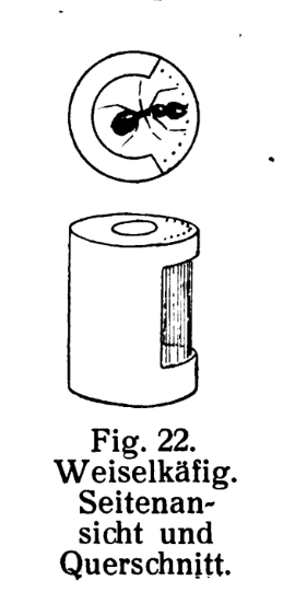Er konstruierte sogar einen "Weiselkäfig", bestehend aus einem ausgehöhlten Flaschenkorken und dünnen Präparationsnadeln (als Gitter). Dieser Käfig wurde dann in die jeweils andere Kolonie gegeben, um die Ameisen langsam aneinander zu gewöhnen.