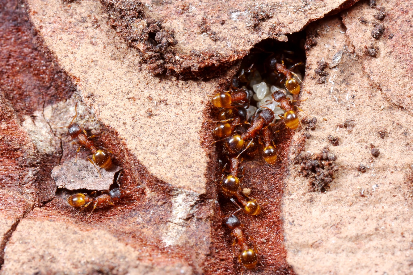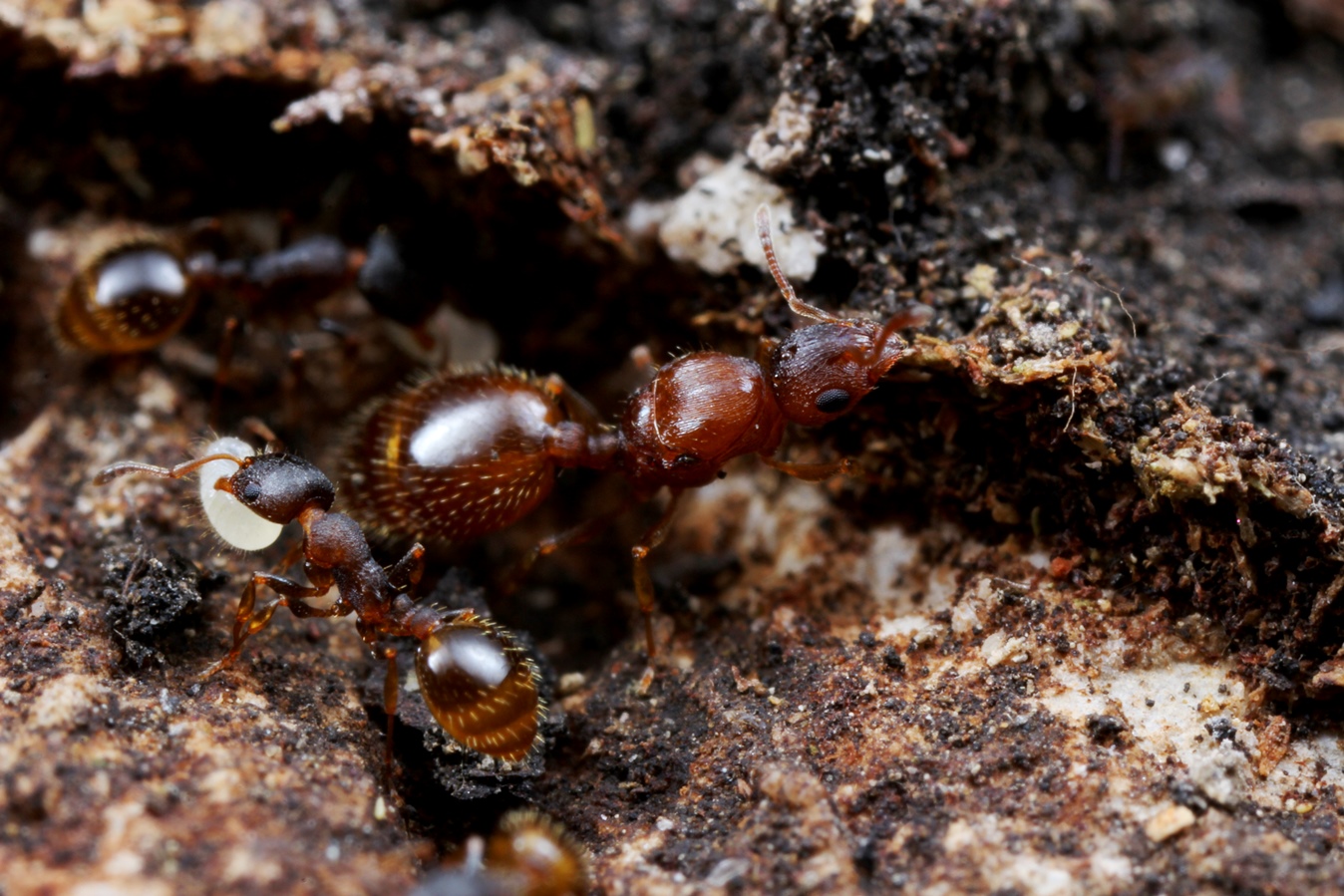 Temnothorax sordidulus, Arbeiterin mit Königin in einem Nest zwischen Steinplatten