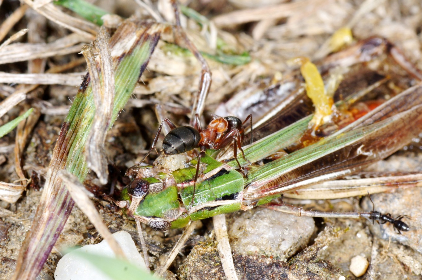 Formica rufibarbis beansprucht die Beute, eine kleine Tapinoma sp. ist damit nicht einverstanden