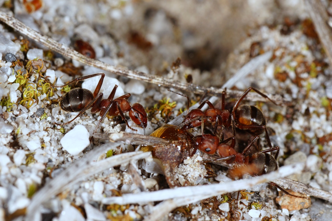 Ja, sie gibt es auch noch: Die Amazonenameise Polyergus rufescens. Zum zweiten Mal in Folge nach 2018 sehr wenig weibl. Geschlechtstiere (der Mai war zu kalt, offenbar fehlt dann hochwertige Protein-Nahrung)