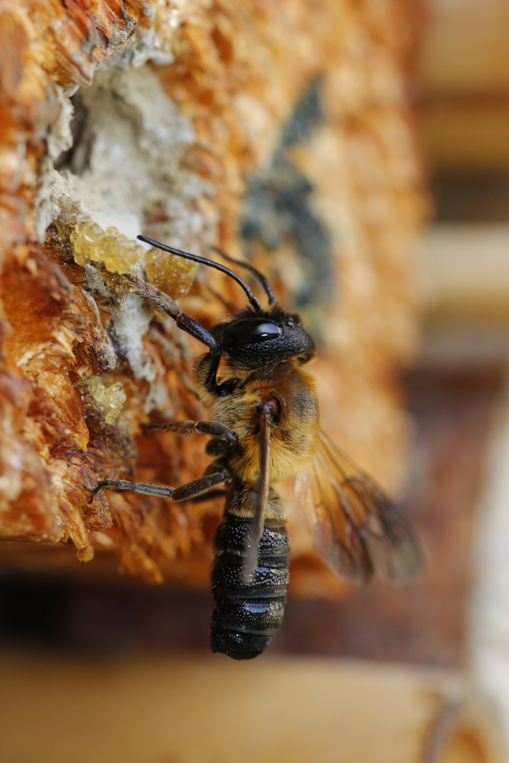 Ich beobachte die Bienenart jetzt das dritte Jahr, nach dem Wetter-Katastrophenjahr 2023 habe ich mir für 2024 nicht viel erwartet. Tatsächlich hatte ich in meinem Insektenhotel Anfang September immerhin 21 äußerlich versiegelte Wohnröhren. Die jetzigen Erfahrungen haben mich belehrt: Trotz der Länge der Wohnröhren von 10 cm in Holz und etwa 15-17cm langen Bambusröhren, wird offenbar in den meisten Wohnröhren nur eine od. viell. eine zweite Brutzelle im hinteren Bereich angelegt. Warum die Bienen hier so "zurückhaltend" sind, weiß ich noch nicht. M. sculpturalis ist ein Neozon aus Ostasien stammend, dem starke Vermehrung und invasives Potential zugeschrieben werden.