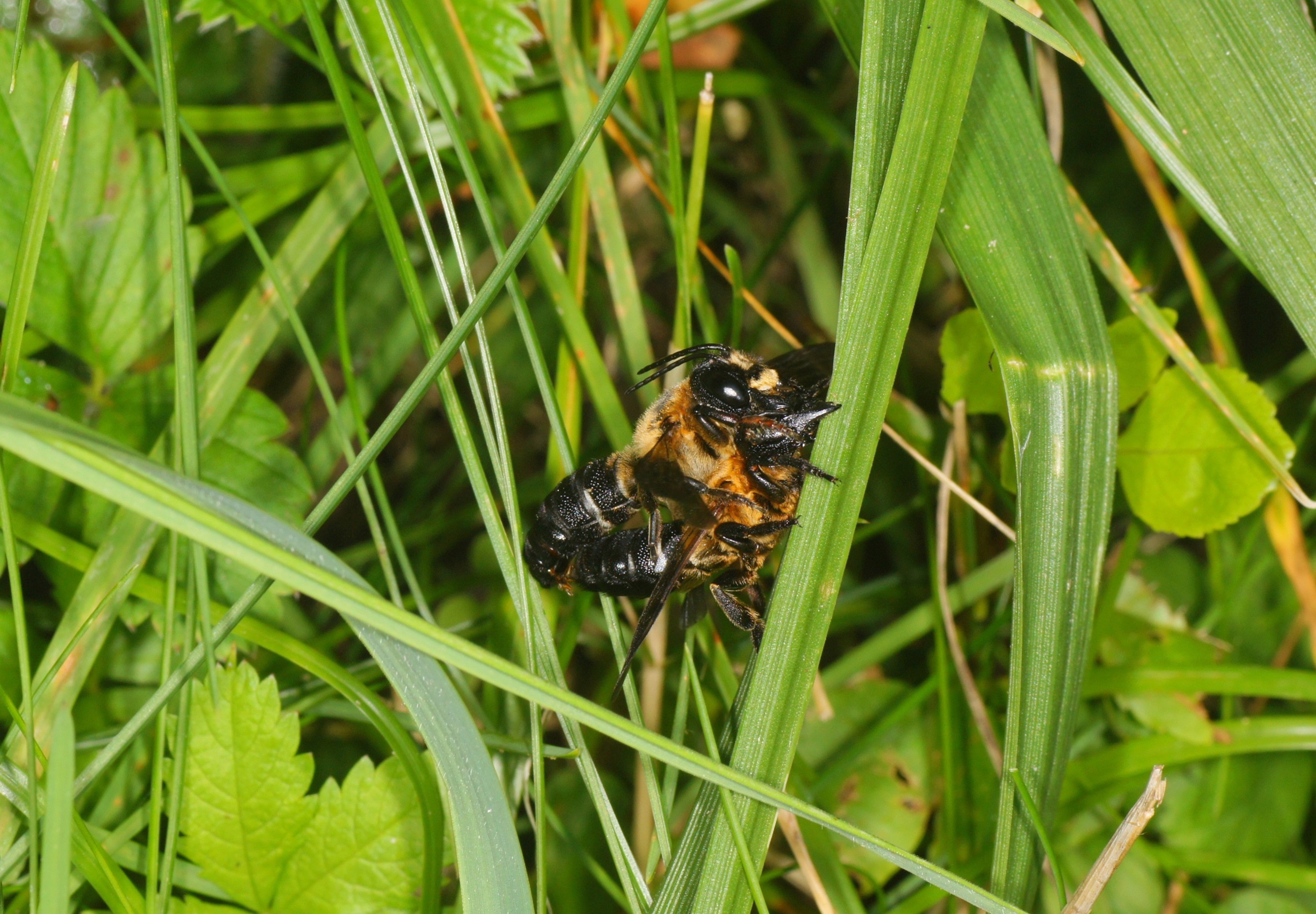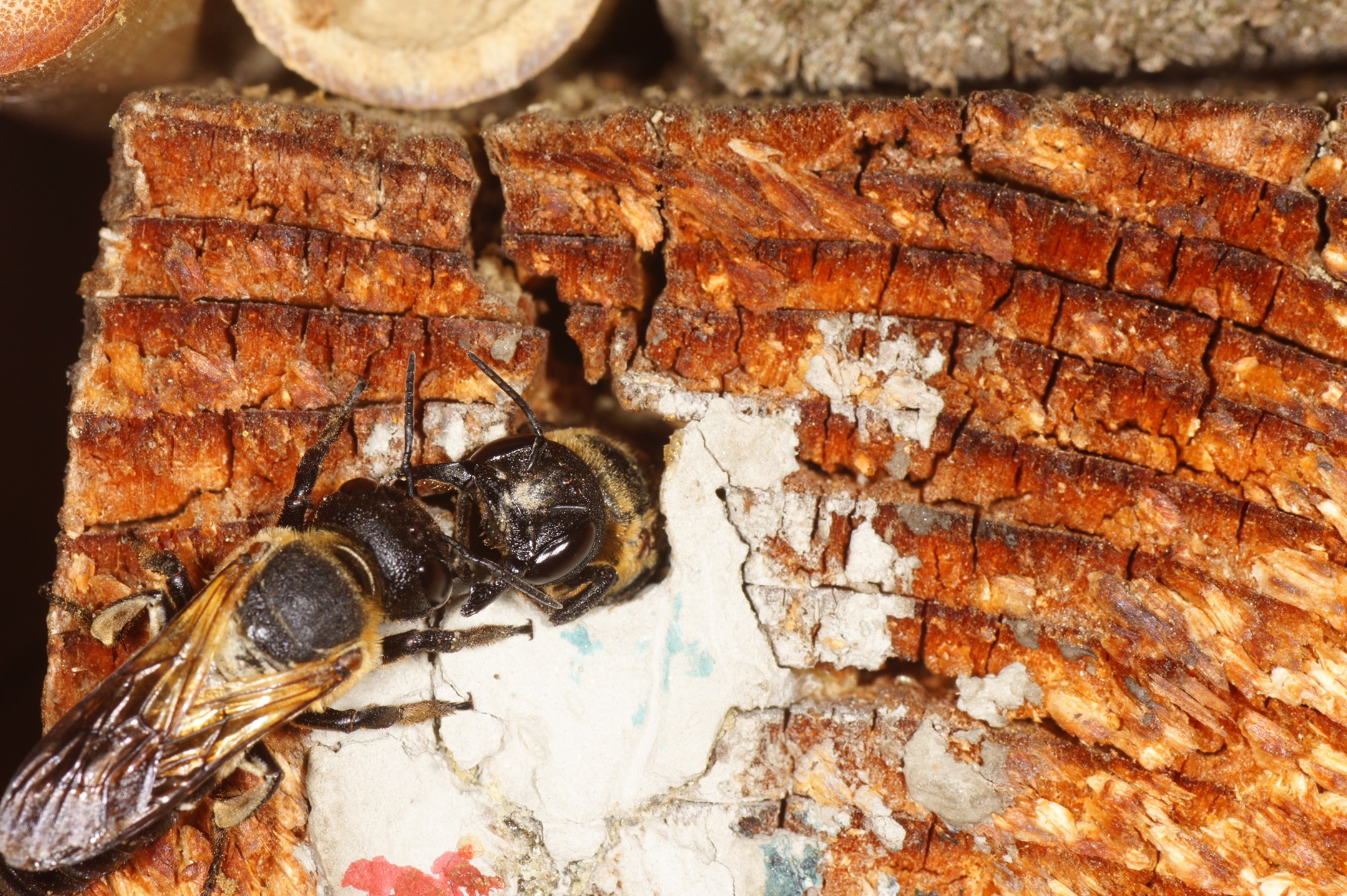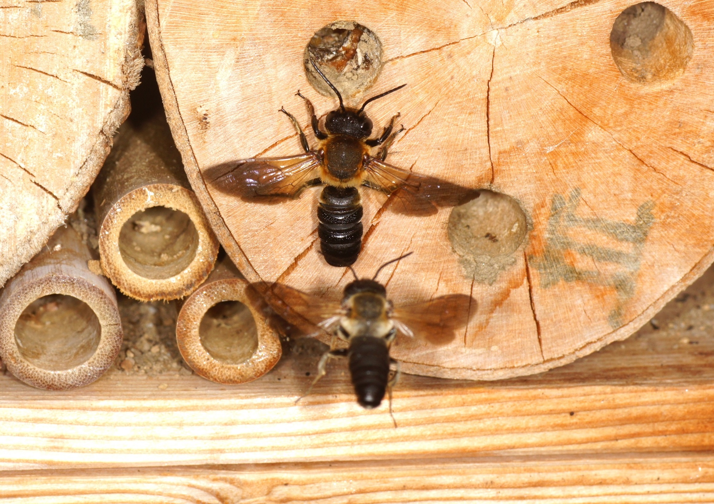 Drei Jahre haben aber gezeigt, dass die Vermehrung bei weitem nicht so dramatisch ist: In Kärnten gab es 2022 4 Fundpunkte, für 2023 keine neuen Meldungen! Man sagt immer die Neozoen haben im Ankunftsland keine Feinde und vermehren sich demnach unkontrolliert. Es mag zwar keine artspezifischen Feinde hier geben, aber Feinde der Wildbienen gibt es jede Menge: Milben, parasitische Wespen und vor allem Vögel: eine Kohlmeise und ein Buntspecht haben mehrfach Schaden angerichtet, vor allem auch bei Osmia cornuta. Mein Hasengitter zum Schutz vor Vögeln kann ich nicht verwenden, weil die großen Bienen sicher ihre Flügel verletzen würden. Von einem invasiven Verhalten habe ich bisher nichts gemerkt. Ich forsche aber weiter, derzeit herrscht "buntes Treiben".