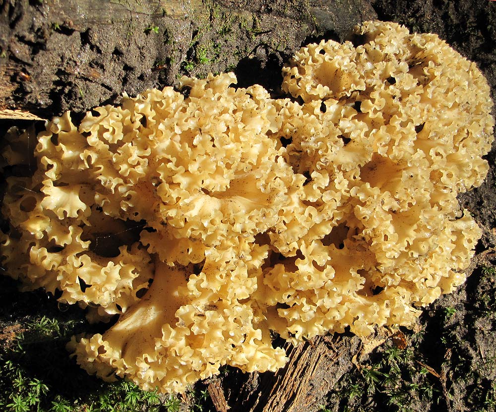 Die Krause Glucke, ein unverwechselbarer Pilz, der auch gut essbar ist. Leider sind oft Koniferennadeln und Sand eingewachsen, wodurch der Genuss manchmal etwas beeinträchtigt wird.