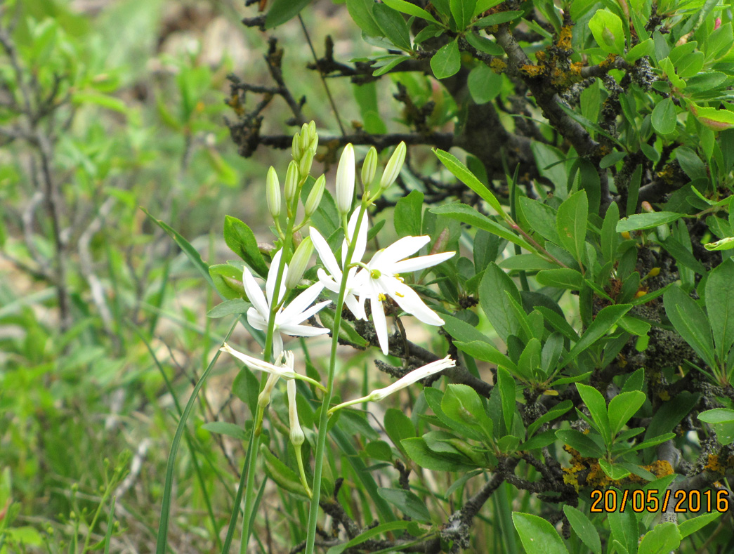 Die Traubige Graslilie oder Astlose Graslilie oder Große Graslilie, Anthericum liliago, steht am Steilhang zum Main hinab. Ihre häufigere