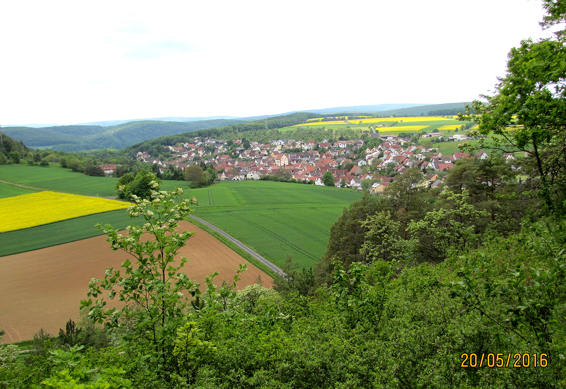über die Landschaft, die gelben Rapsfelder, grüne Fluren und artenreiche, wärmeliebende Wälder.