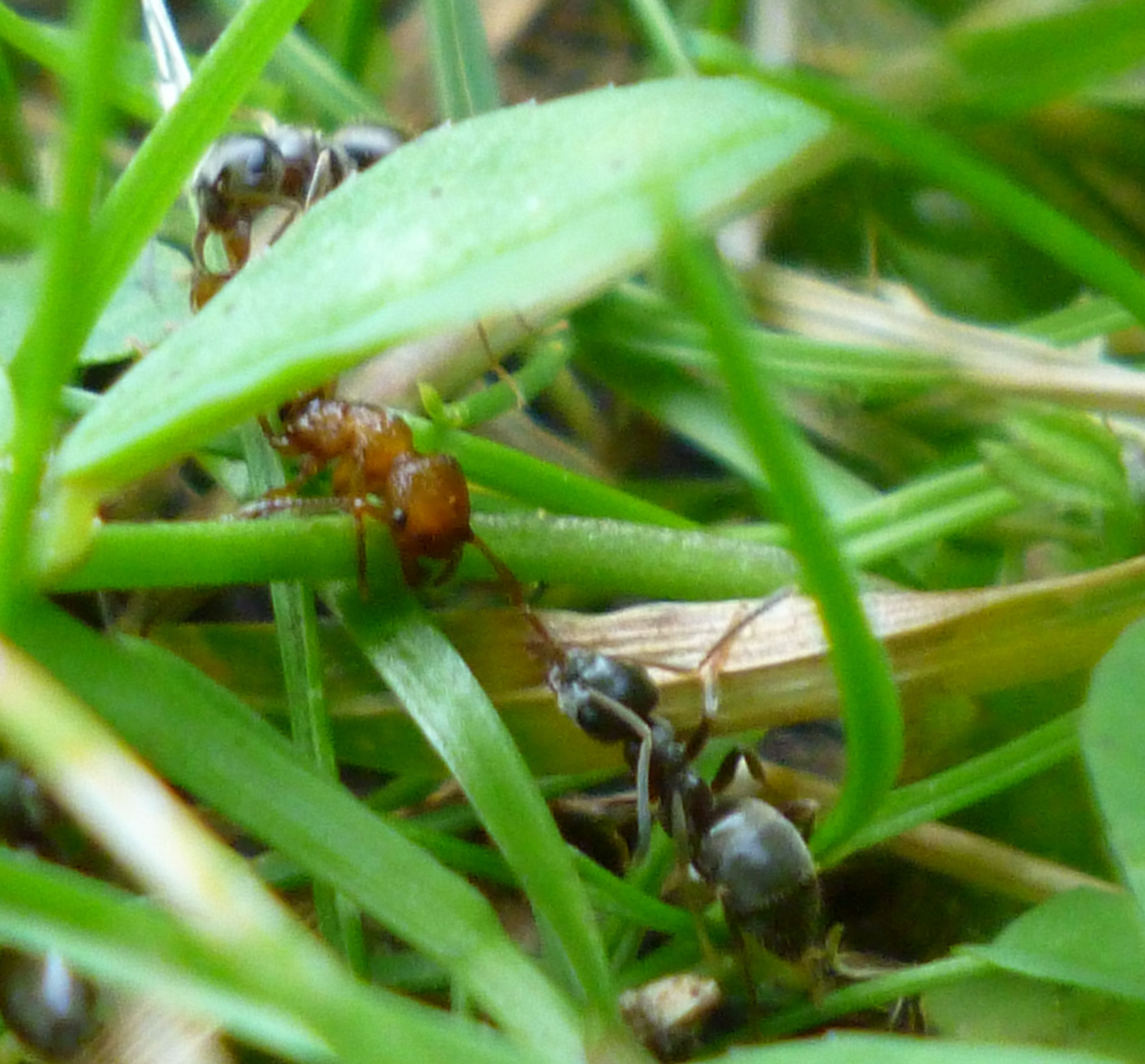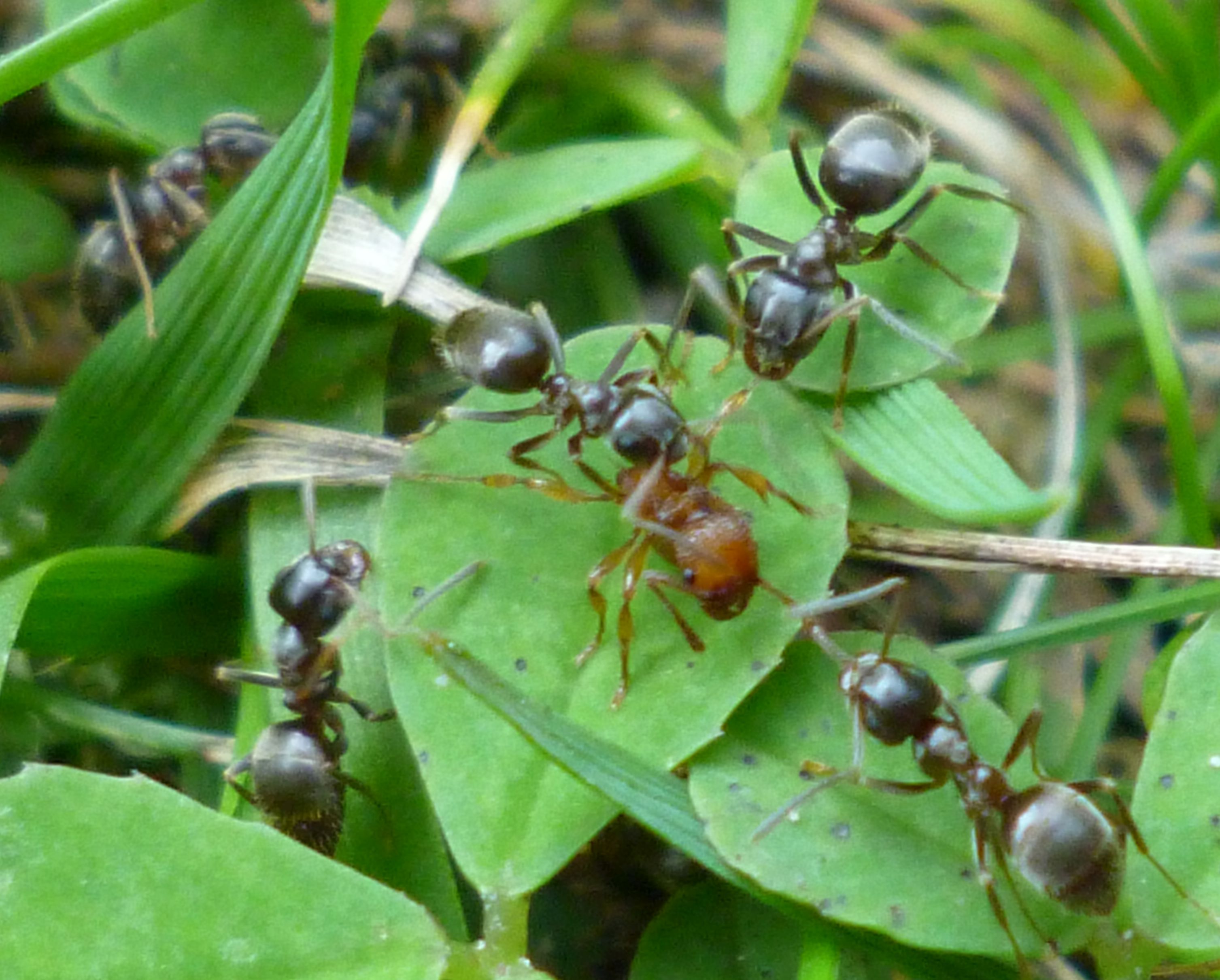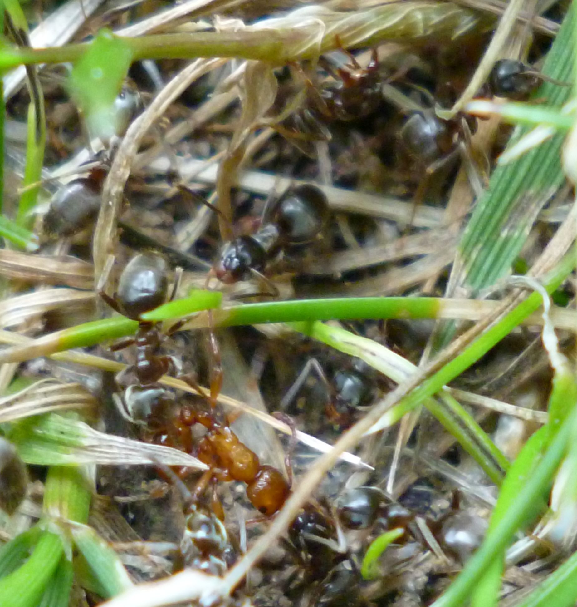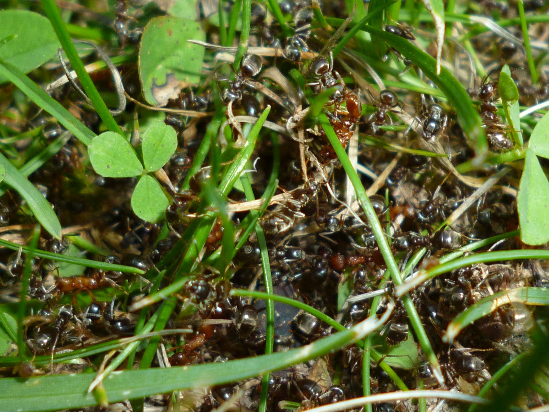 Lasius niger ist als aggressive Ameisenart bekannt. Ihrem Ruf wurde sie heute gerecht, als ich sie dabei beobachten konnte, wie sie im Garten einen regelrechten Vernichtungsfeldzug gegen zwei benachbarte Nester geführt hat, die sich in einer Entfernung von etwa einem Meter zum