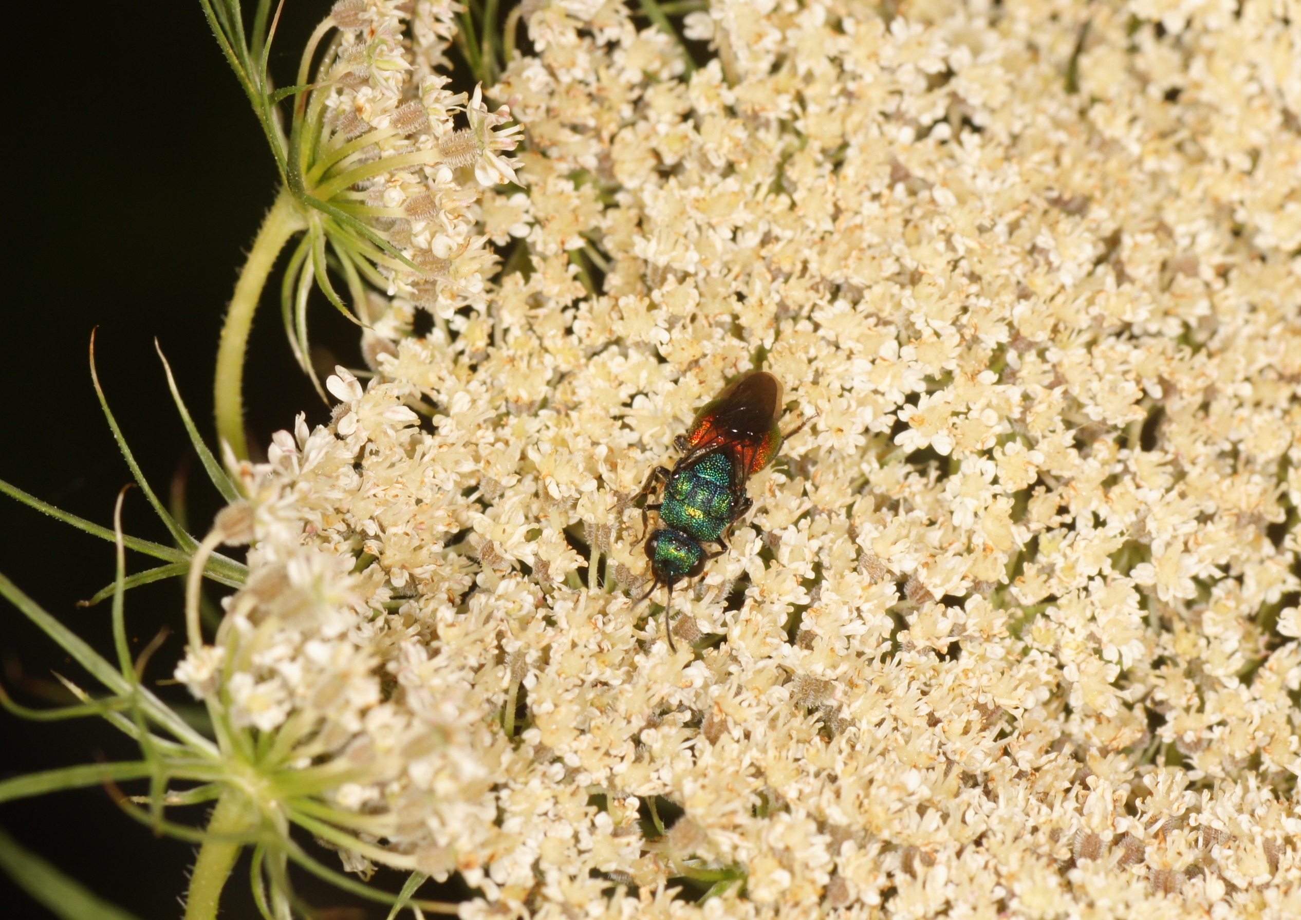 Im Hochbeet hatte ich im vorigen Jahr eine Karottenpflanze vergessen (Daucus carota). Heuer hat sie ausgetrieben und besitzt 3 Blütendolden. Welche Besucher sich da wohl einfinden?