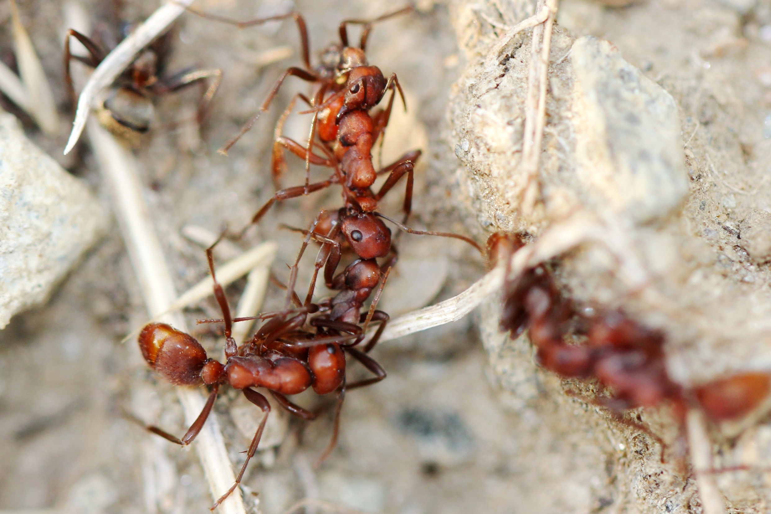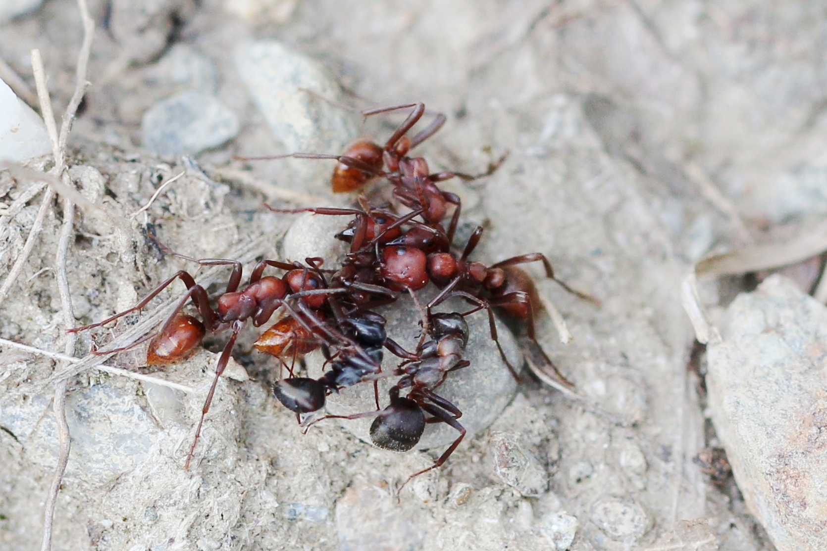5. Zu einem wahren Gemetzel kommt es, wenn ein Amazonenheer ein anderes gemischtes Amazonennest überfällt. Das Konkurrenzverhalten der Art würde ich als "extrem" bezeichnen, es geht um Leben oder Tod. Das siegreiche Nest hat das Anrecht über eine größere Anzahl an Wirtsnestern, nur darum geht es. Hier ist die Strategie des Aggressors von Anfang an anders ausgelegt: Es geht nachrangig um den Brutraub (Brut bleibt sogar oft liegen) und vordergründig um den Tod der anderen Polyergus-Königin, die naturgemäß von den eigenen Volksgenossen verteidigt wird. Ist die fremde Königin tot, können die Aggressoren abziehen, das Nest ist dem Untergang geweiht. Die Hilfsameisen verlassen oft das Nest, die restlichen Amazonen verhungern in wenigen Tagen.