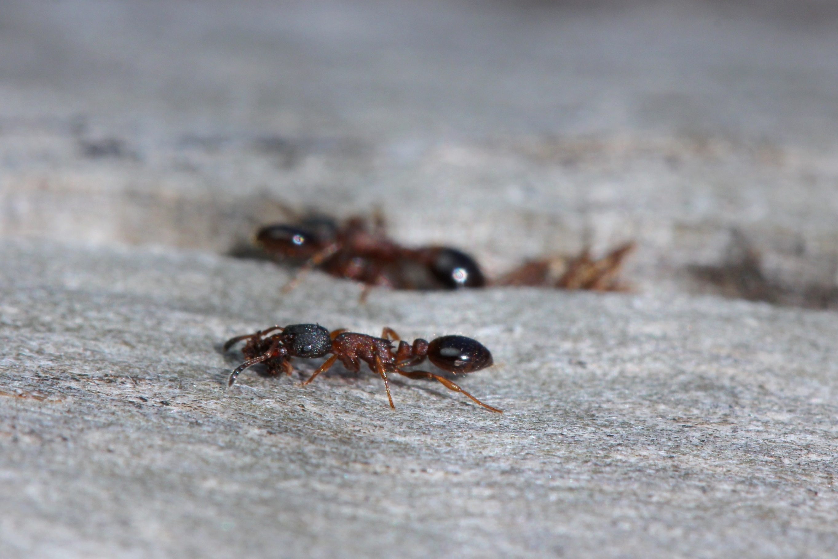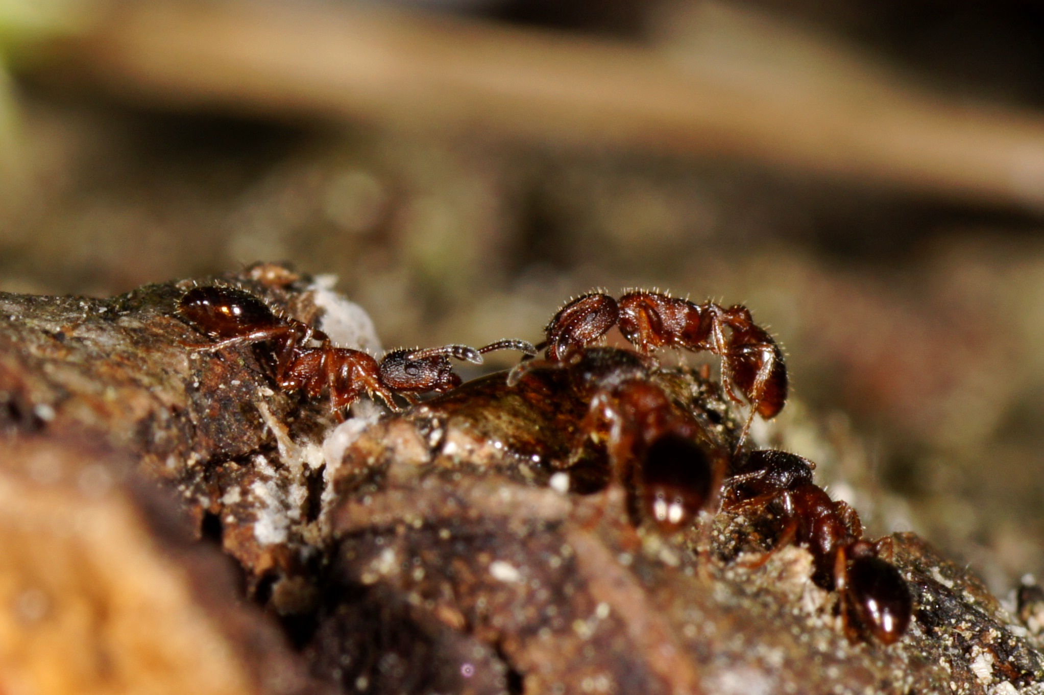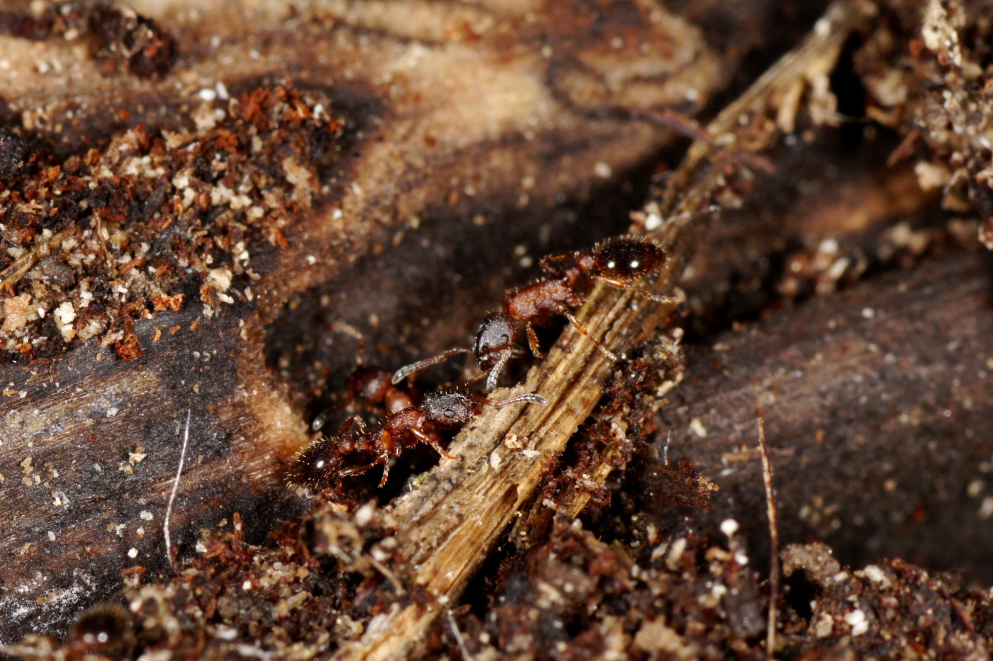 Die Unterscheidung der Gattungen Leptothorax u. Temnothorax lässt sich ganz gut an der Anzahl der Fühlerglieder festmachen: Leptothorax 11, Temnothorax 12 Glieder. Leptothorax acervorum, auch als Große Schmalbrustameise bezeichnet, kommt in unterschiedlichen Habitaten vor. Die Nester werden vorwiegend in liegendem Totholz errichtet. Ich konnte ein einziges Mal ein Nest in etwa 2 m Höhe in einem stehenden, abgestorbenen Obstbaum entdecken. Für Schmalbrustameisen ist die Art groß (Arbeiterinnen bis 4 mm Länge) und kann sich recht schnell bewegen. Es gibt mono- u. polygyne Nester. Die Art gilt als ausgesprochen frosthart (SEIFERT S. 223).