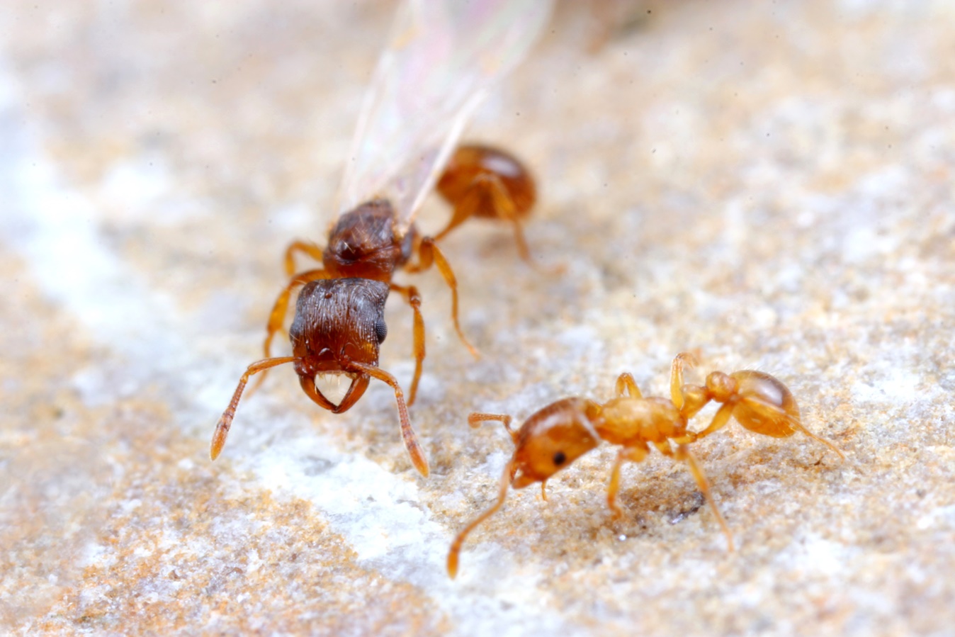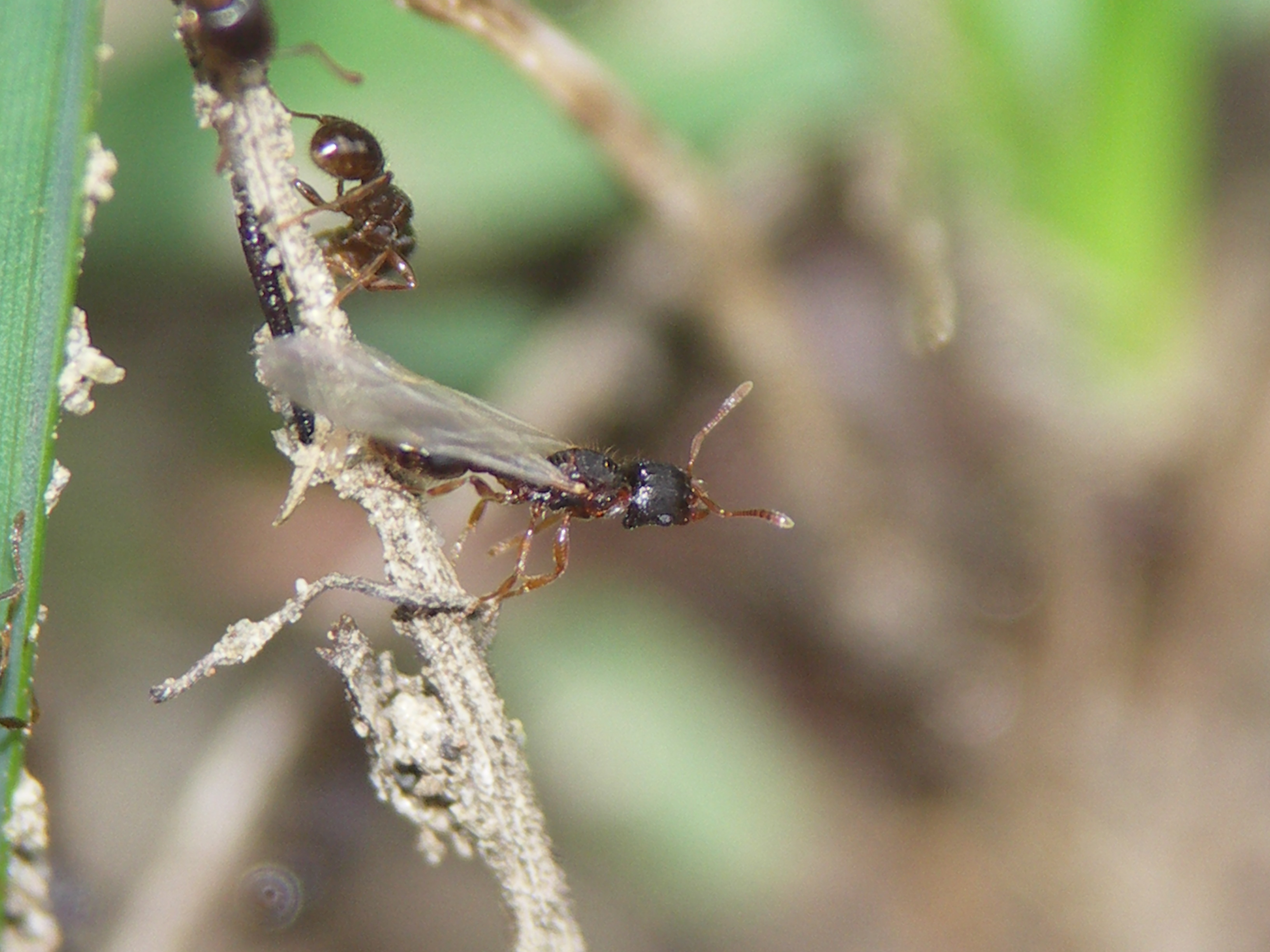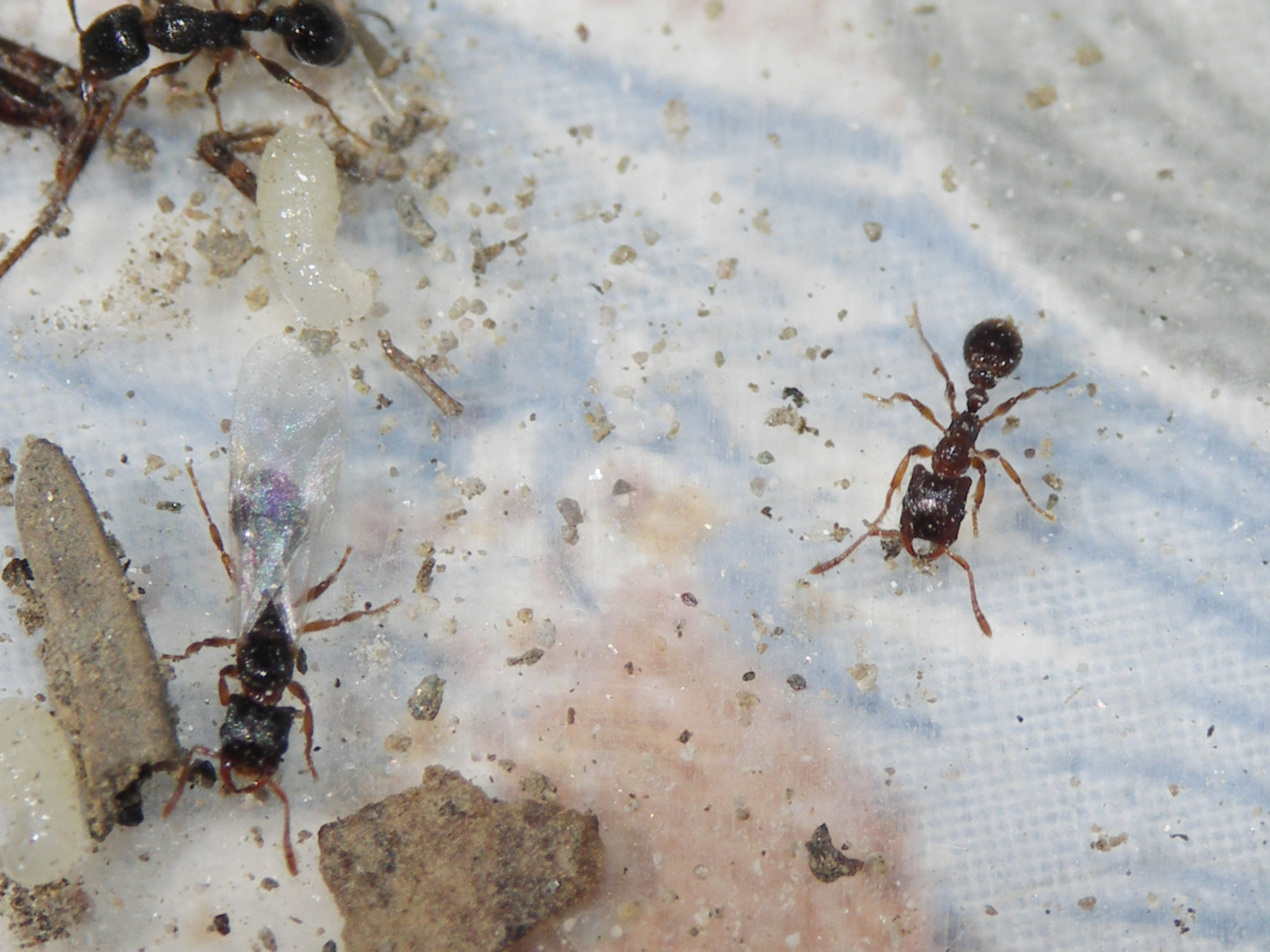 Die geringe Zahl an Strongylognathus-Arbeiterinnen ist auch der Grund, warum man die Nester der Art sehr schwer findet. Bei einem Unter-Steinnest mit zahllosen Tetramorium-Arbeiterinnen sieht man meist nur wenige sozialparasitische Ameisen - und da muss man schon sehr genau schauen, dass man sie nicht übersieht.