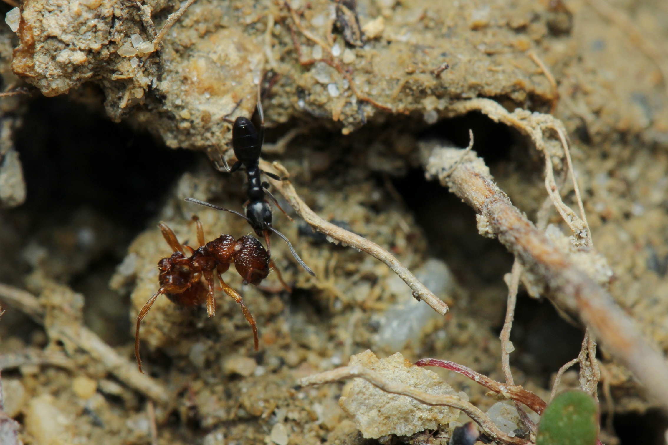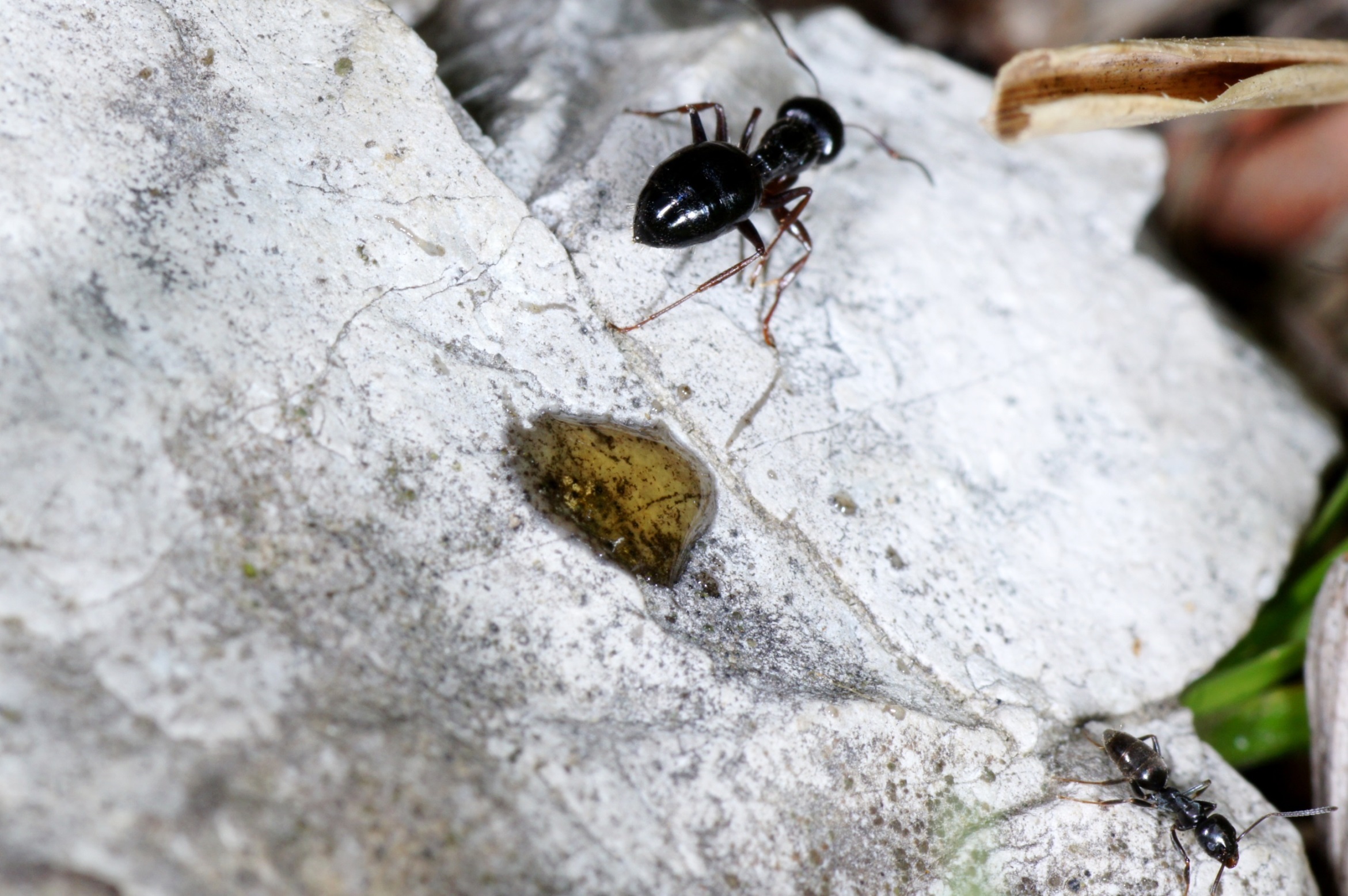 Eine Major-Arbeiterin v. Camponotus piceus ist an der Futterstelle. Eine einzelne Tapinoma nähert sich und will auch mitnaschen. Die Drohgebärden beider Kontrahenten sieht man am Foto, unmittelbar danach kam es zum Kontakt. Die Tapinoma konnte etwas Gift abstreifen u. sofort torkelt die Camponotus benommen davon. Die Tapinoma blieb siegreich und und kam anschließend zur Futterstelle!