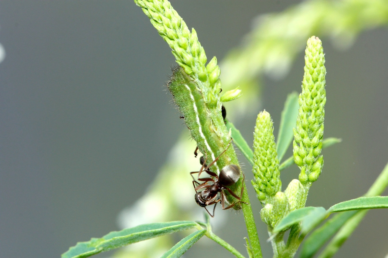 Es ist bekannt, dass einige Ameisenarten mit Bläulingen in einer engen Beziehung stehen. Sohn Roman hat in der Steiermark/Österreich Formica fuscocinerea bei einer trophobiotischen Beziehung mit einer Schmetterlingsraupe beobachtet und fotographiert. Die Wirtspflanze des Schmetterlings ist der Weiß-Steinklee (Melilotus albus), bei dem Schmetterling kann es sich nach Auskunft unseres Experten um den Idas-Bläuling (Plebejus idas) oder den Ginster-Bläuling (Plebejus argus) handeln.