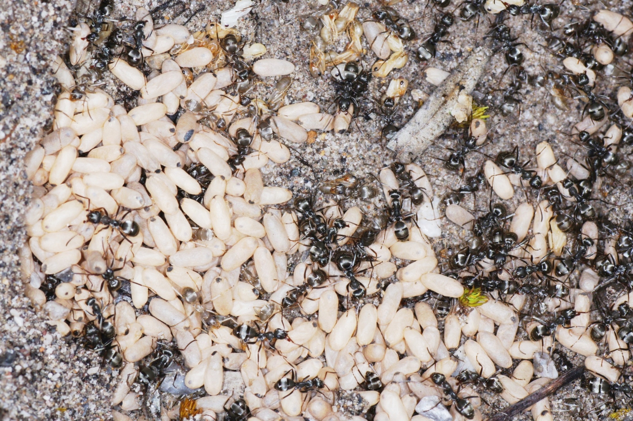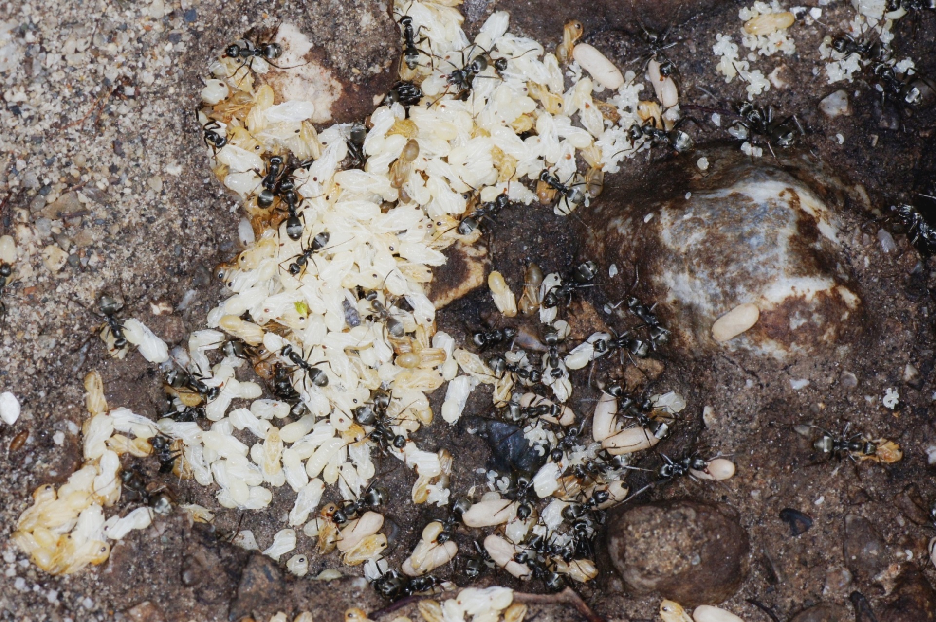 Heute geht es eher um die Frage, ob diese Art wirklich ihre Wohnareale zum Nachteil anderer Arten ausdehnt. Bei uns wird vor allem Manica rubida in Mitleidenschaft gezogen, da sie oft in den gleichen Revieren wie F. fuscocinerea vorkommt, z. B. in den oben erwähnten Bereichen der Flussufer und auch der verwiegelten Flächen im urbanen Bereich. F. fuscocinerea ist zweifellos sehr territorial und vor allem ihre Superkolonien, also zusammenhängende Nestverbände aus einer größeren Anzahl von Nestern, dulden keinen Konkurrenten in ihrem beanspruchten Lebensraum. Das bekommen auch andere Arten und sogar sehr wehrhafte Ameisenarten zu spüren: Vor Jahren konnte ich den Rückzug eines volksstarken Camponotus vagus-Nestes beobachten und ein älteres Bild zeigt die kollektive Vorgangsweise der F. fuscocinerea-Arbeiterinnen: Die Nester der Konkurrenten werden so lange belagert und durch ständige Agitation irritiert, bis die Einwohner verhungern oder auswandern. Trotzdem: Eine sehr interessante und liebenswerte Art: ich habe ein Nest davon im Garten!