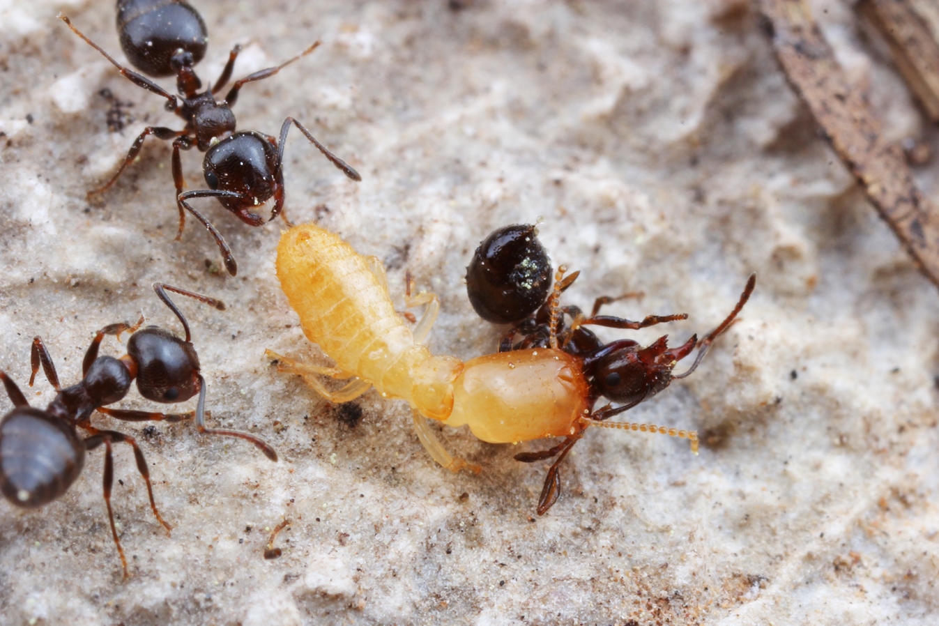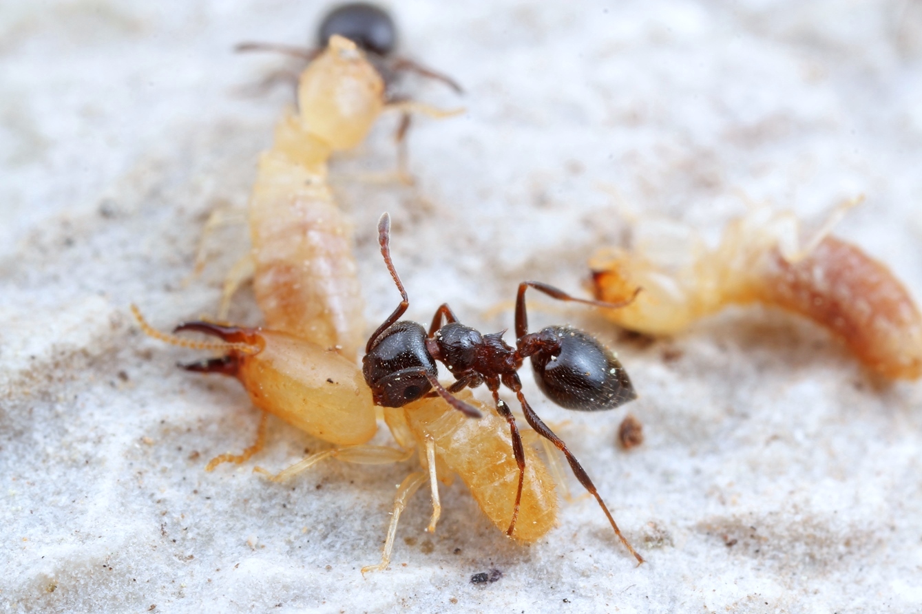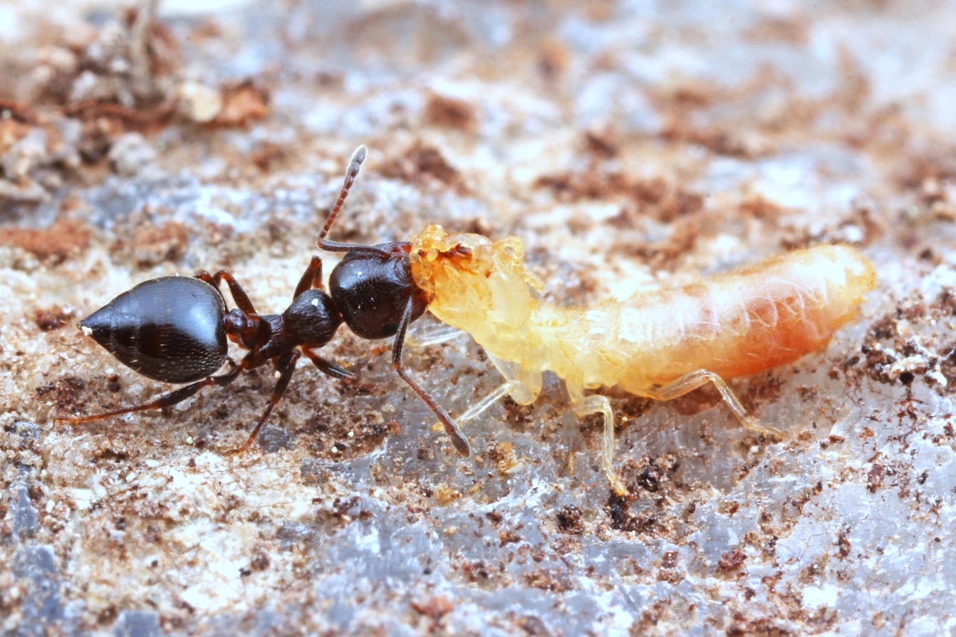 Termiten sind mit den Ameisen phylogenetisch nicht verwandt, sondern gehören zu den Schaben. Es gibt einige Ameisenarten, die Termiten als willkommene Beute ansehen. Es ist aber nicht leicht an diese heranzukommen, da Termiten entweder in Holz oder in Erdbauten leben und mitunter das Nest mit Hilfe einer eigenen Soldatenkaste schützen. Der Kontakt wird manchmal unerwartet herbeigeführt, wenn etwa ein Stein oder ein Stück Totholz vom Boden abgehoben wird. So ist es auch in diesen Fällen geschehen.......[Fotos v. Roman Borovsky]