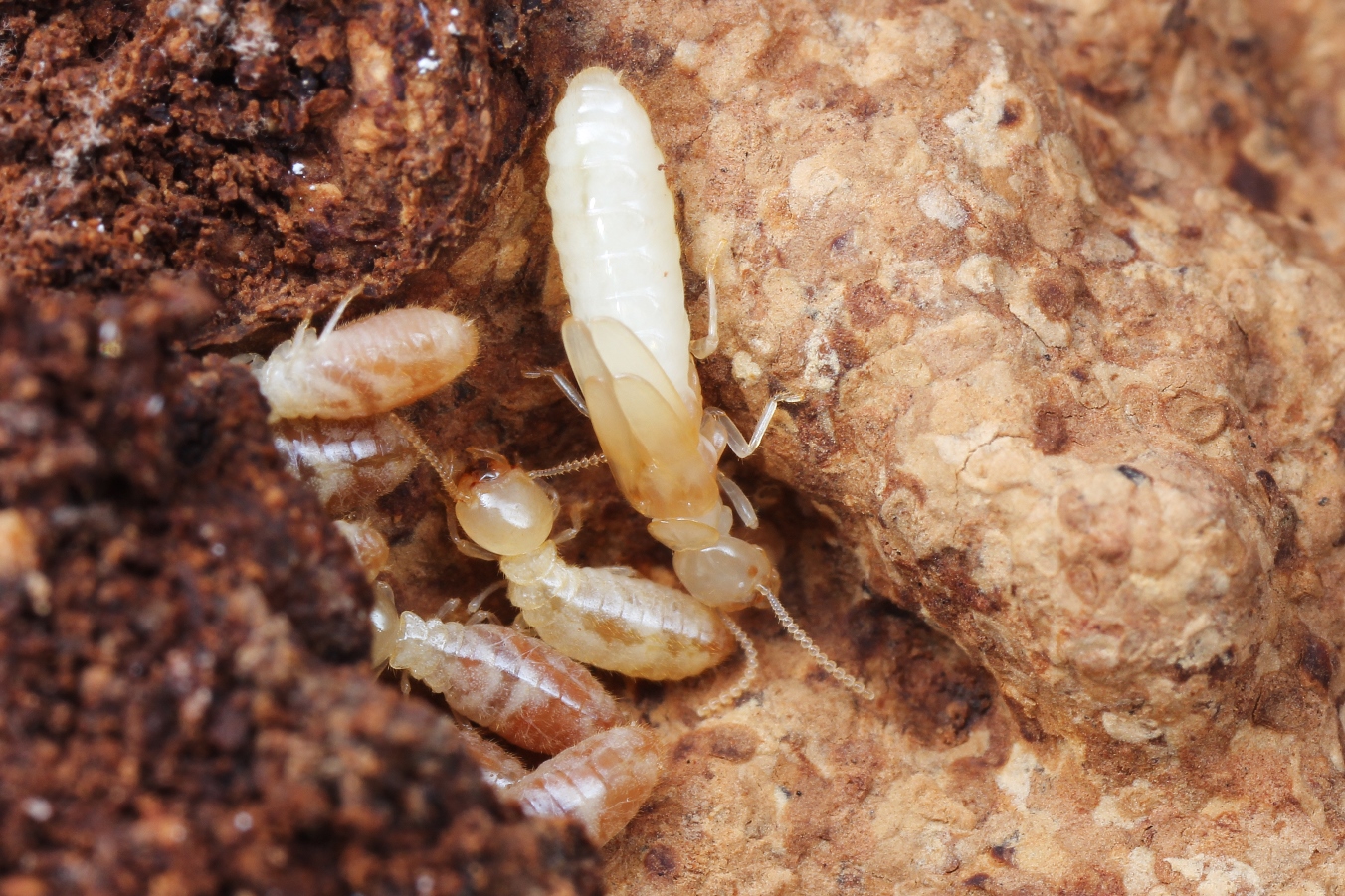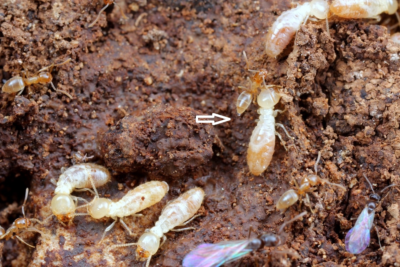Termiten versuchen sich zu verstecken; eine Nymphe mit Flügelansatz wird sich zu einem Geschlechtstier entwickeln