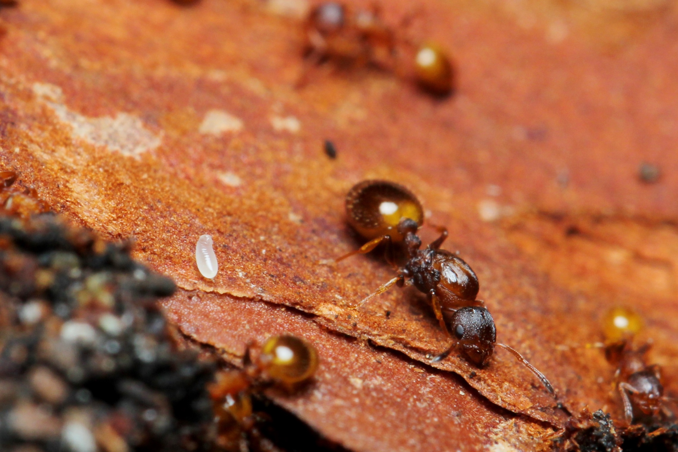 Temnothorax affinis ist eine relativ häufige Art, die auch gerne gehalten wird. Sie ist strikt arborikol, am Boden wird man also keine Nester finden. Diese kleinen Tierchen, die noch dazu eher volksarme Kolonien bilden, findet man nicht leicht. Sie nisten in abgestorbenen Ästchen od. unter Borke älterer Bäume. Die Fotos stammen von einem Nest, das ich unter der Borke einer Rotföhre (im Schneeheide-Rotföhrenwald) finden konnte und zwar nur etwa 0,5 m über dem Boden. Die Fotos stammen wieder von Sohn Roman.