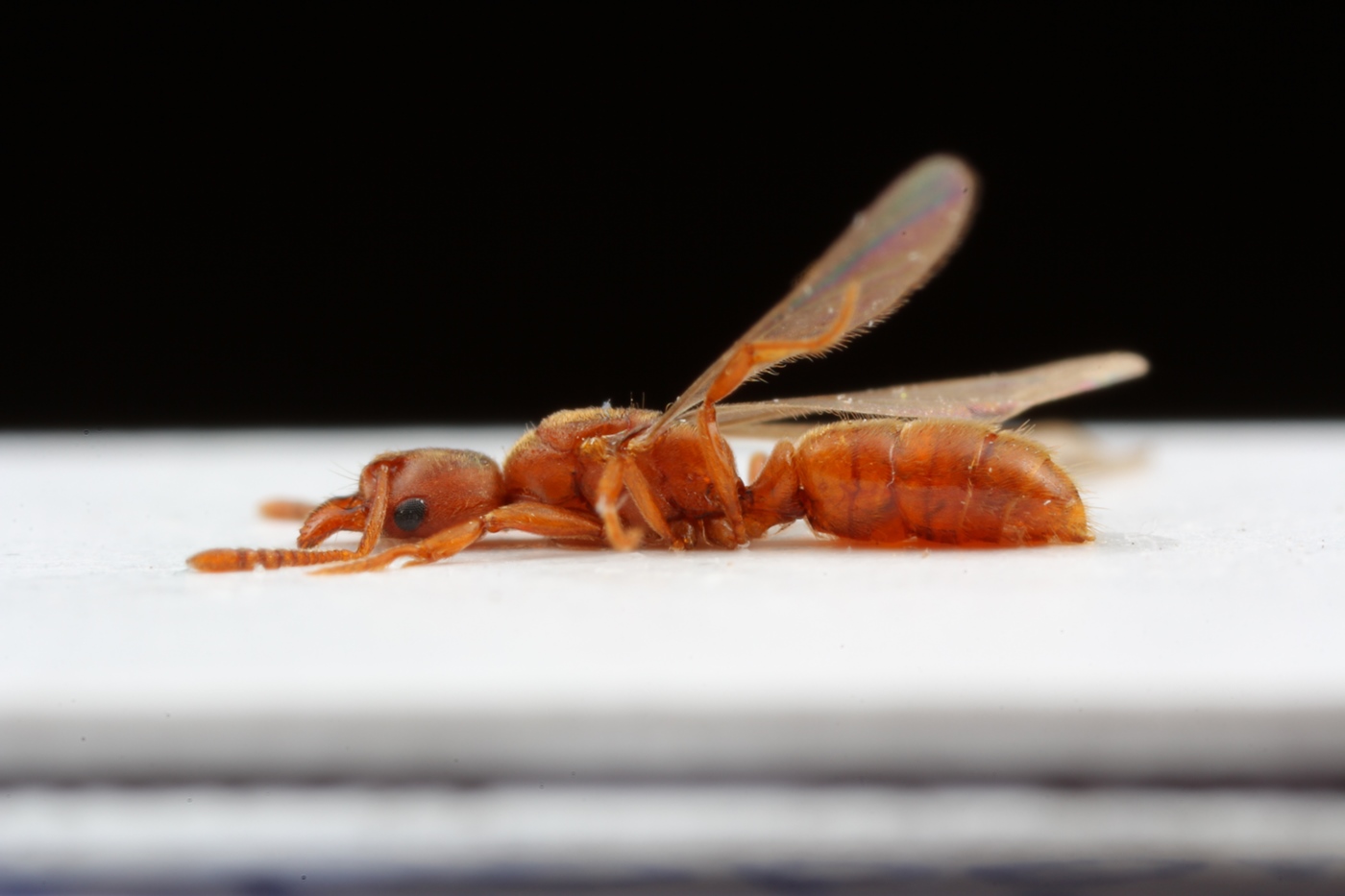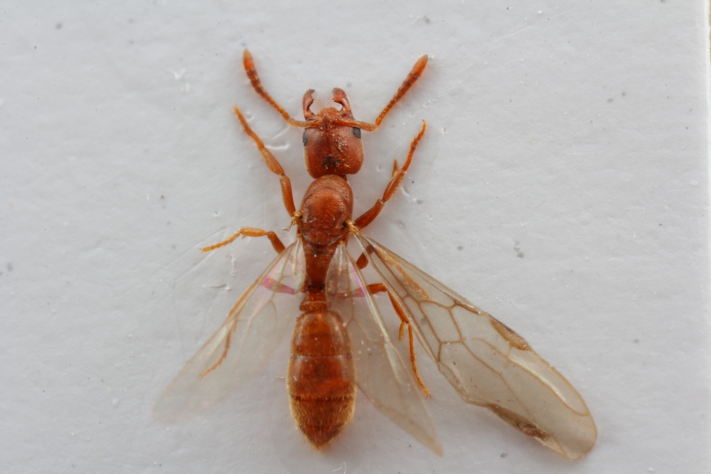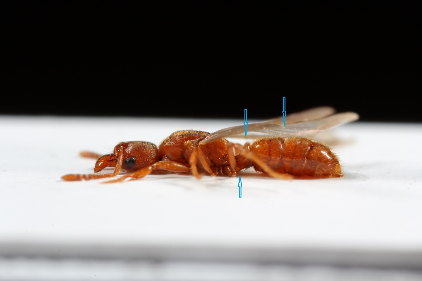 Ein Mitglied unseres Naturwissenschaftlichen Vereins hat mir den Beleg einer alaten Gyne aus Friaul mitgebracht, dort ist sie in eine nächtliche Lichtfalle geraten. Sohn Roman hat ein paar Fotos gemacht, das war nicht einfach, weil das ganze Tier mit einem Klebstoff auf der Unterlage fixiert wurde. Dort "sitzt" aber ein wichtiges Bestimmungsmerkmal, ein sklerotisierter Ventralanhang am Petiolus. Dessen Form unterscheidet sich recht deutlich von einem sehr ähnlichen Anhang der Ponera-Verwandtschaft.