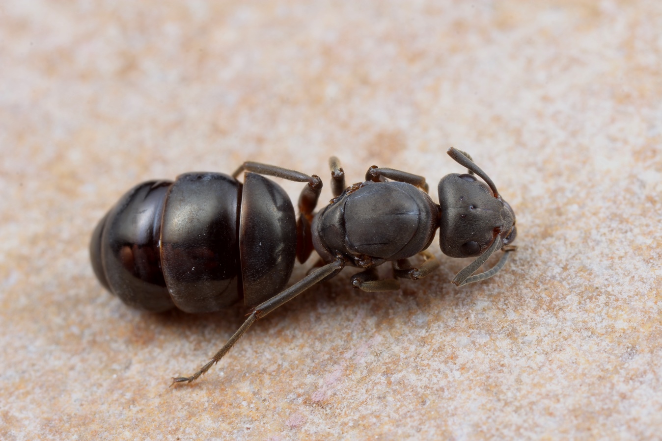 Diesmal ist es leichter: Nach dem Schlüssel v. SEIFERT muss es wohl F. aquilonia sein, darauf weisen vor allem die Behaarungsmerkmale hin. Die Gaster ist deutlich glänzend und fast ohne abstehende Haare, aber darauf weist der Autor auch ausdrücklich hin: "Vorderfläche des 1. GAstertergites mit abstehenden Haaren (bei aquilonia können diese manchmal fehlen)" (S. 185). Die dunkle Färbung kommt hier als "Sonderfall" hinzu. Das Tierchen erwies sich nebenbei als äußerst munter und es wurde ganz in der Nähe eines weiteren ebenso dunklen Exemplars gesichtet, das aber entkommen konnte.