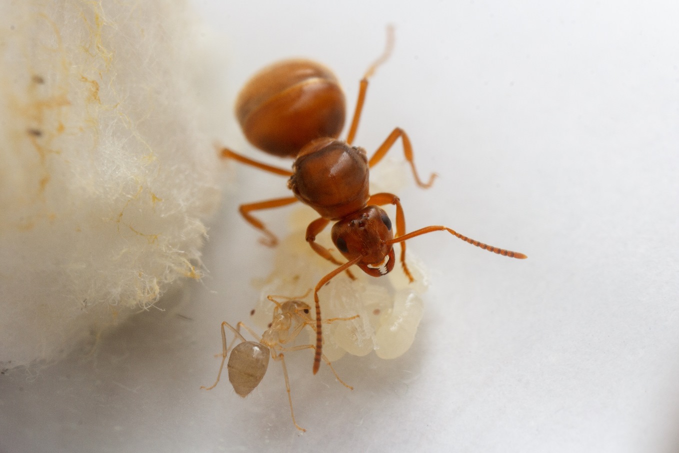 Die Arbeiterin packt die Königin an einer Mandibel und versucht sie wegzuziehen.