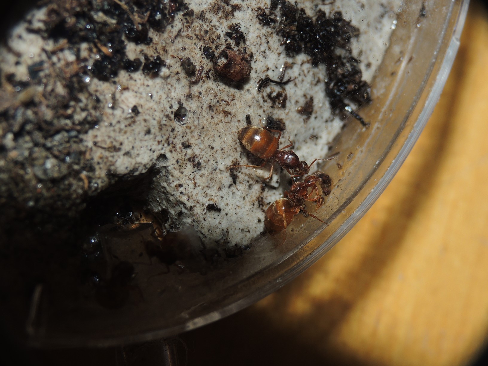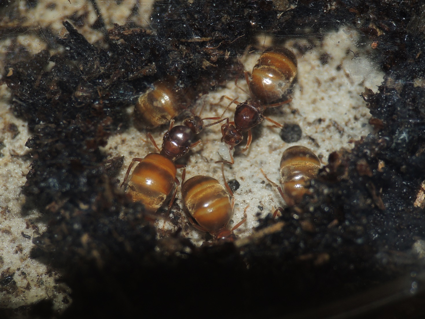 Vor kurzem habe ich sie dann ausgewintert, der traurige Rest der Kolonie war die Gyne und eine Arbeiterin. Einen Tag später verstarb die Arbeiterin, kurz darauf fiel die Gyne auf die Seite und schleppte sich umher. Ich hatte ein schnelles Ende erwartet, aber das Tier hat noch beinahe 48 Stunden Lebenszeichen von sich gegeben, bevor die Lichter ausgingen. Nahrung, Wasser (alles auch während er WR zugänglich für Notfälle) wurden nicht angenommen. Temperaturgefälle wurde angeboten, aber hatte wohl keinen Einfluss (mehr) auf die Entwicklung. Somit kann ich auch leider keinen Mehrwert im Wissensbereich liefern, was die Ursache war oder wie man hätte helfen können.