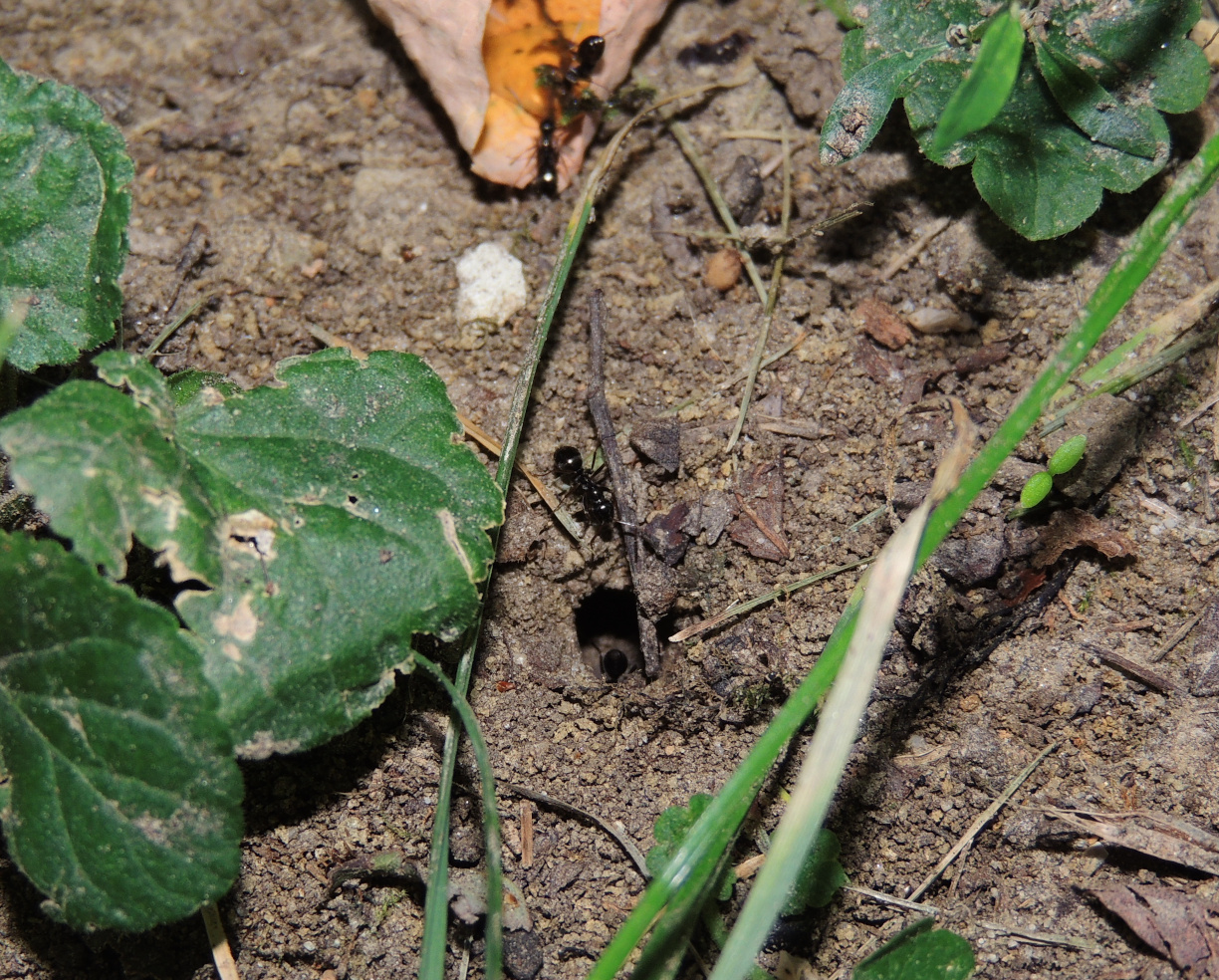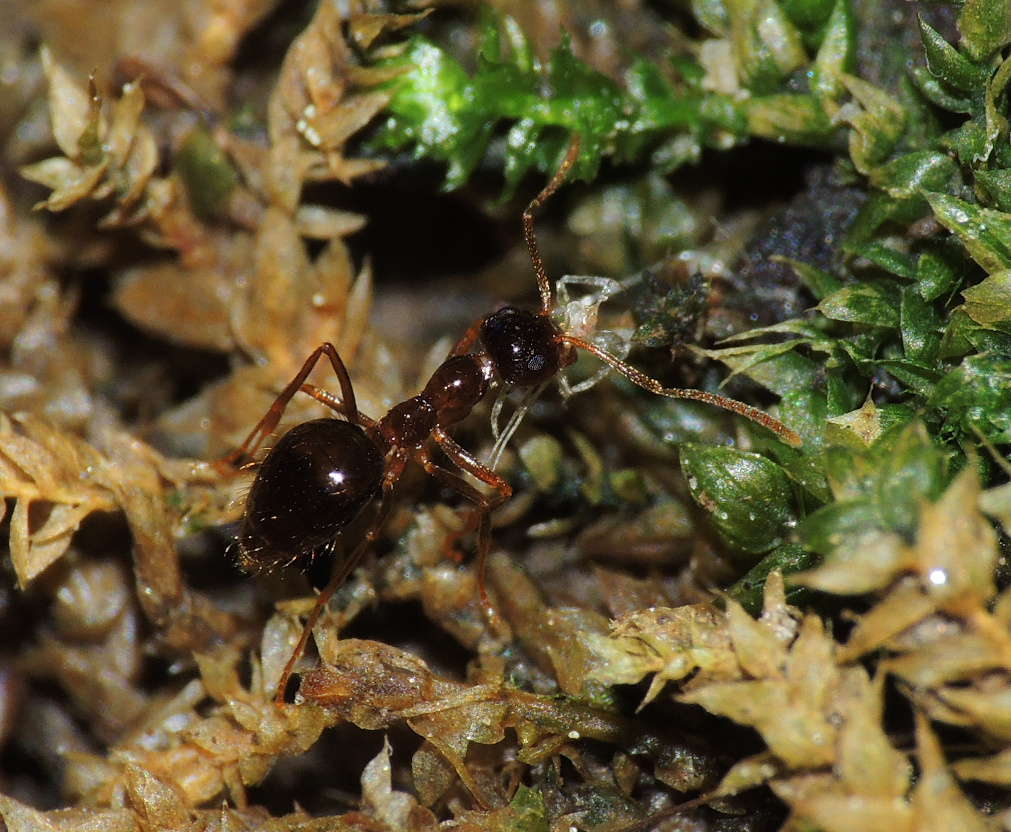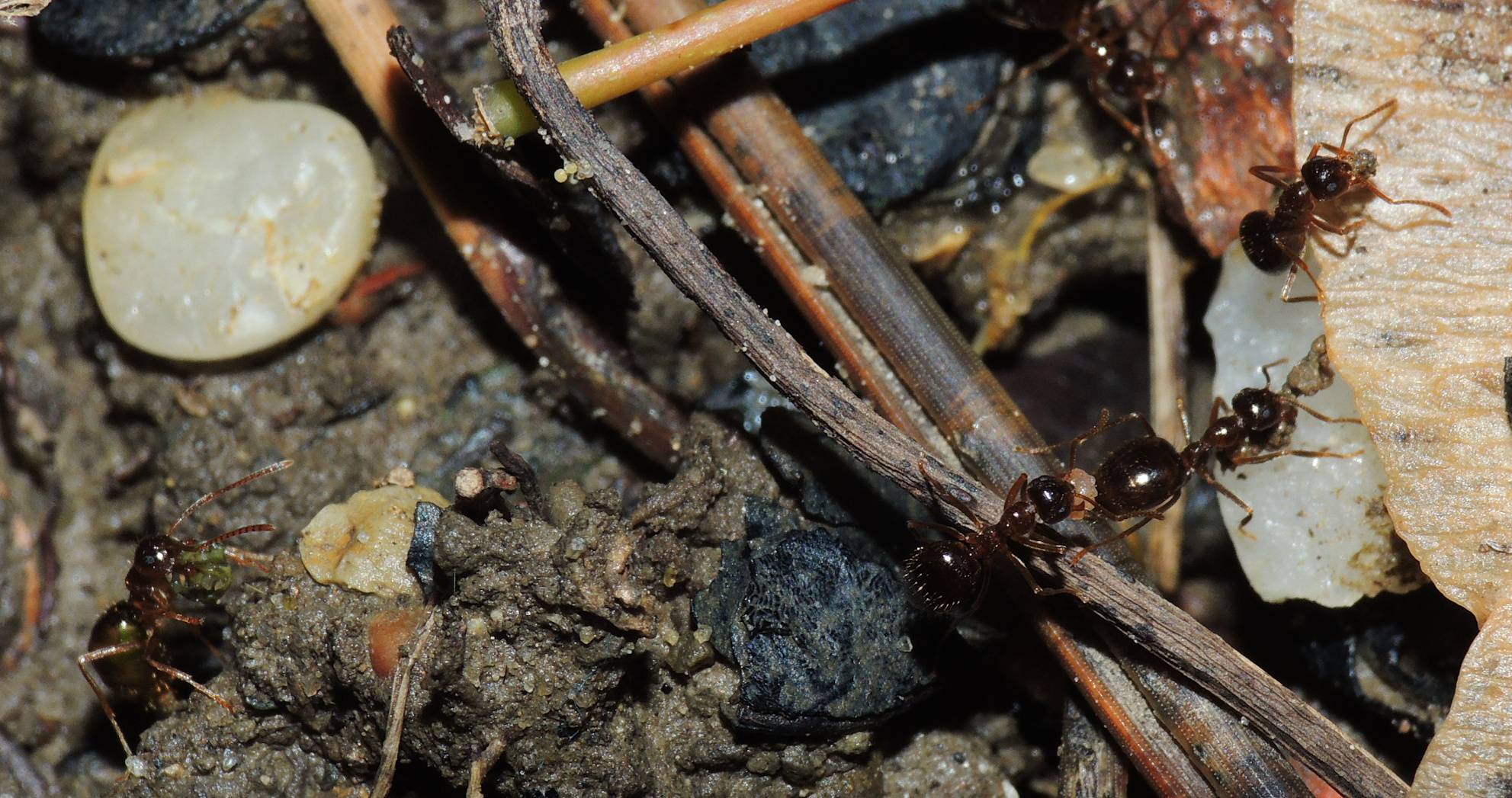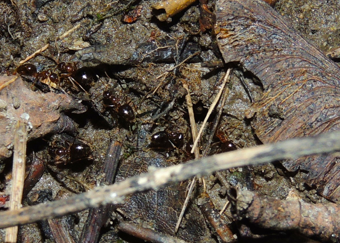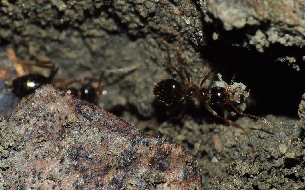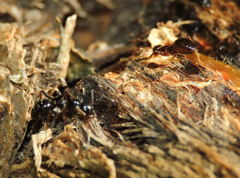 Formica cf. gagates (unscharf, links unten) und Prenolepis nitens (rechts oben)