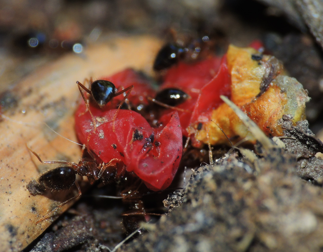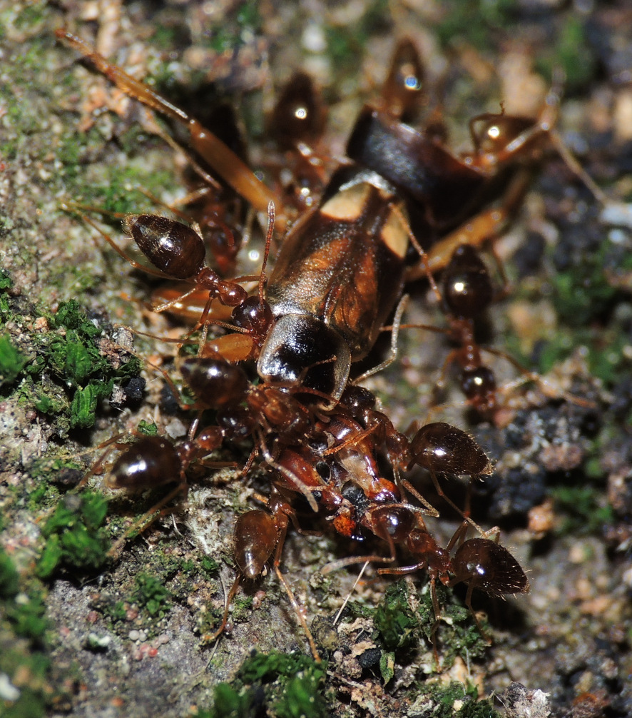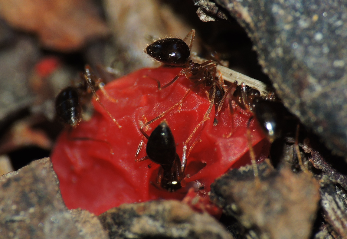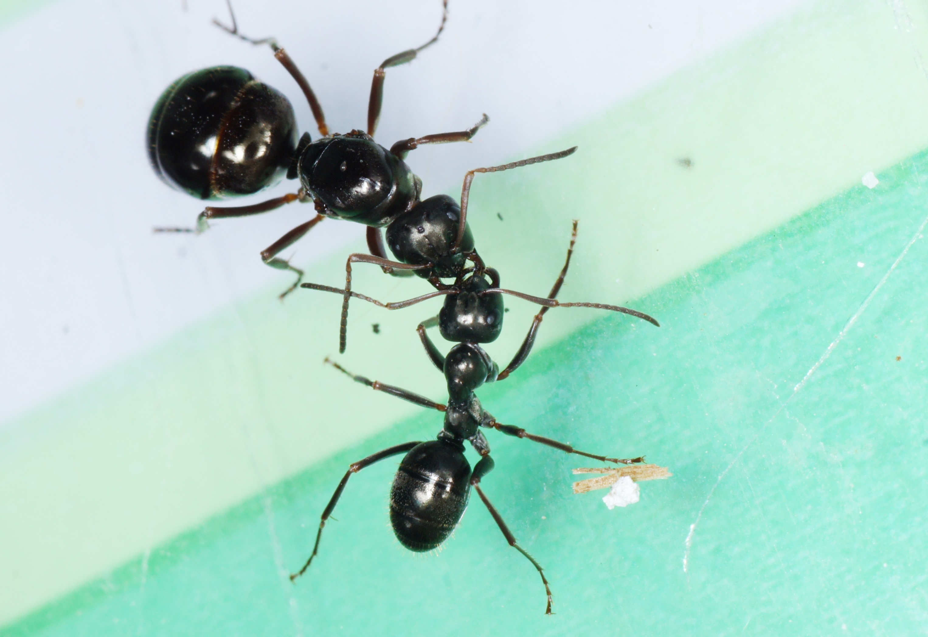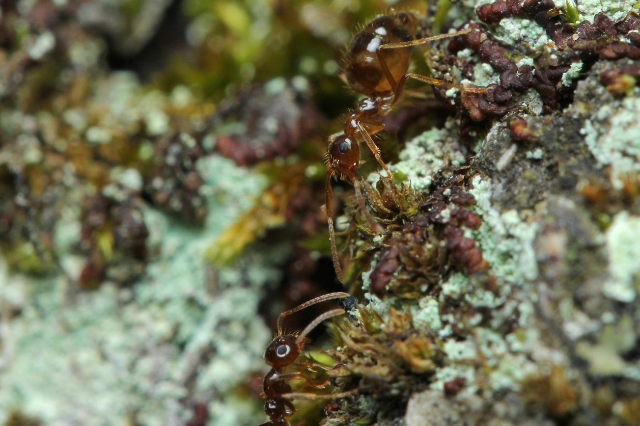 Formica cf. gagates (unscharf, links unten) und Prenolepis nitens (rechts oben)
