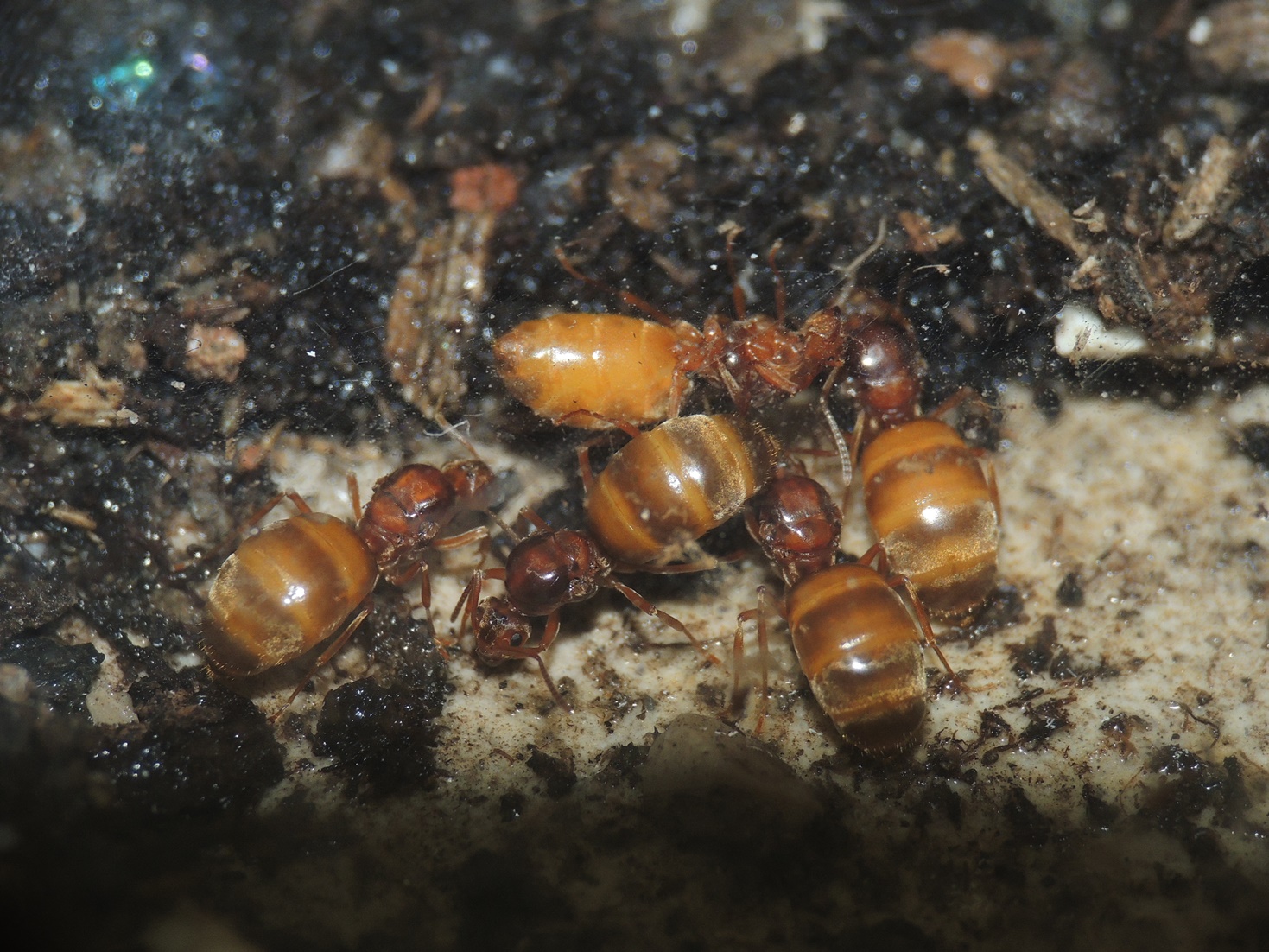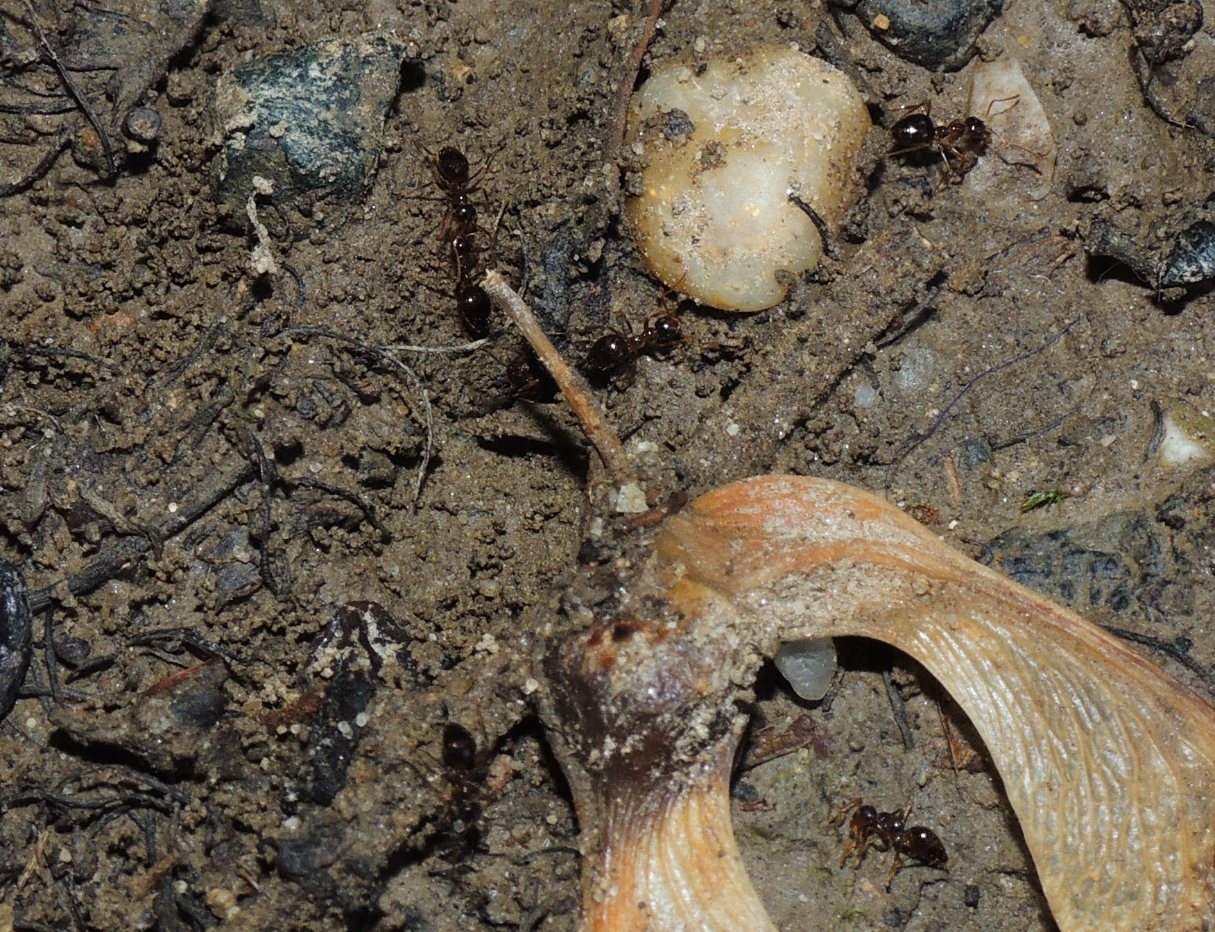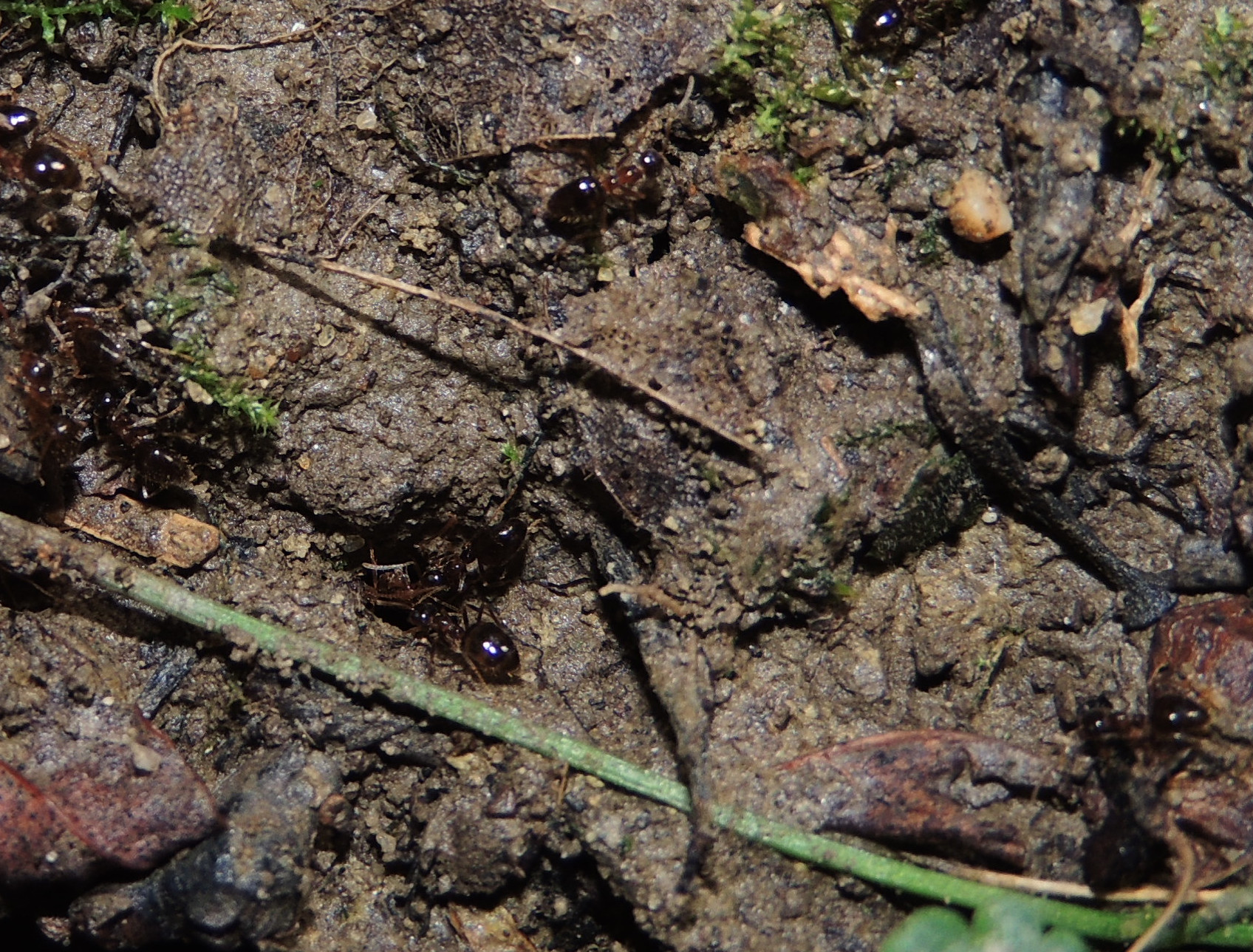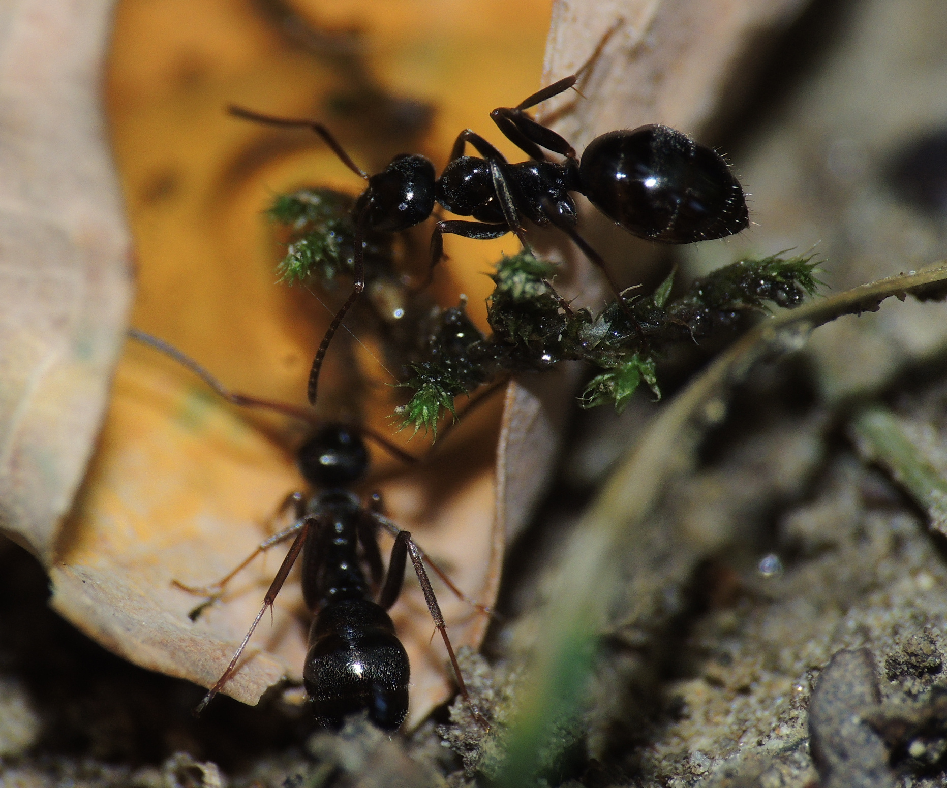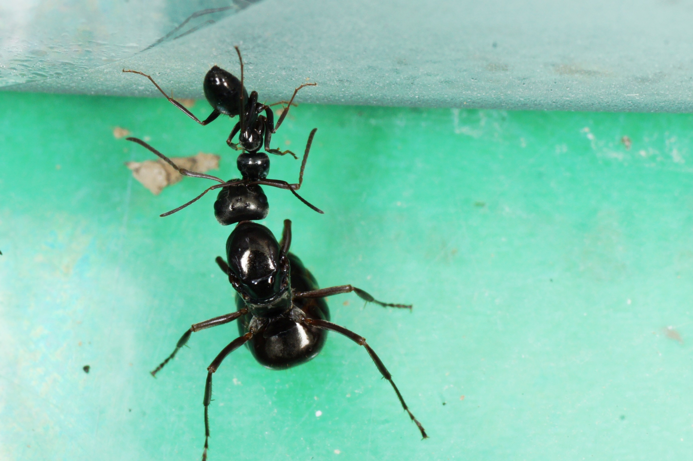 Formica cf. gagates (unscharf, links unten) und Prenolepis nitens (rechts oben)