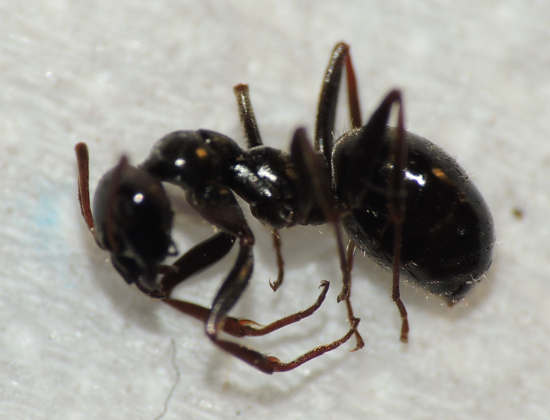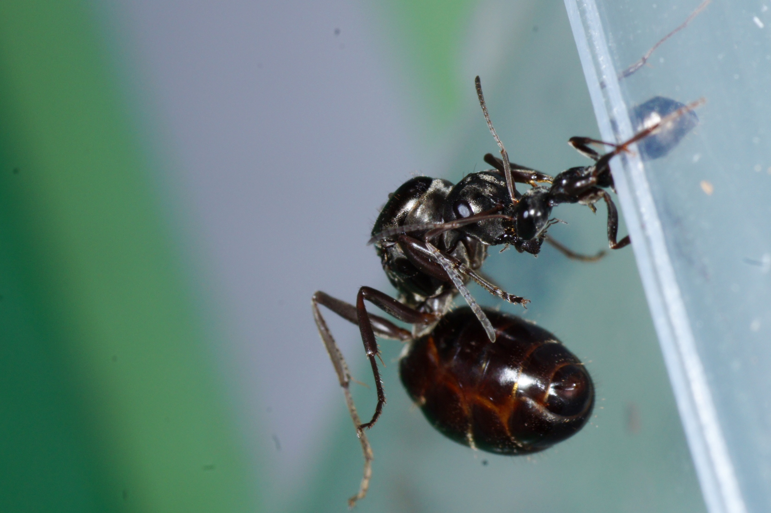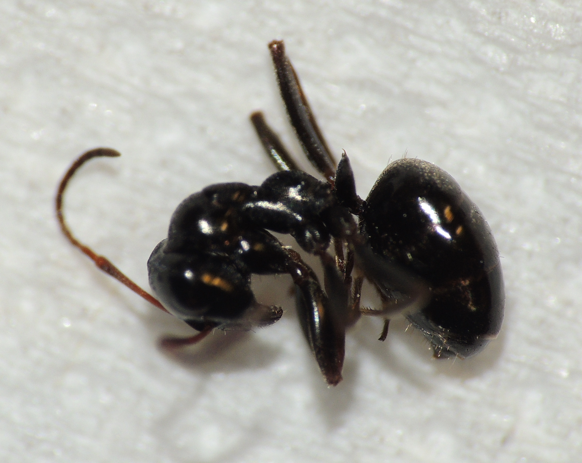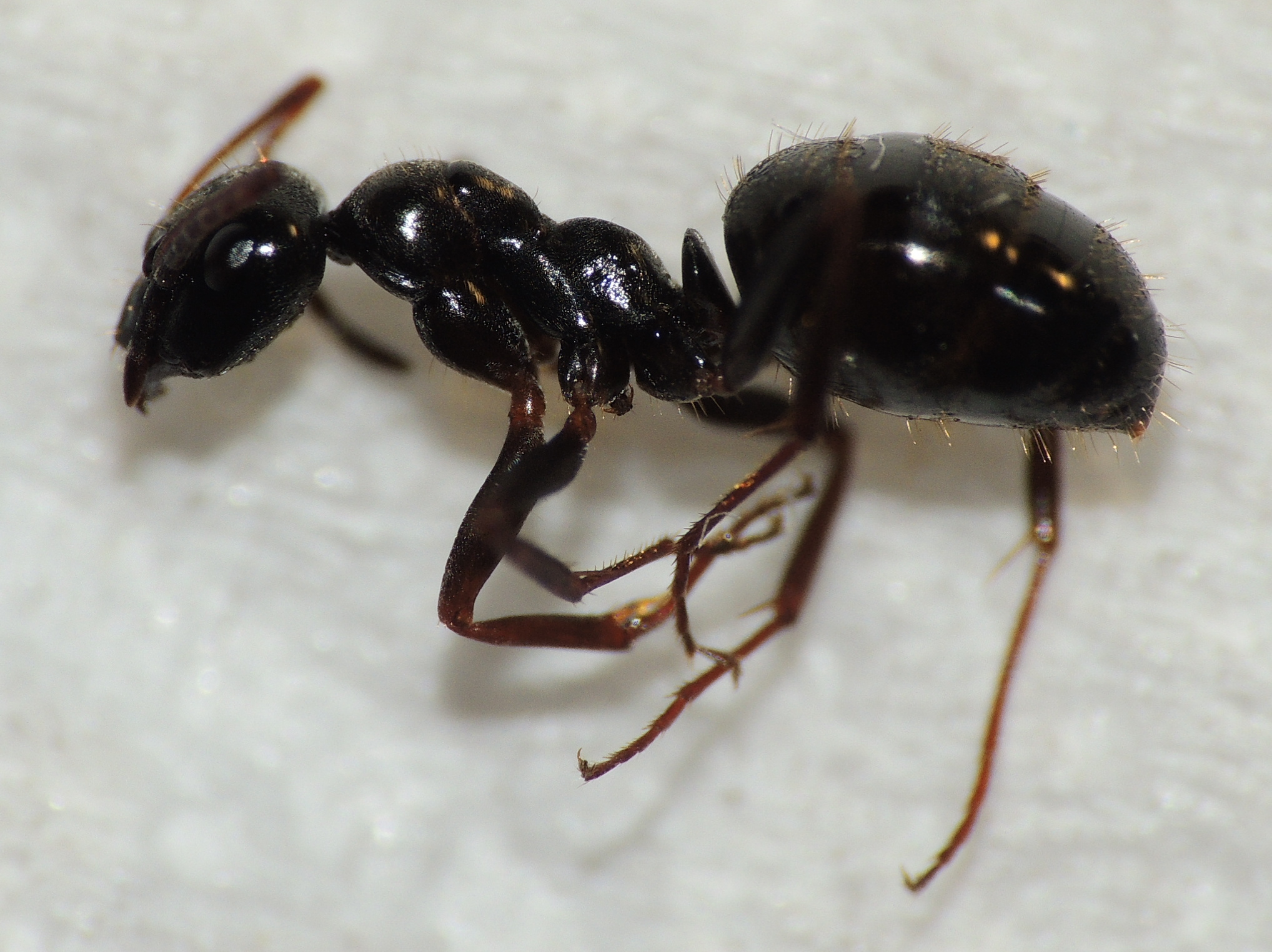 Formica cf. gagates (unscharf, links unten) und Prenolepis nitens (rechts oben)