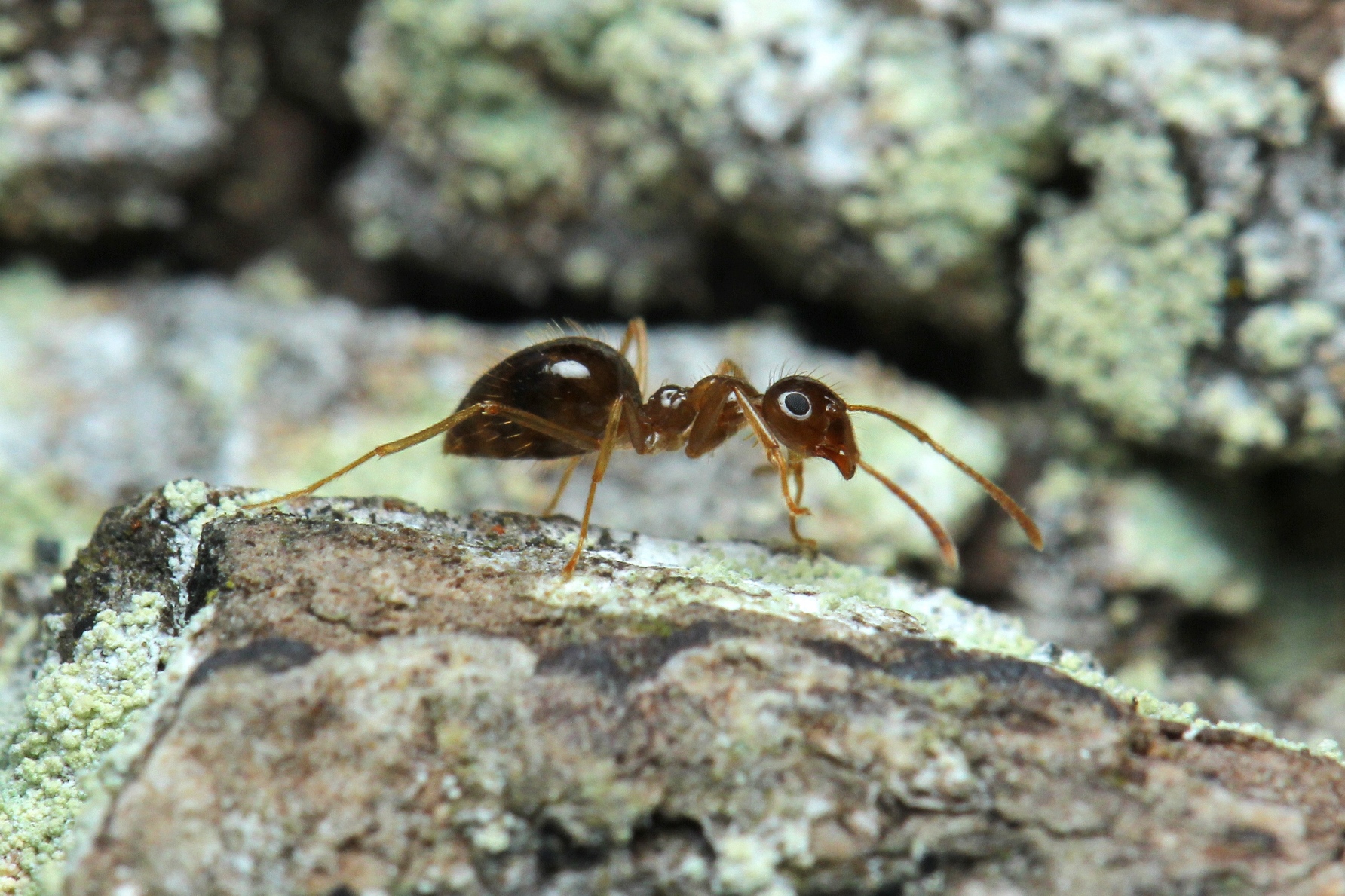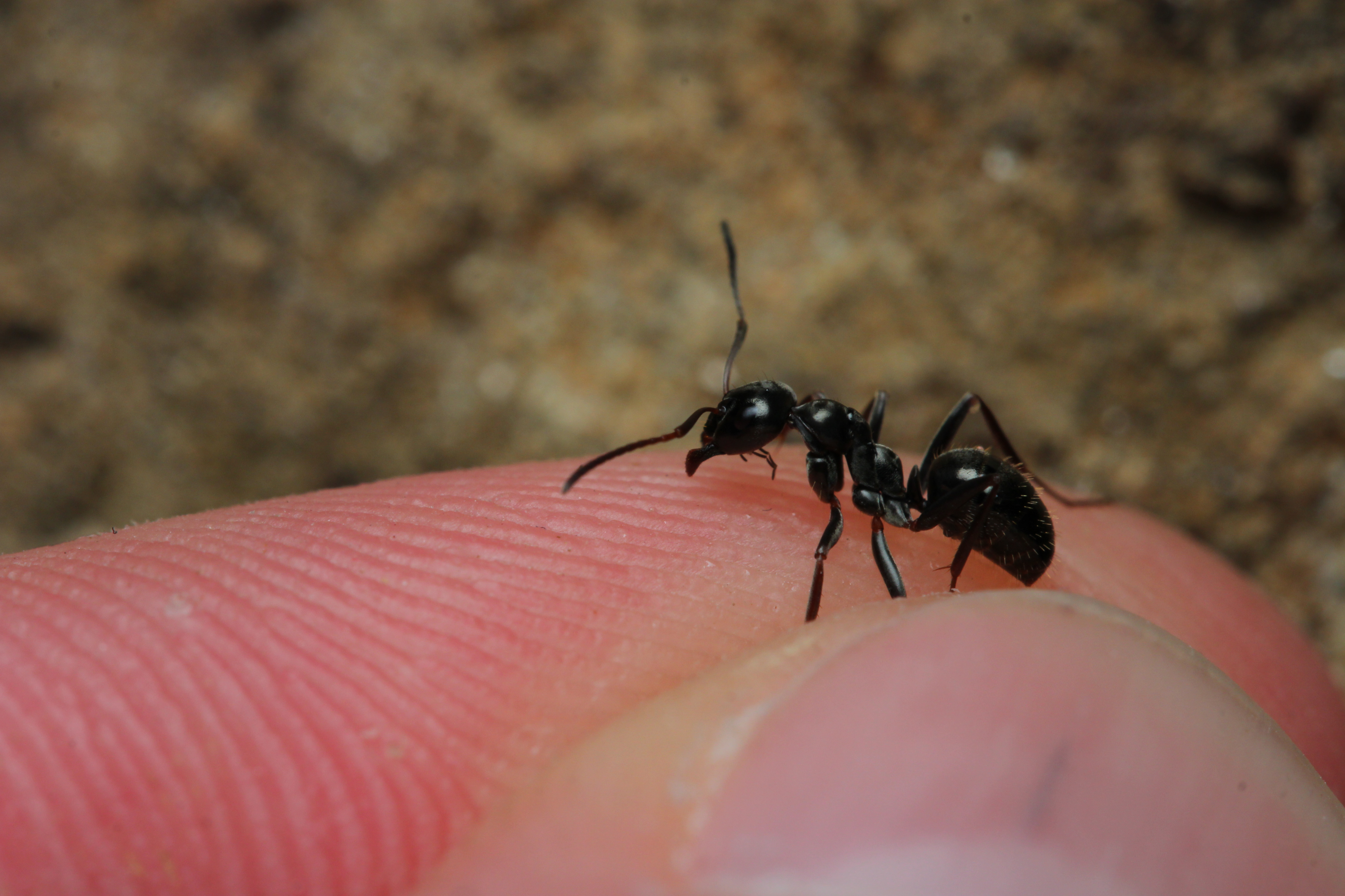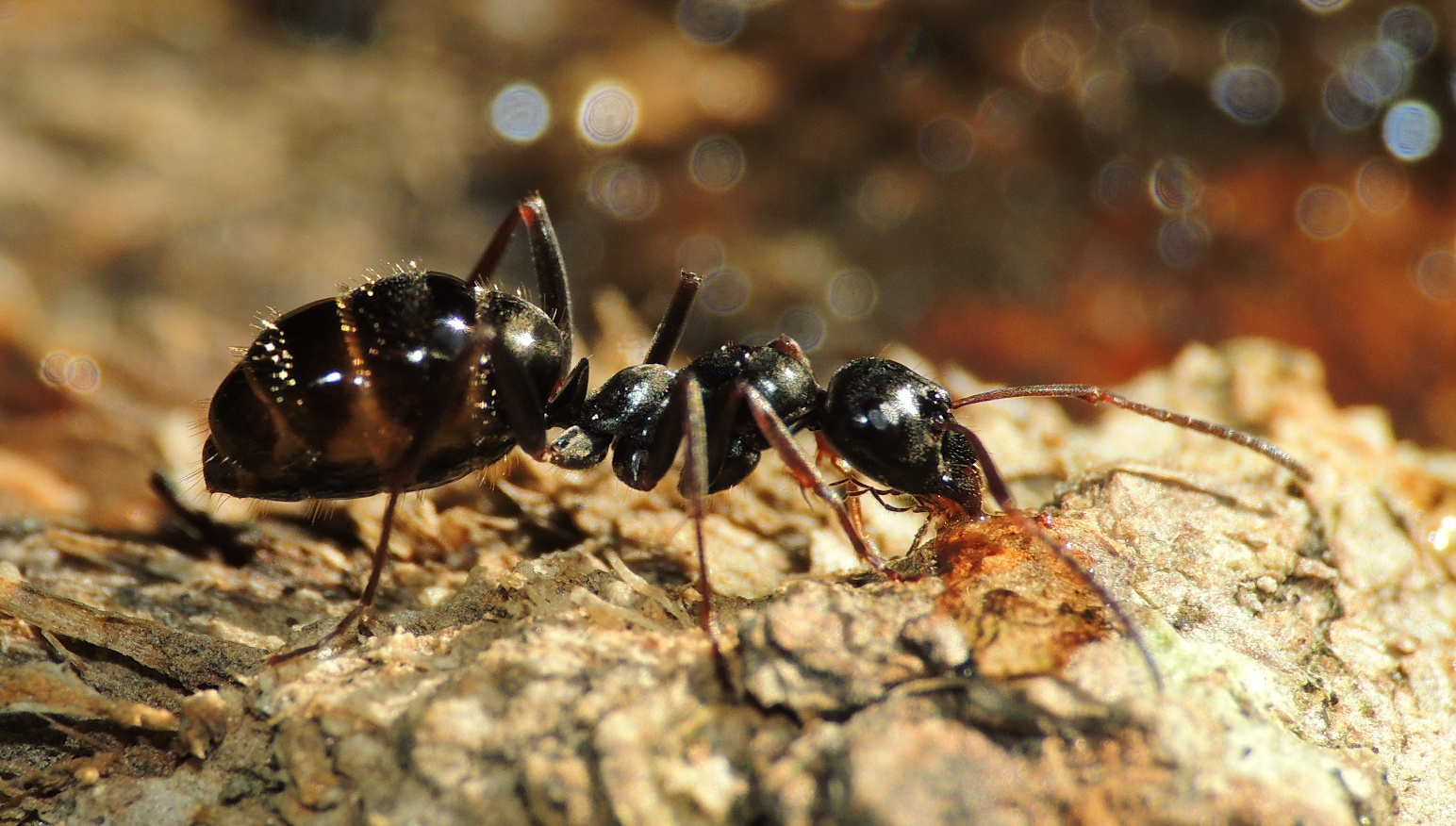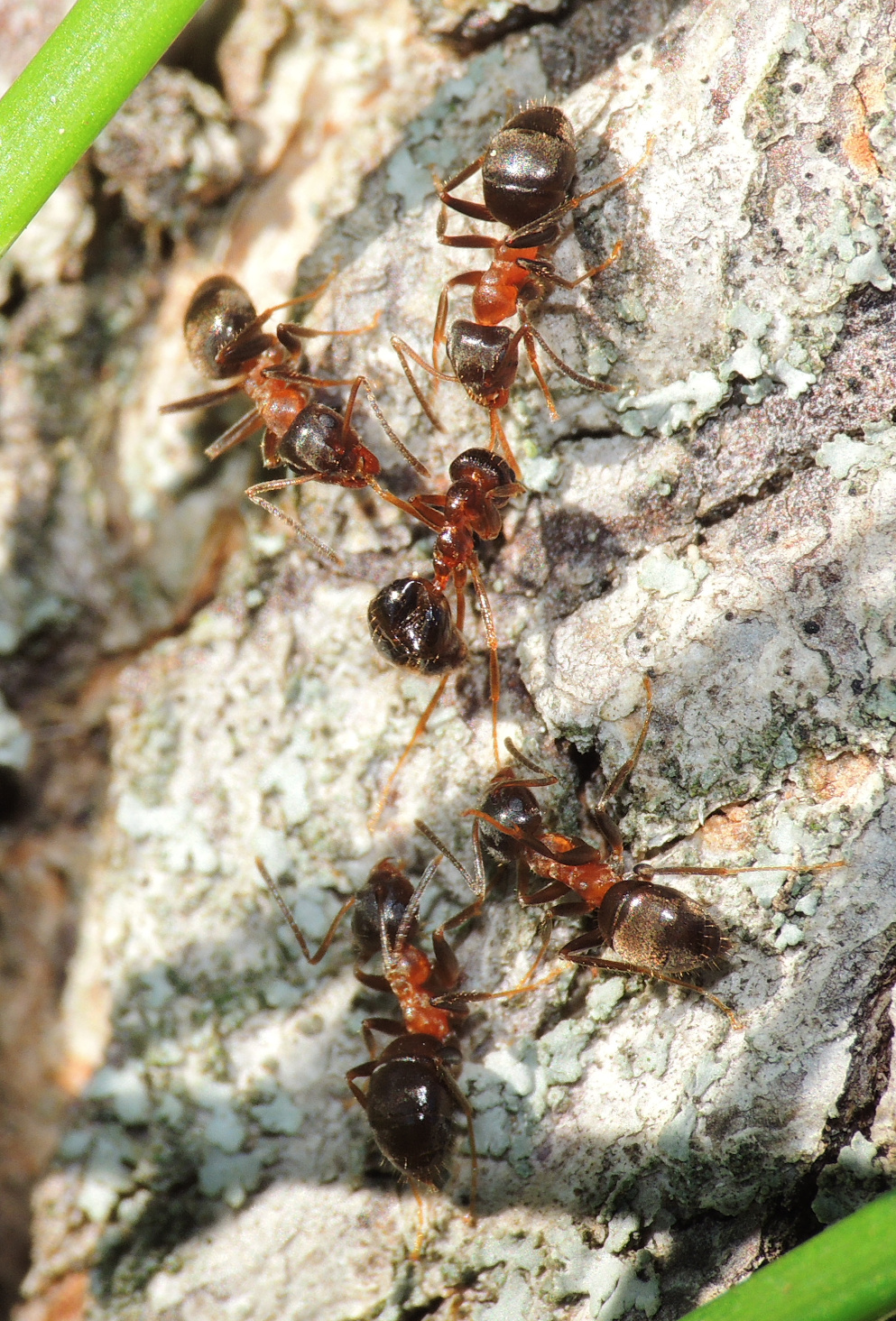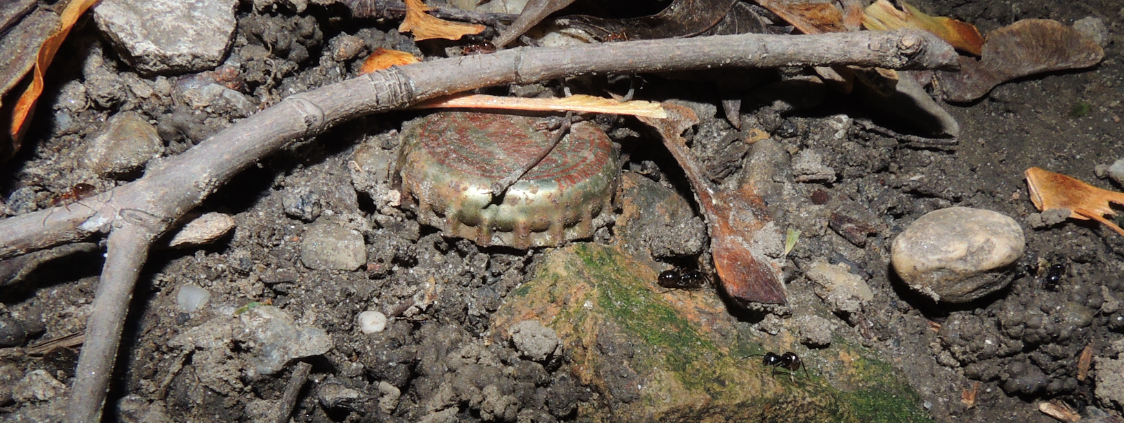 Formica cf. gagates (unscharf, links unten) und Prenolepis nitens (rechts oben)