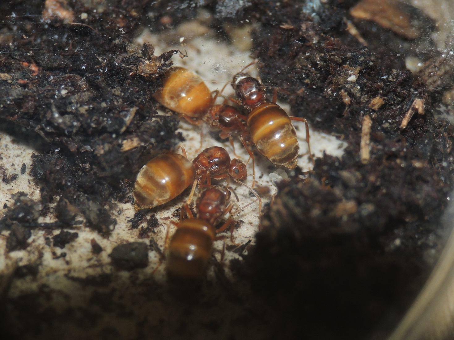 Gut, die Art kommt nur in wenigen Teilen Mitteleuropas vor. Ich glaube, dass es da sehr wenige Beobachter gibt. Ich hatte gestern nach langer Suche das Glück: Eine Königin im Nest; rasch in die Beobachtungsbox und ein Foto gemacht! Nicht spektakulär, aber sicher sehr selten: Sieht den Gynen v. F. fusca sehr ähnlich, diese haben deutlich weniger Pubeszenz als ihre Arbeiterinnen u. weisen auch oft eine stark schwarz-glänzende Körperoberfläche auf. Die Bilder sind leider nicht optimal geworden, bei der Hektik......