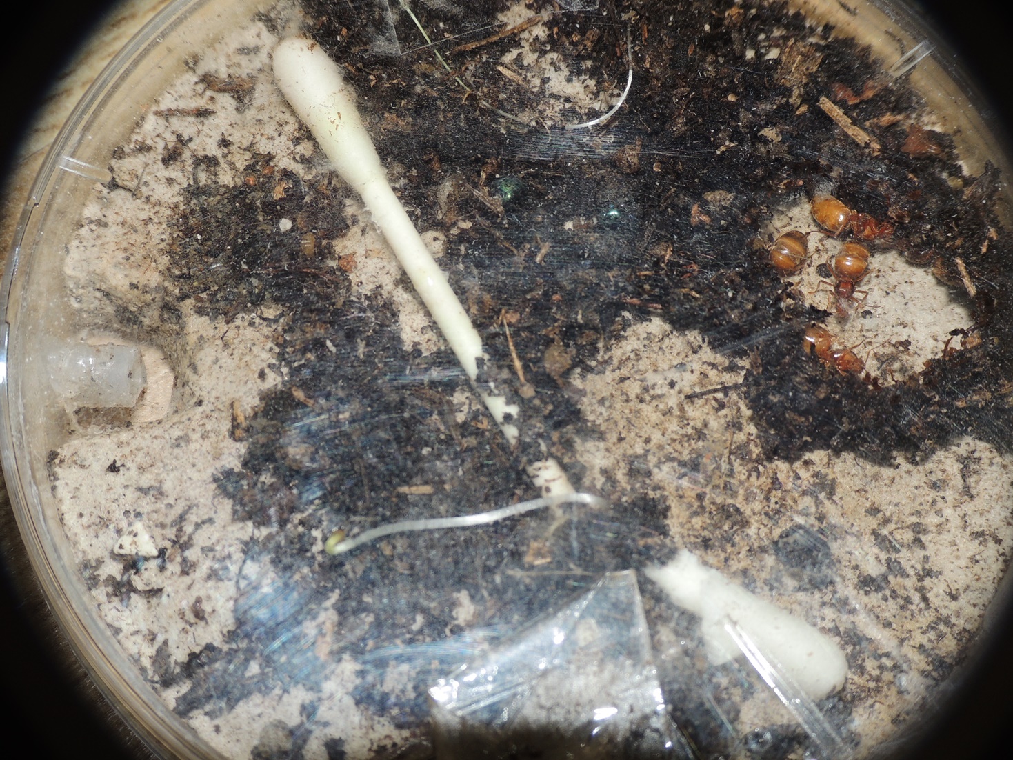Sohn Roman hat von einem Bio-Kollegen aus der Südsteiermark 2 Gynen v. Prenolepis nitens bekommen. Dort wurden sie nach dem Schwärmen gefunden, dieses findet im April - manchmal schon im März statt. Es gelang ihm bereits eine erste Arbeiterin aufzuziehen. Ich habe auch eine Gyne mit Brut bekommen, bei mir gibt es noch keinen Nachwuchs.