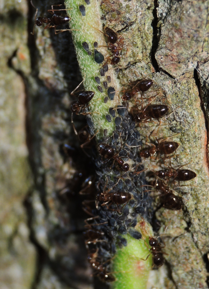 Prenolepis nitens und Formica (Serviformica) gagates sind 2 Arten, die meines Wissens in D nicht vorkommen. Die Bilder hat mein Sohn von einer Exkursion in der südlichen Steiermark mitgebracht. Prenolepis ist eine Art, die auch sog. "Honigtöpfe" ausbildet, also Repleten, welche die Nahrung für die Gemeinschaft speichern. Sie laufen in Massen auf Bäume um den Honigtau der Läuse zu ernten.