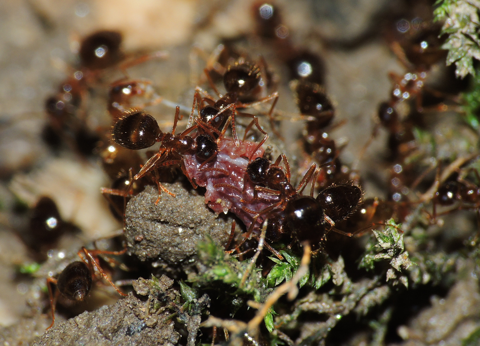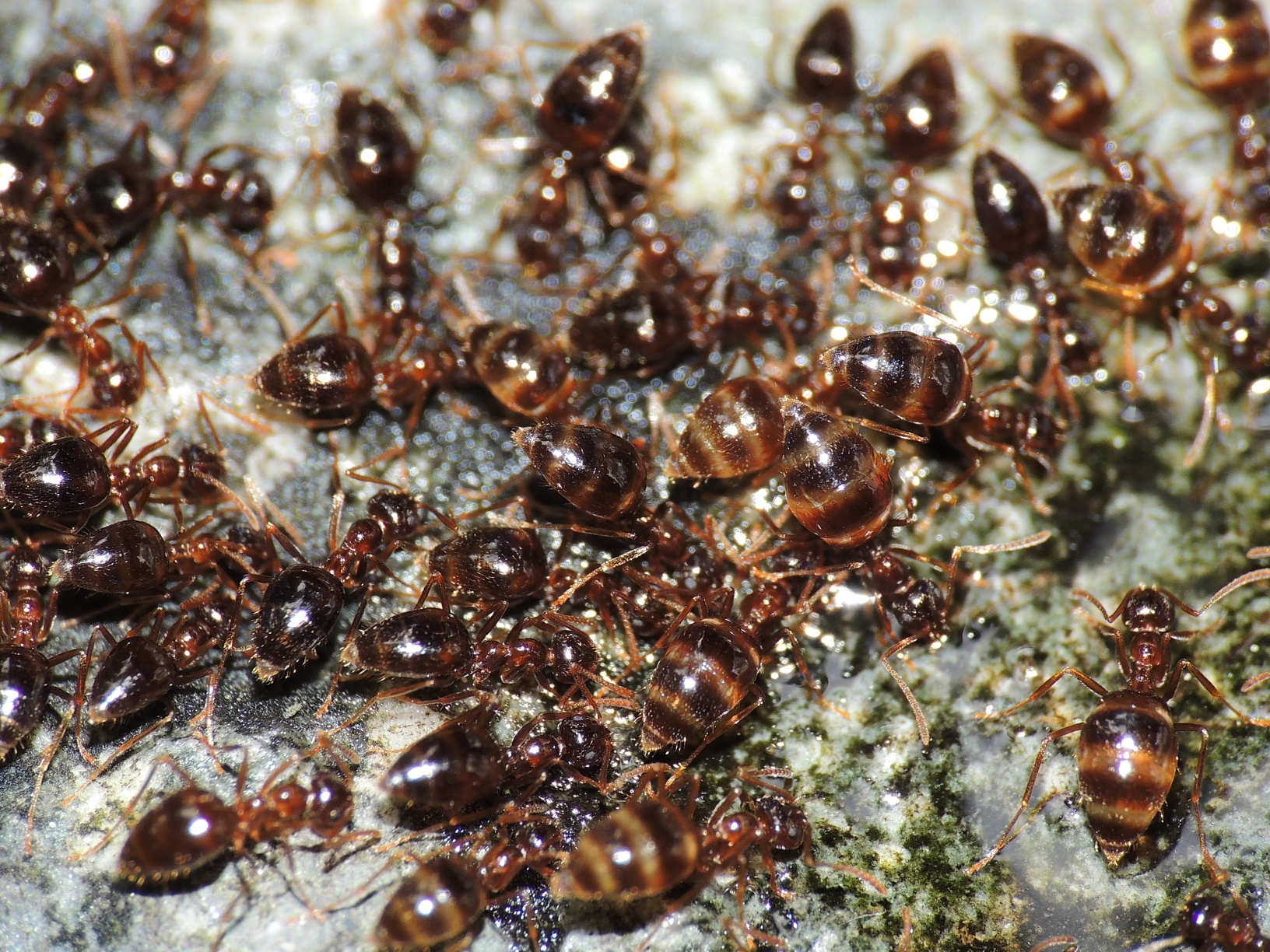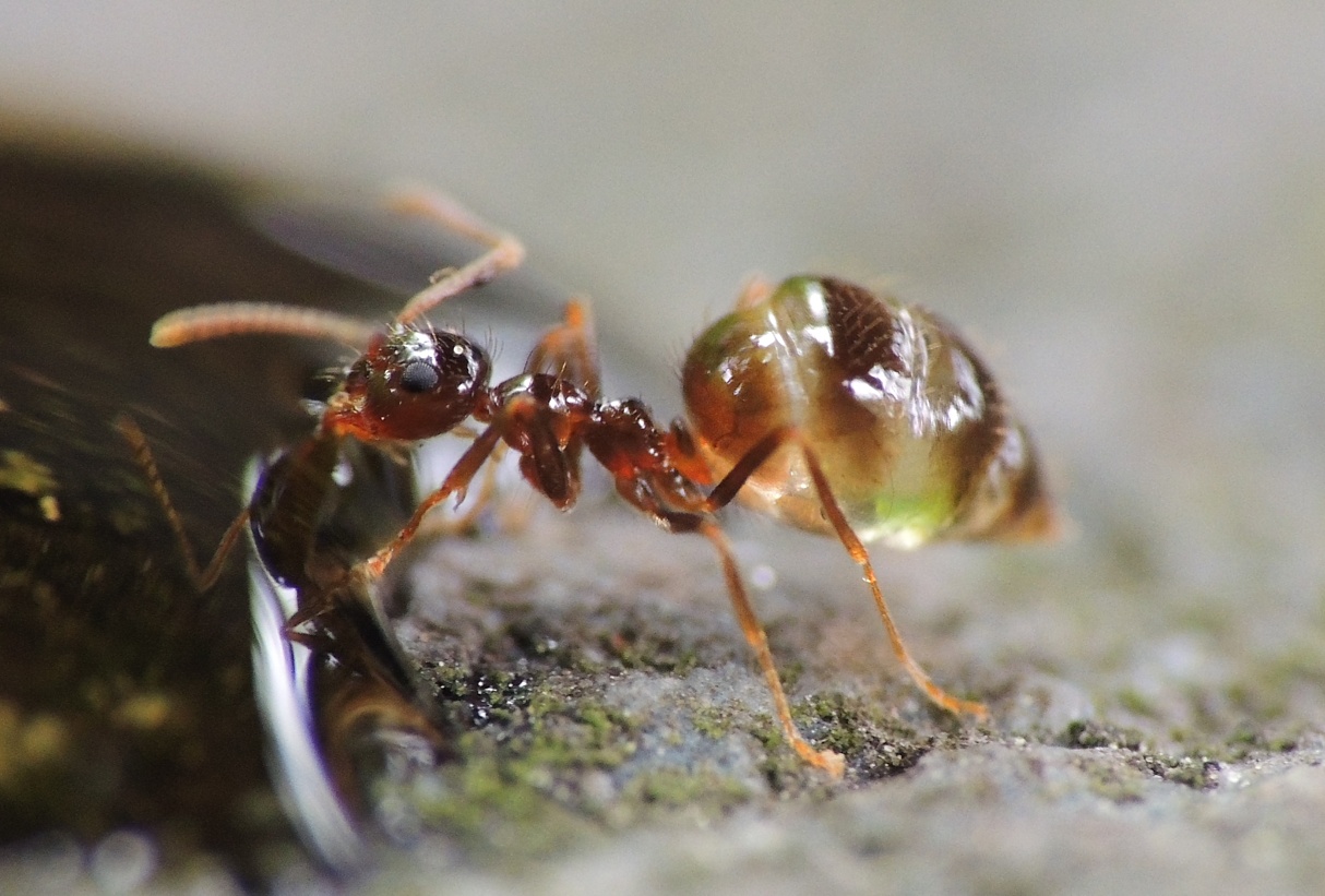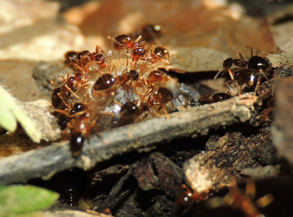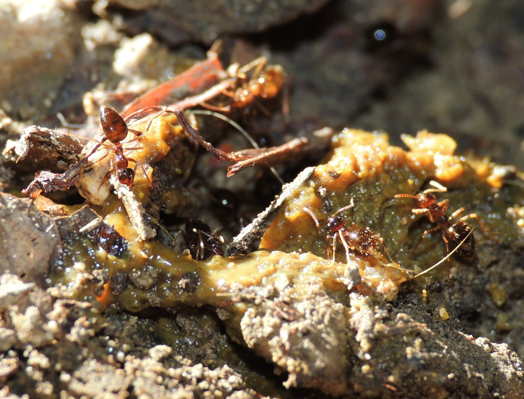 Im folgenden Foto nibbeln Arbeiterinnen von P. nitens an einem Schleim, bei dem ich nicht weiß um was genau es sich handelt. Es könnte ein Schleimpilz sein. Sind die Ameisen nur hinter Flüssigkeit her, oder werden hier auch andere Nährstoffe aufgenommen?