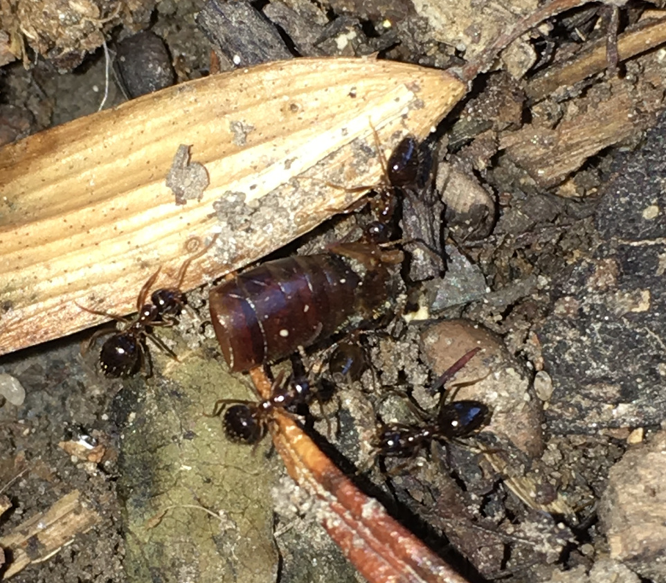 Die letzten zwei Tage waren hier in Wien regnerisch feucht und zahlreiche Regenwürmer verendeten an der Oberfläche. Regenwürmer sind derzeit eine wesentliche Nahrungsquelle für P. nitens. Die Würmer werden von den Arbeiterinnen zerlegt (https://www.youtube.com/watch?v=ZL2Z4oemEEY&t=4s) und die kleinen Häppchen werden ins Nest eingetragen. Die Arbeiterinnen sind hier ziemlich gründlich und tragen sogar den Darminhalt vom Wurm ins Nest: