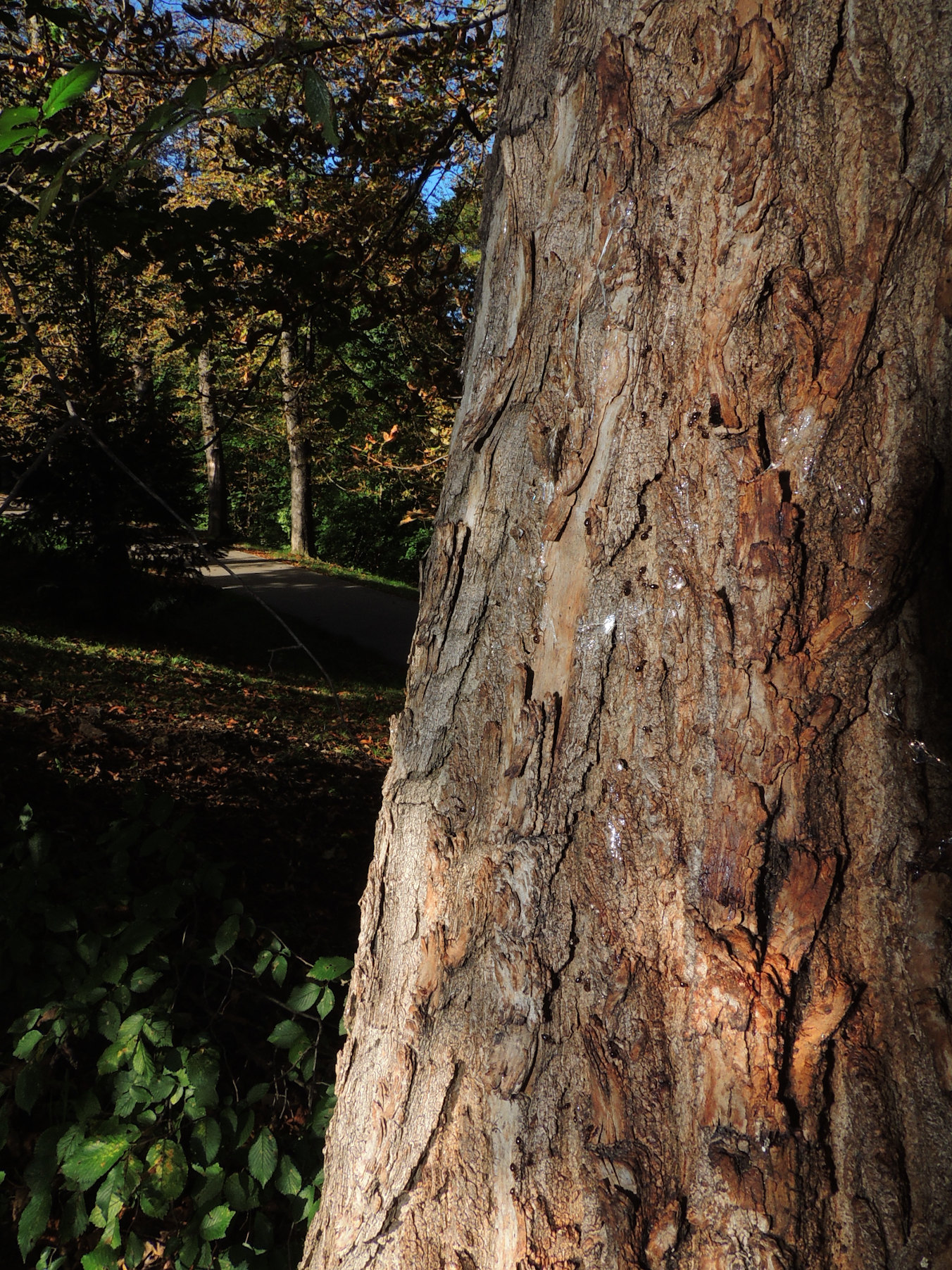 Derzeit besteigt P. nitens immer noch Ahorn Bäume zum Einsammeln von Honigtau; Rosskastanien Blätter sind schon ziemlich welk.