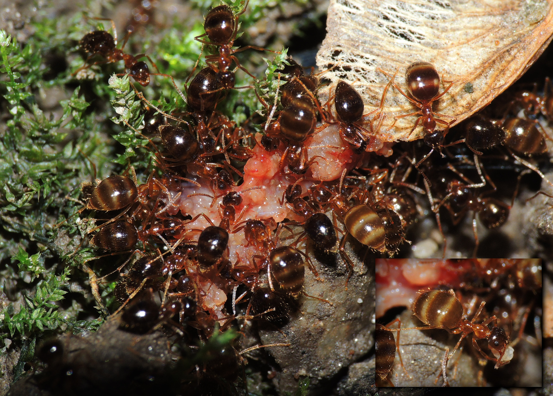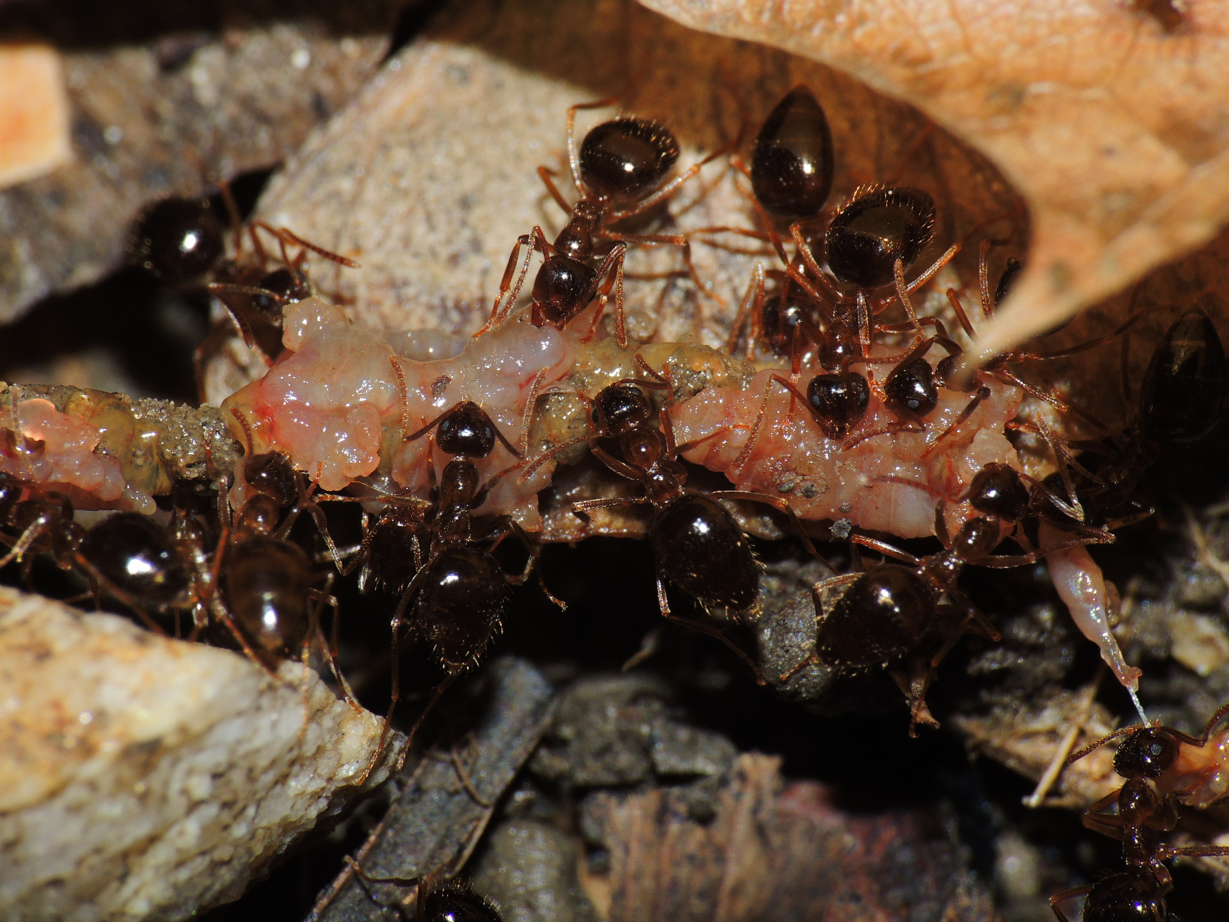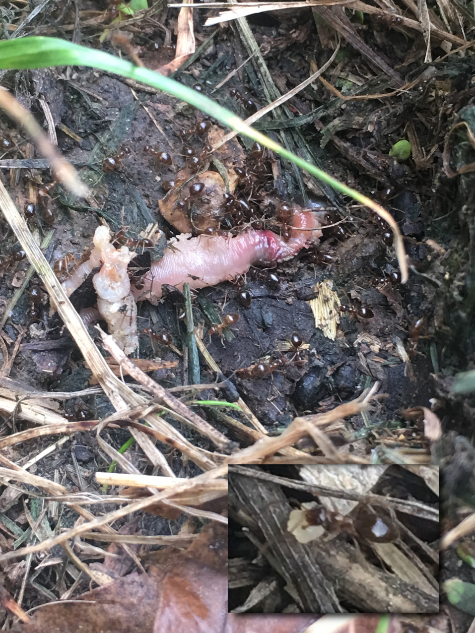 P. nitens zwerlegen Regenwurm "Kadaver"; rechts unten, Ausschnitt eines anderen Fotos: Ameise mit Teil des Regenwurms