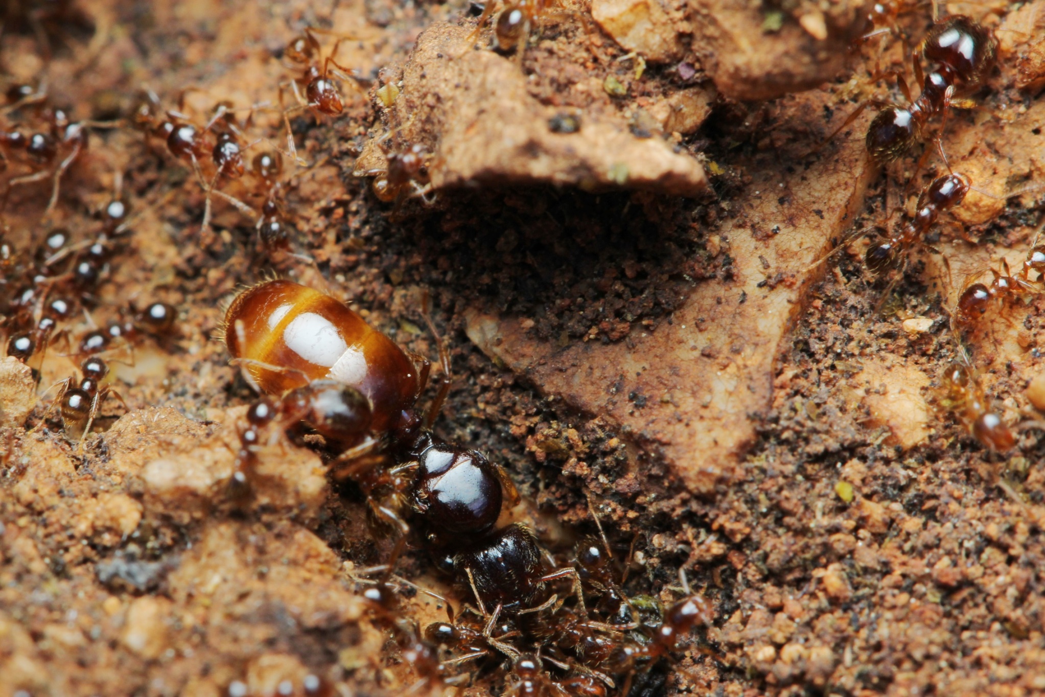 Ein Nest braun gefärbter Individuen mit Brut + Ameisengrille!