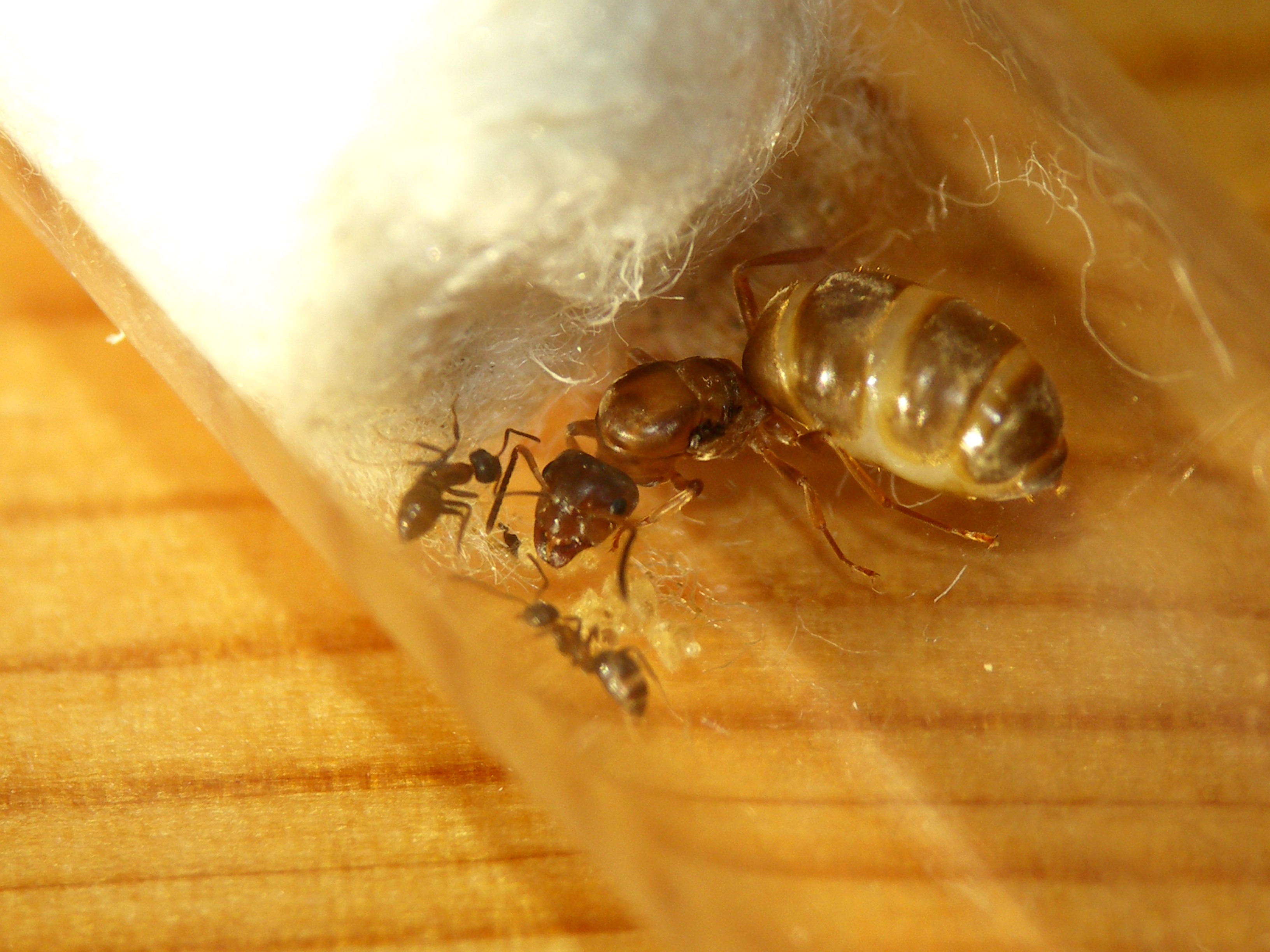 Gyne in der Beobachtungsbox. Sie wurde aus einem Blumentopf geholt u. daher klebt etwas Sand an der Gaster