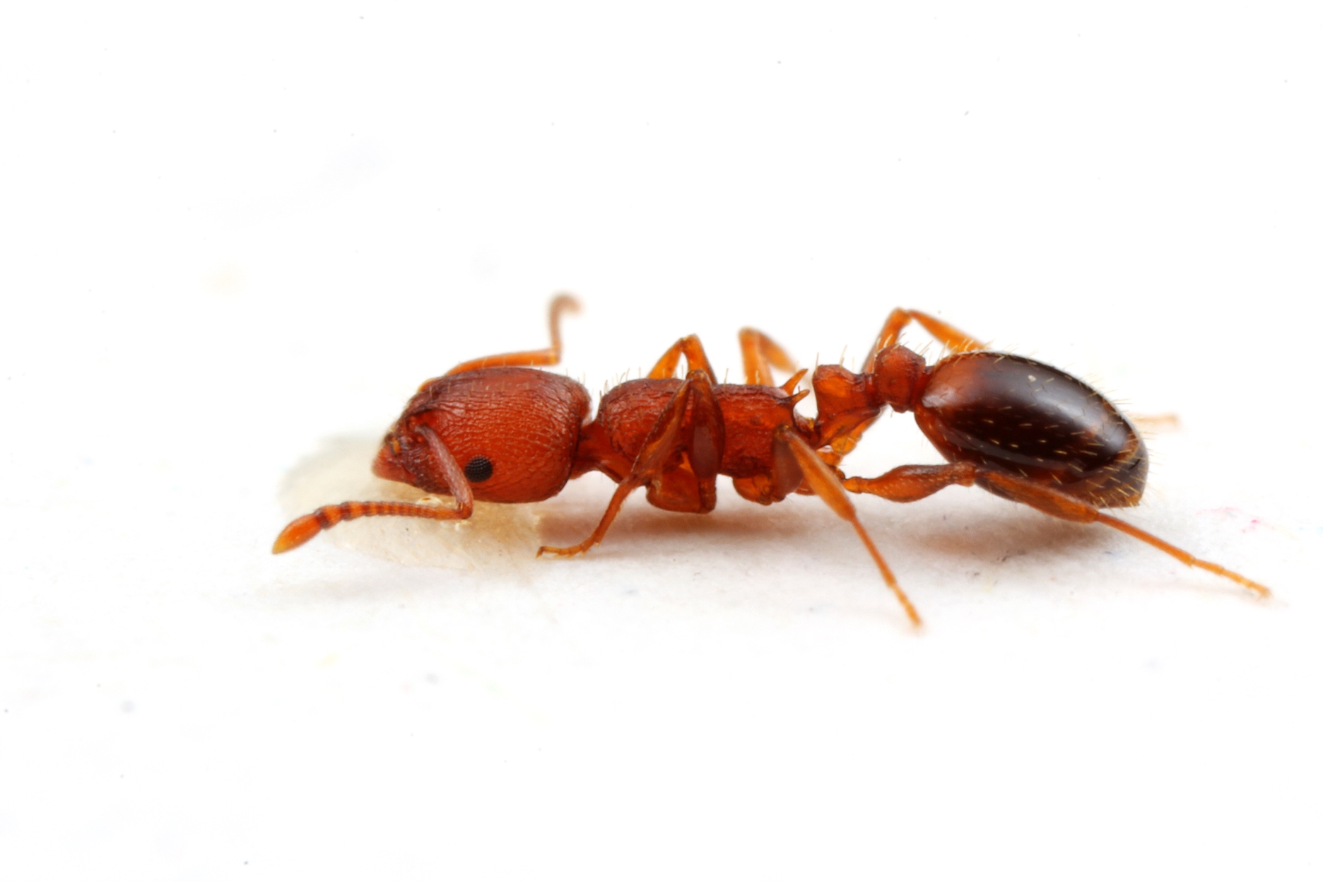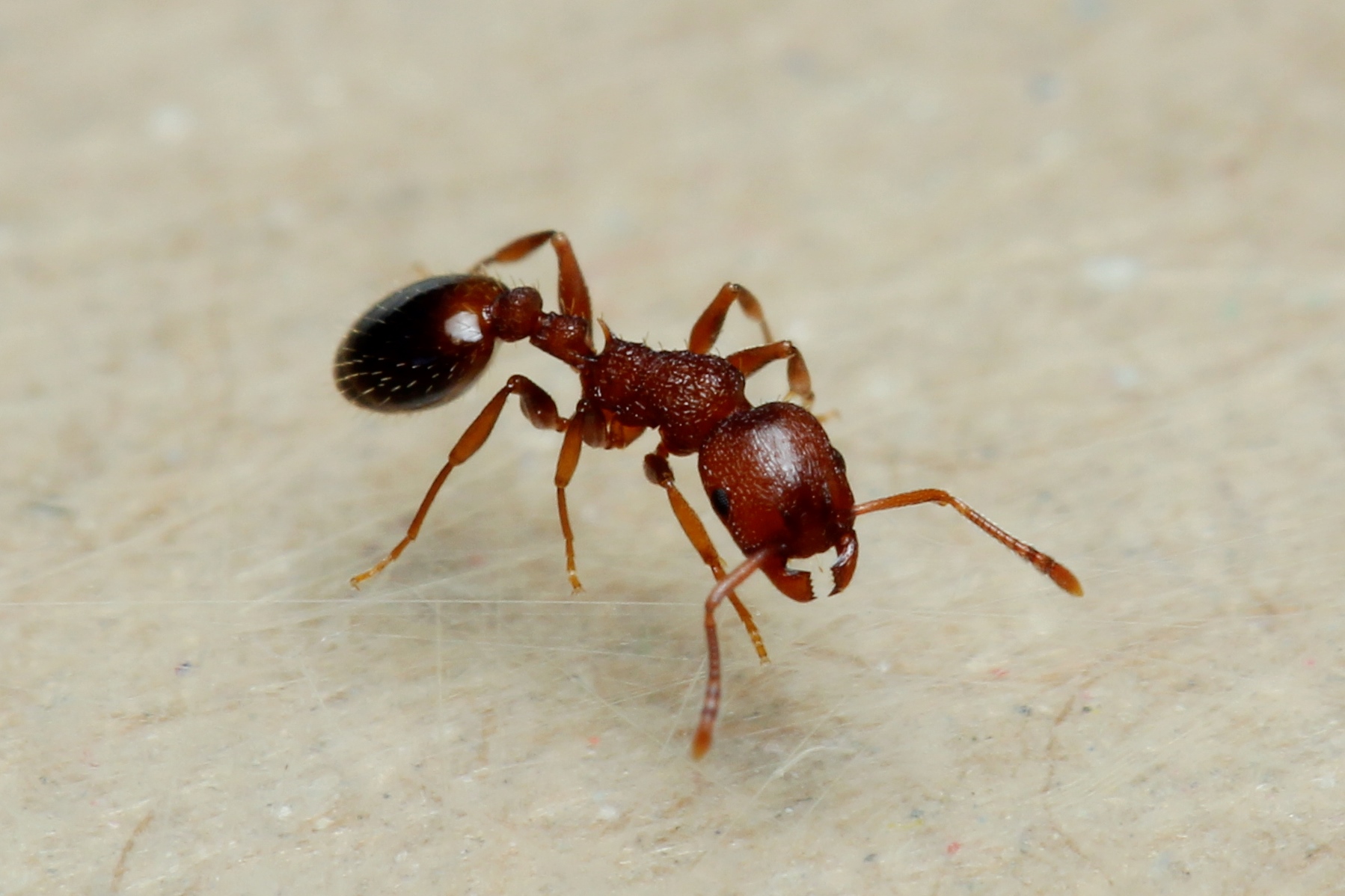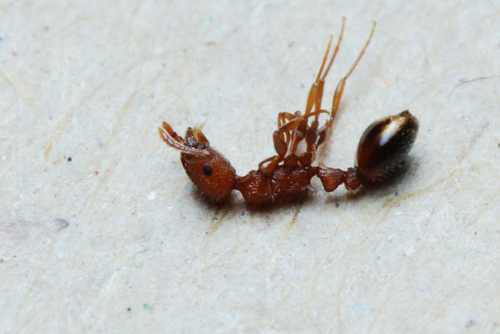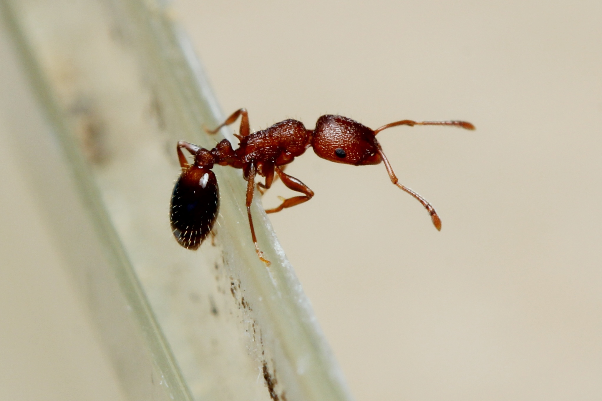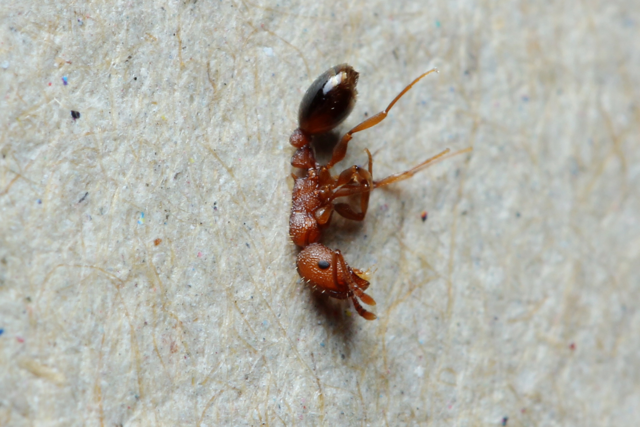 Für uns war Folgendes auffallend: Die Größe (in normaler Stellung 3,5 mm lang, das würde noch am ehesten f. Leptothorax acervorum reichen), die einheitliche Färbung v. Kopf, Mesosoma u. Stielchengliedern (SEIFERT, S. 120: "Kopf, Mesosoma, Stielchenglieder und Gasterbasis einfarbig gelblich braun."); in unserem Fall muss man wohl von dunkelrot od. rotbraun sprechen. Ihre dt. Bezeichnung ist übrigens "Hellbraune Schmalbrustameise"! Alles ein wenig verwirrend.....Der ventrale "Zahn" am Petiolus zeigt sich eher schildförmig und auch auf dem Postpetiolus ist ventral (unterseits) eine zahnförmige Ausbildung zu sehen.