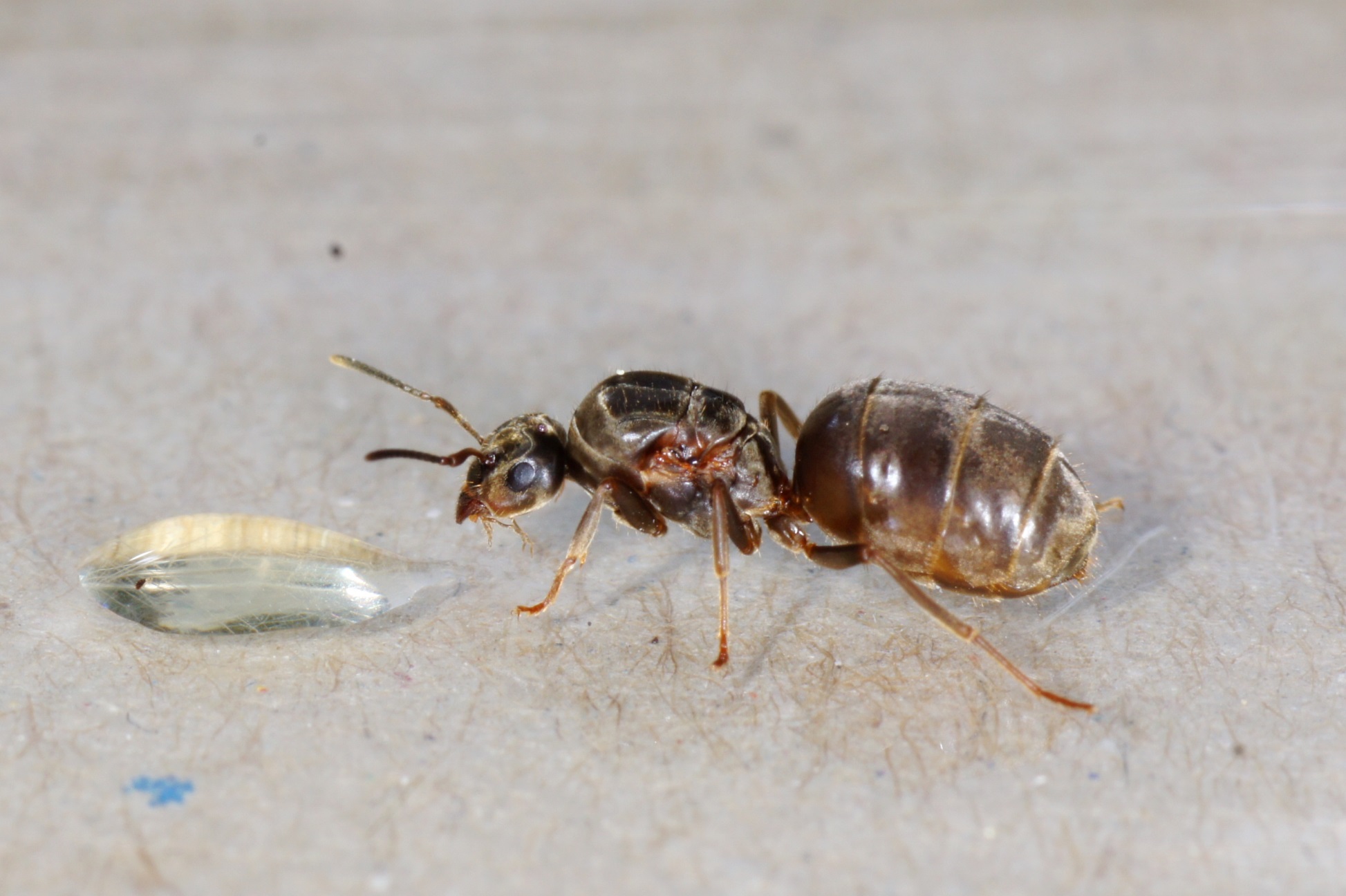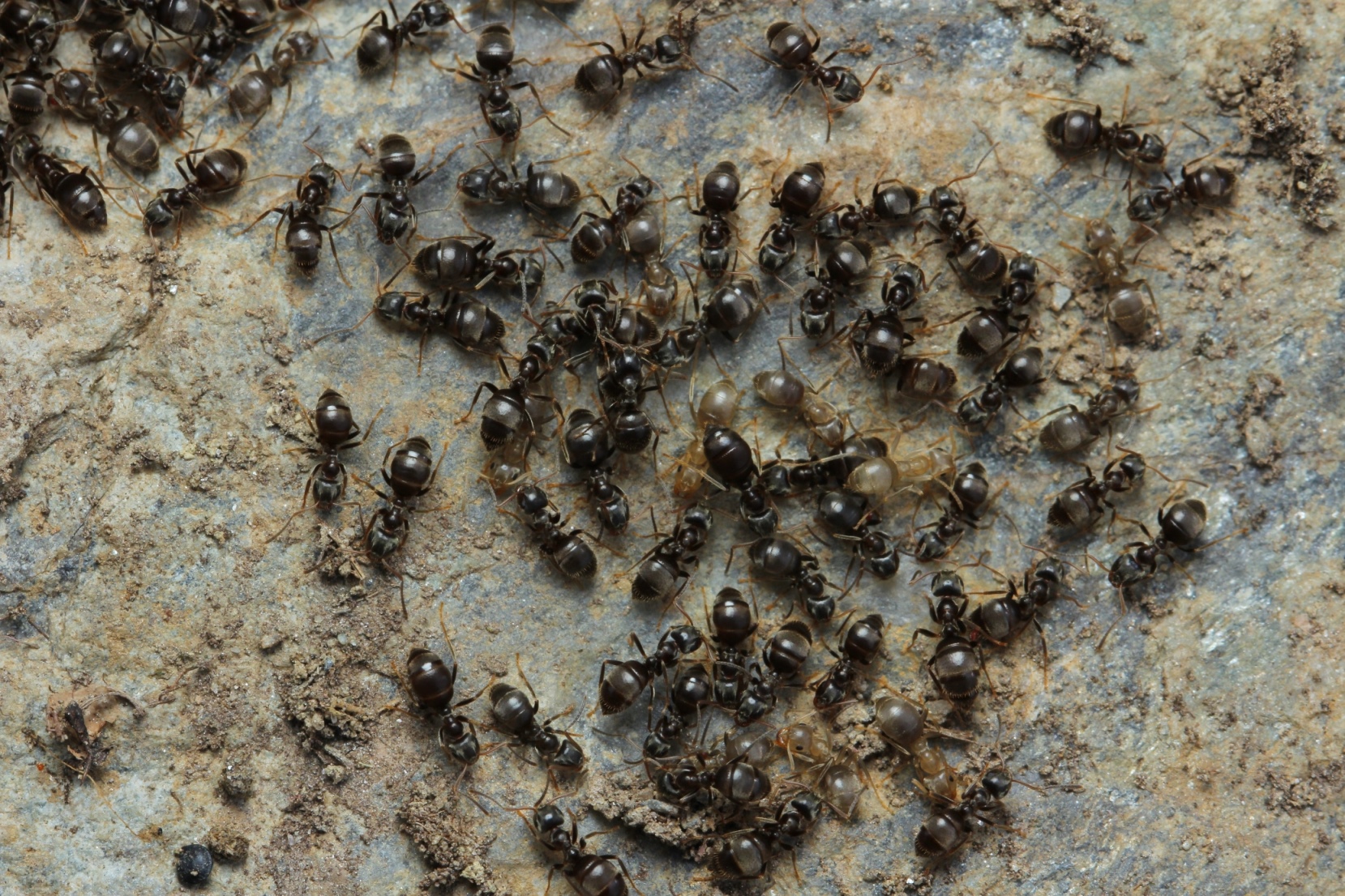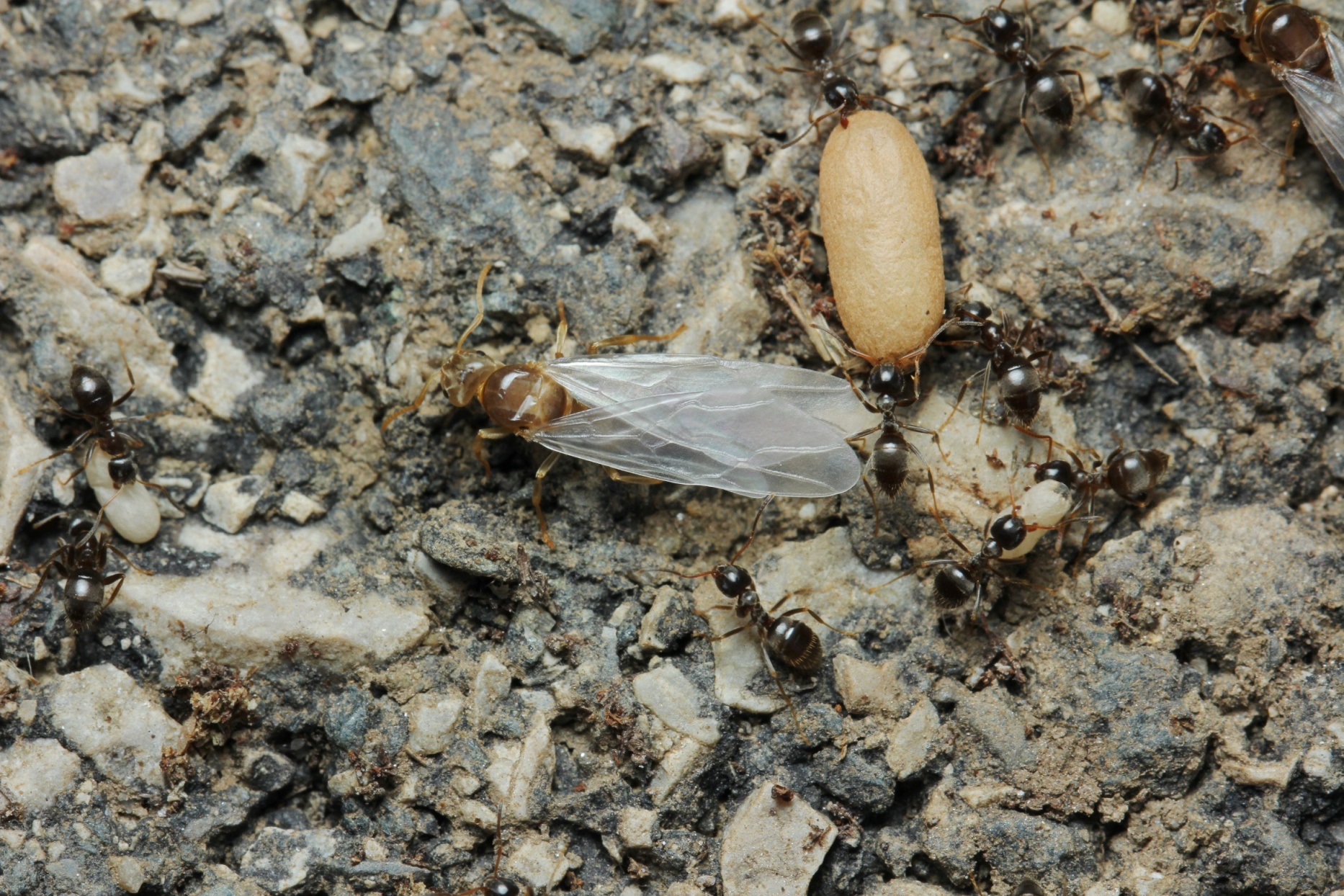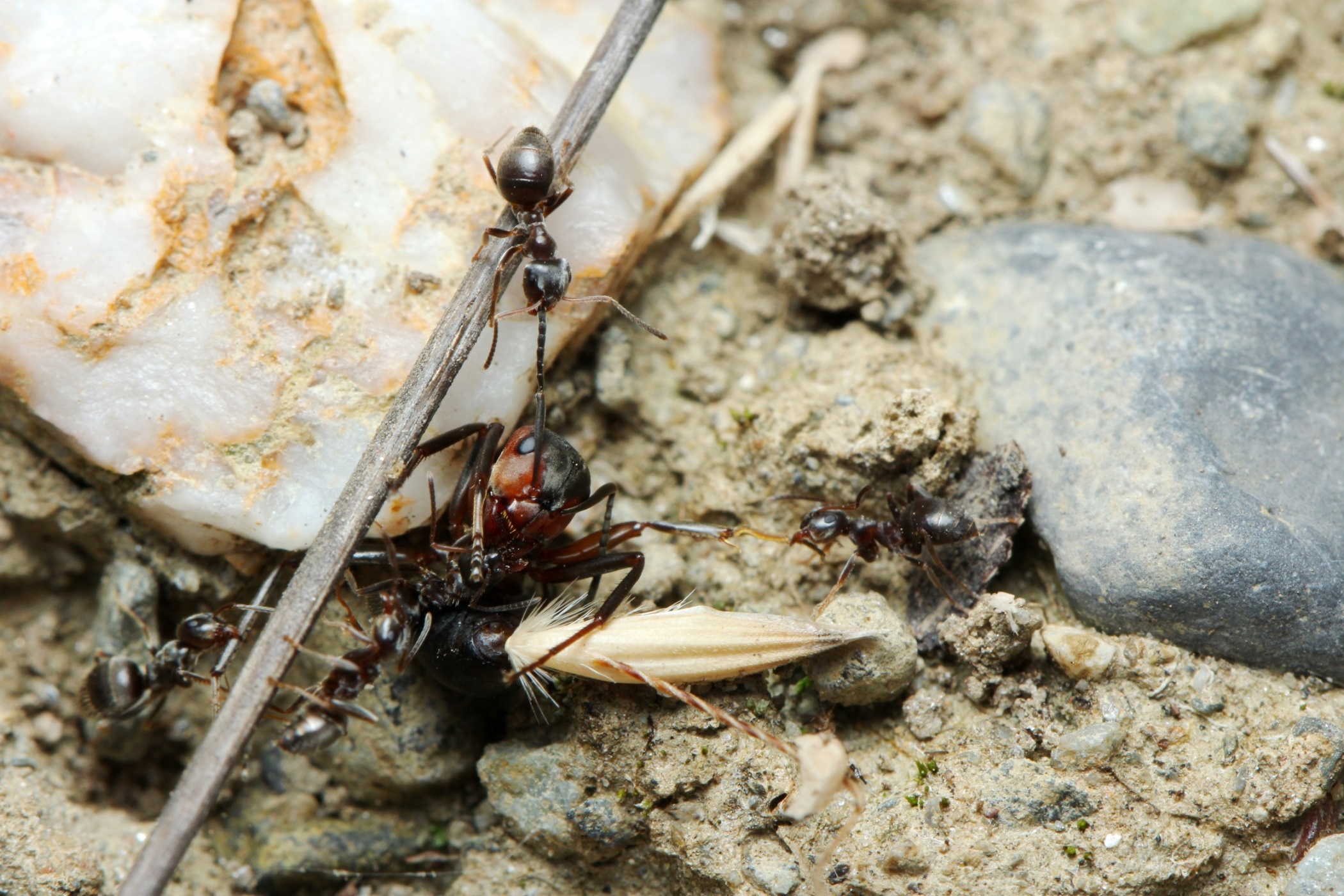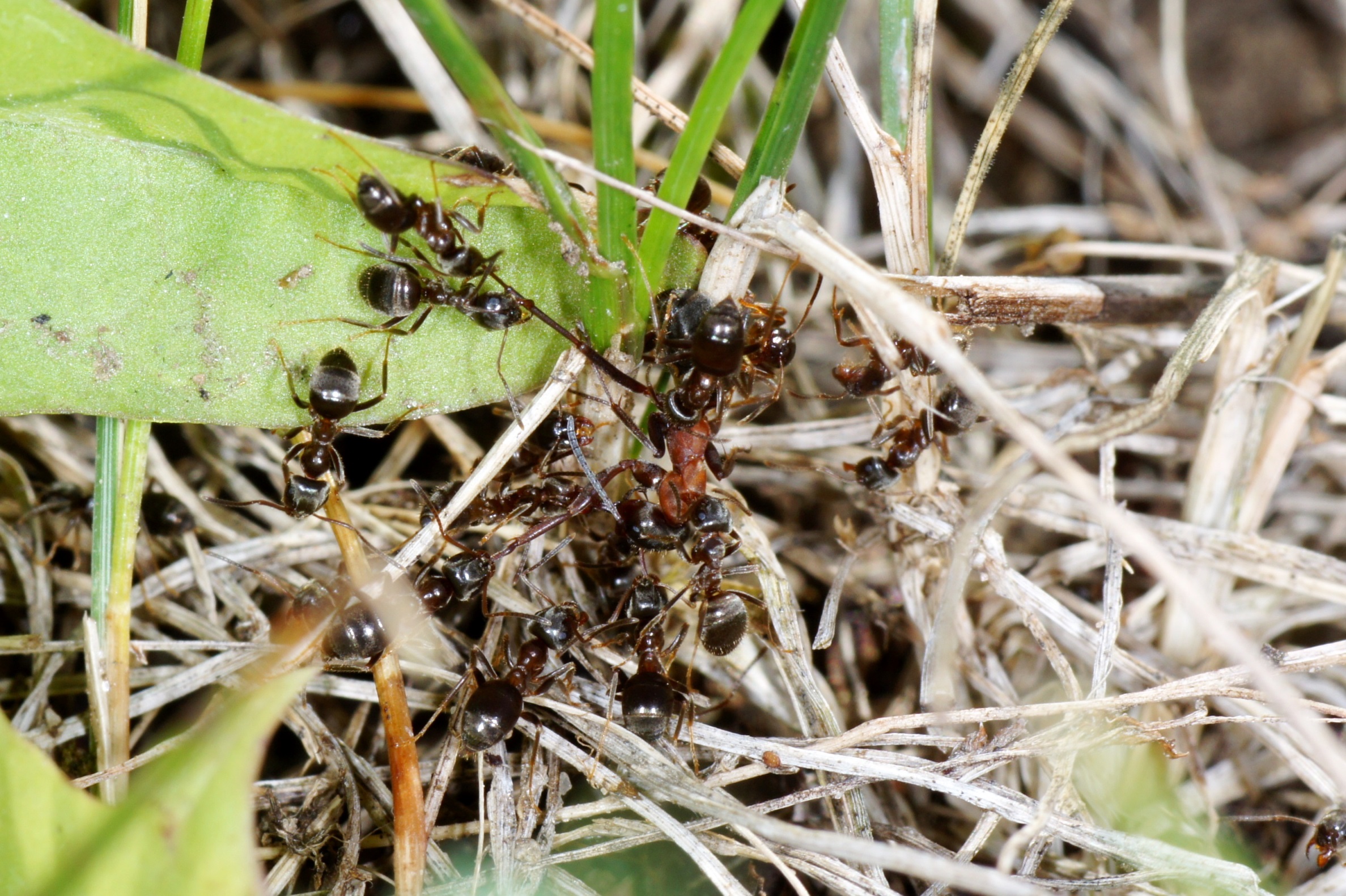 2. Starke Populationen greifen interspezifische Konkurrenten an und können sie vernichten. Mitunter kann man regelrechte Kriegszüge beobachten, die über etliche Meter Entfernung geführt werden. Myrmica spp., Serviformica spp. und sogar ein jüngeres Nest v. Manica rubida wurden im Garten schon vernichtet. Nur ein starkes Nest v. L. emarginatus konnte Parole bieten, ebenso kleinere, kryptisch lebende Arten wie Tetramorium sp. od. Solenopsis fugax.