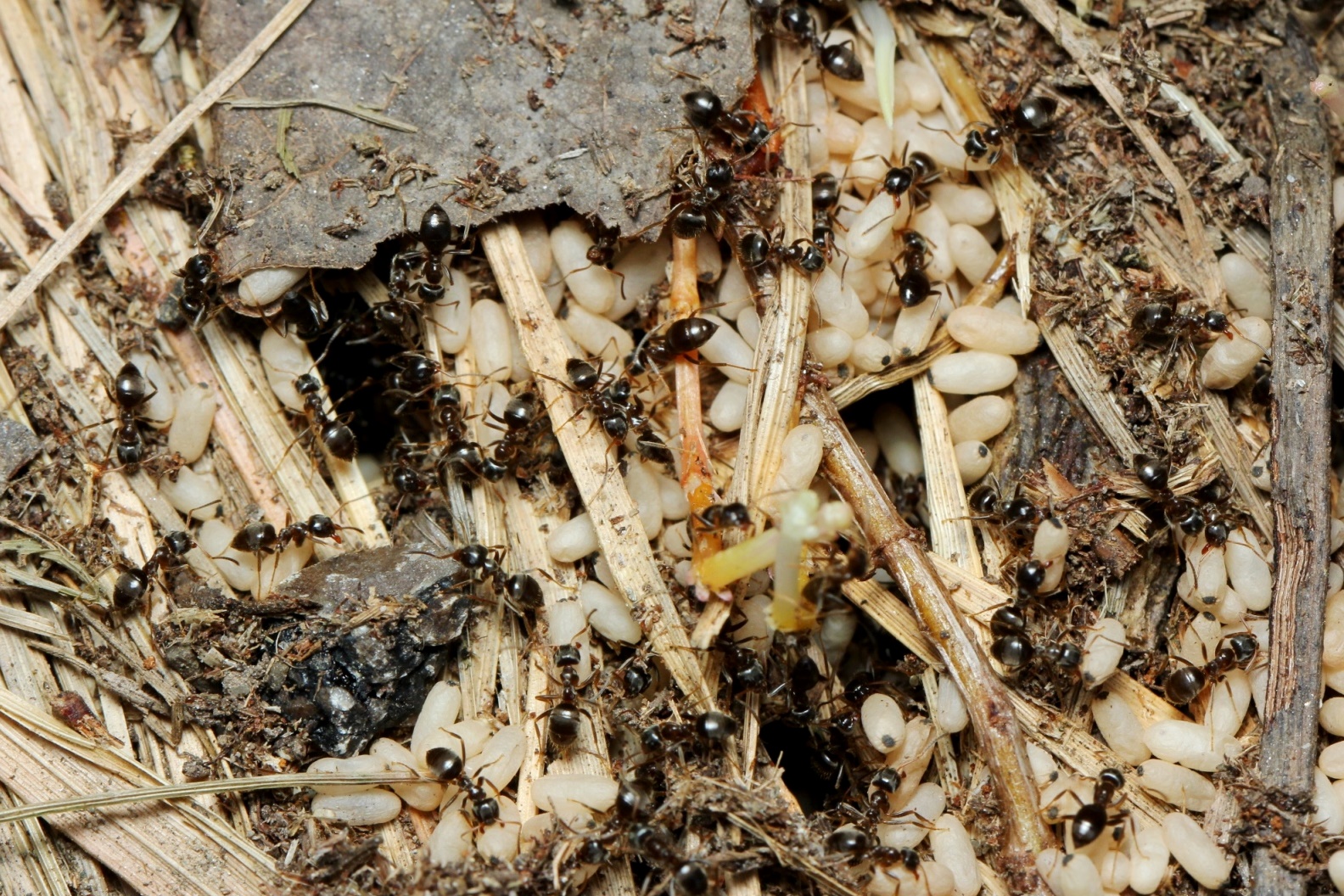 6. L. niger ist vorsichtig: Im Gegensatz zu anderen Arten konnte ich noch nie eine Nestverlagerung auf der Erdoberfläche beobachten. Wege werden bei feuchter Witterung oft mit einem Erdmantel umgeben. Die Königin hält sich stets in der Tiefe auf und ist kaum jemals in der oberen Bodenschichte zu finden. In Hochgrasfluren können Erdburgen bis zu 50 cm Höhe errichtet werden, dort können bis zu 50.000 Individuen leben (SEIFERT S. 275)