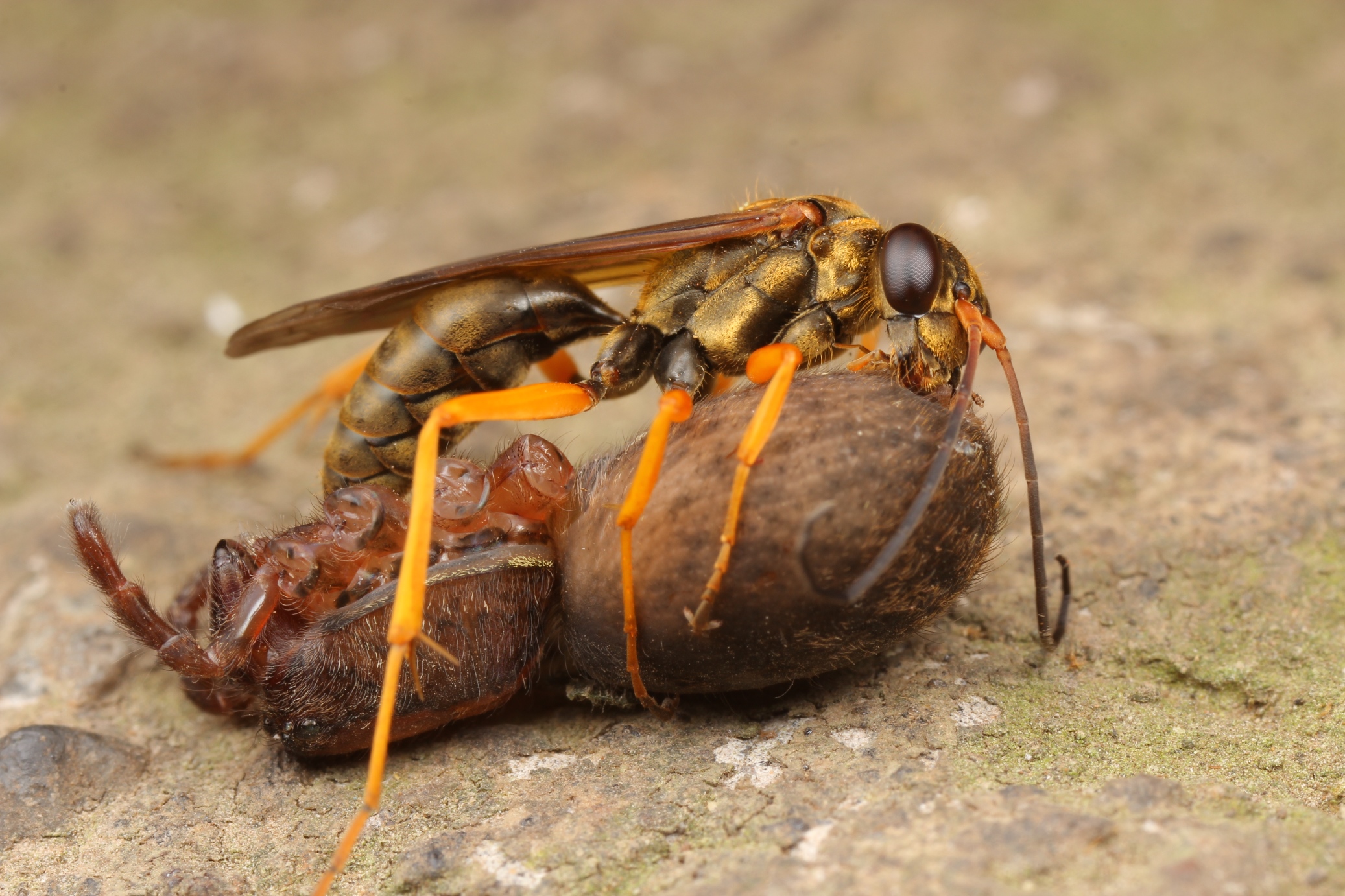 21.Einer solitären Wespe fiel eine Spinne zum Opfer; offenbar wurden dieser die meisten Beine amputiert