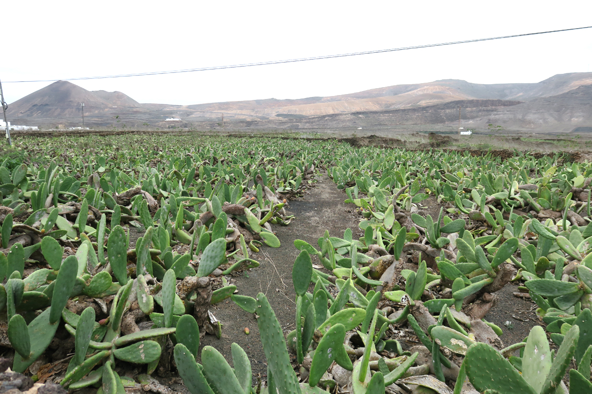 Unmittelbar neben dem Kaktusgarten sowie an mehreren anderen Stellen auf Lanzarote werden Opuntien angebaut, auf denen man