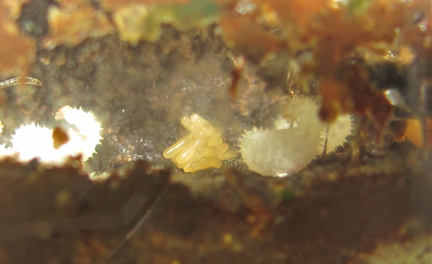 Die Königin stellte sich tot. Merhmals und so überzeugend, dass sich dachte, ich hätte sie irgendwie verletzt, zog das Tier seine Fühler und Beine an den Körper und legte sich leicht gekrümmt auf die Seite. Sobald ich das Insekt aber leicht mit der Federpinzette berührte, machte es sich blitzschnell auf und wechselte in eine andere Ecke des Behälters, wo es sich abermals tot stellte. Keine der Arbeiterinnen ahmte das Verhalten nach. Sie blieben stehts auf allen Sechsen.