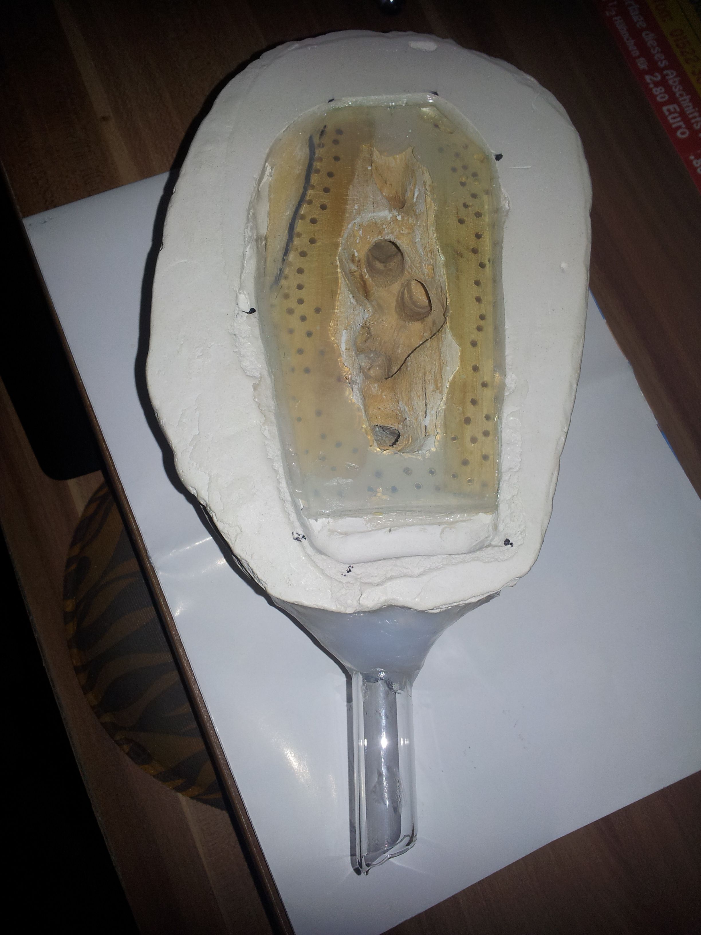 Leider habe ich von dem Ergebnis kein Foto aber ähnlich wie die Spachtelmasse blätterte an Stellen mit einer dünnen Schicht der Gips ab. Zu Festigung umhüllte ich das ganze dann mit einer Faser verstärkten Spachtelmasse Pufamur SH 45